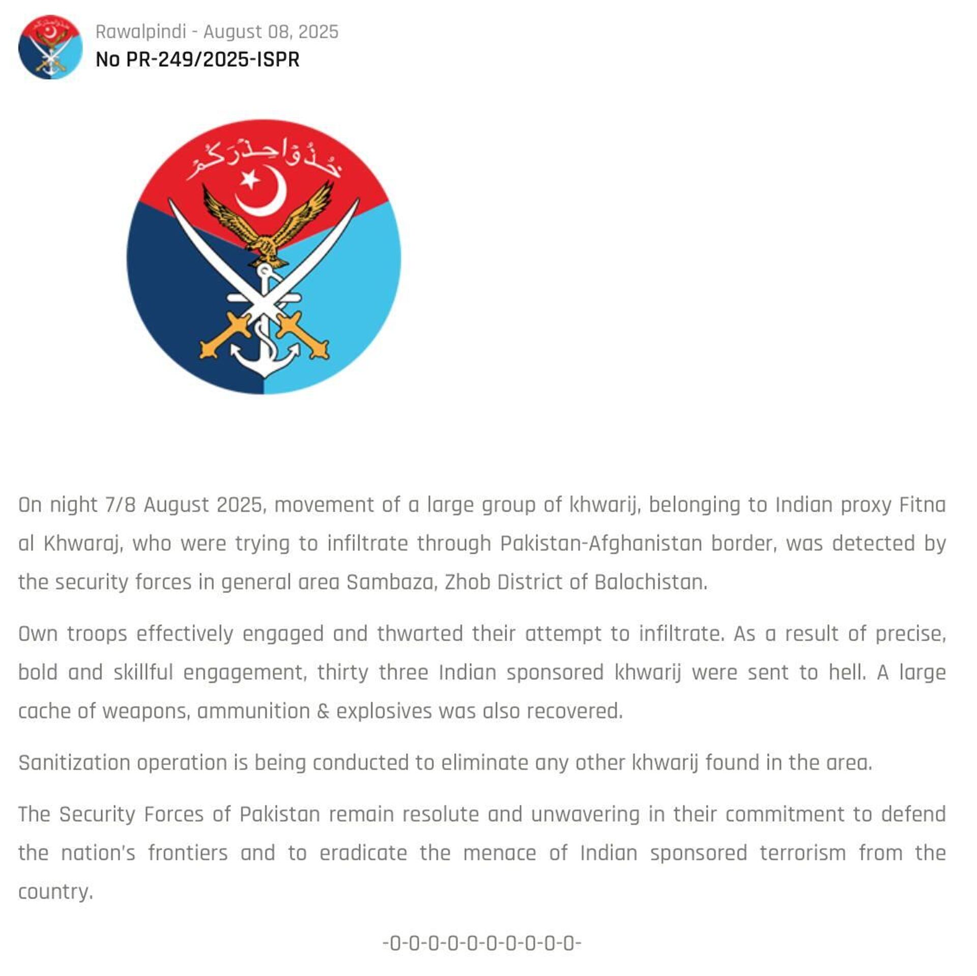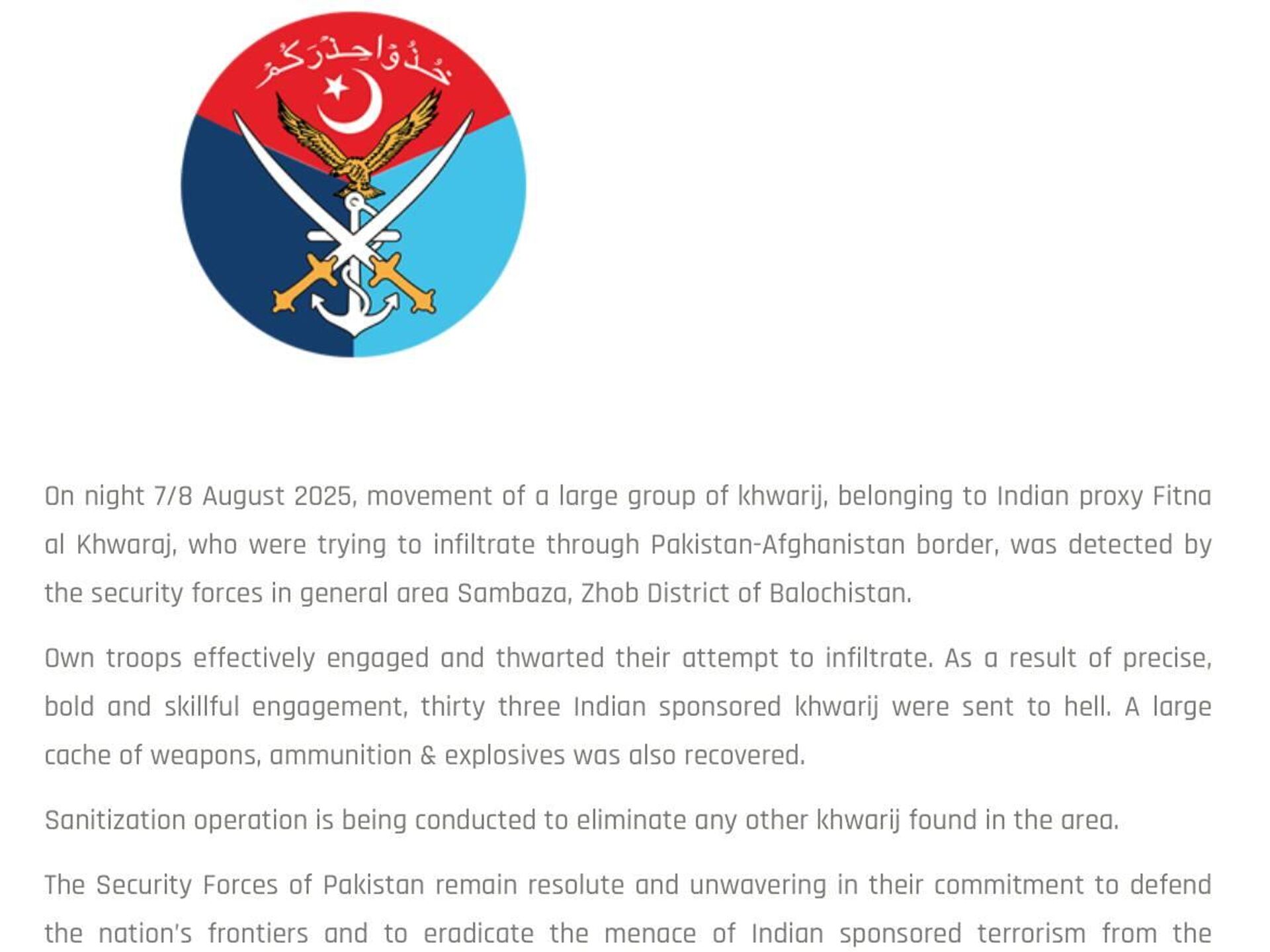 «در شب 7 تا 8 اگوست 2025، حرکت یک گروه بزرگ از خوارج وابسته به شبکه فتنه الخوارج که قصد نفوذ از مرز پاکستان-افغانستان را داشتند، از سوی نیروهای امنیتی پاکستان در منطقه «سامبازا» از منطقه شهر ژوب در بلوچستان شناسایی شد».
