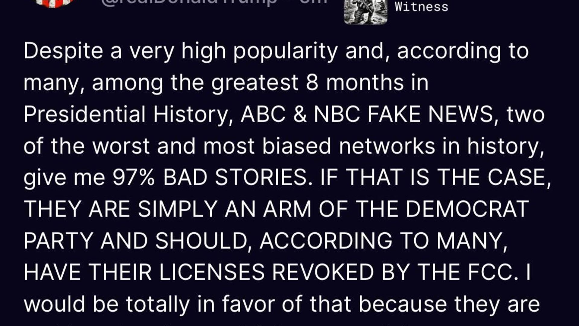 🟠رئیس جمهور امریکا شبکههای ABC و NBC را به «تولید اخبار جعلی» متهم کرده و خواستار لغو مجوز پخش این دو کانال شد. وی گفت که این شبکهها از او انتقاد میکنند و منافع حزب دموکرات را ترویج میدهند.
