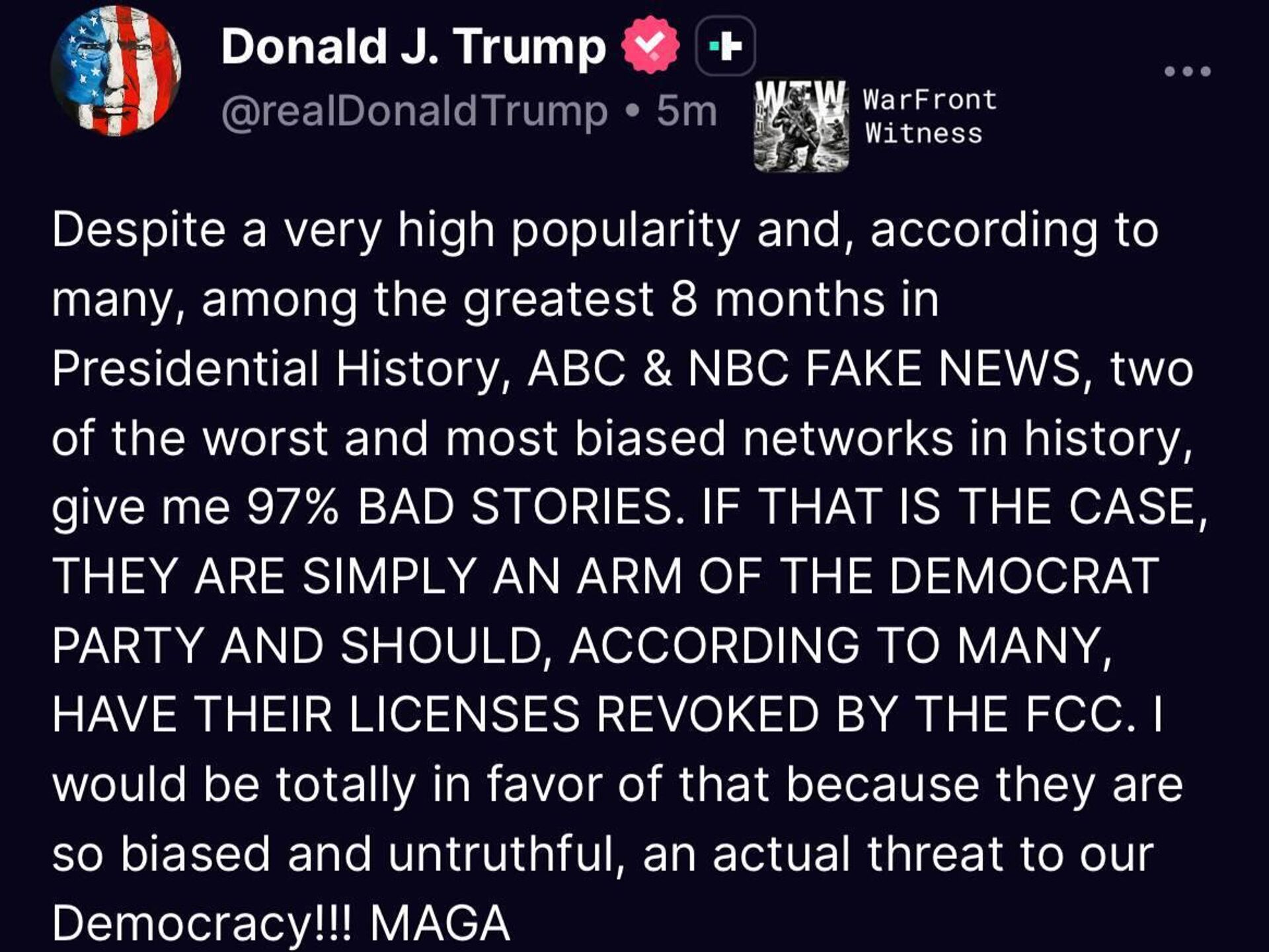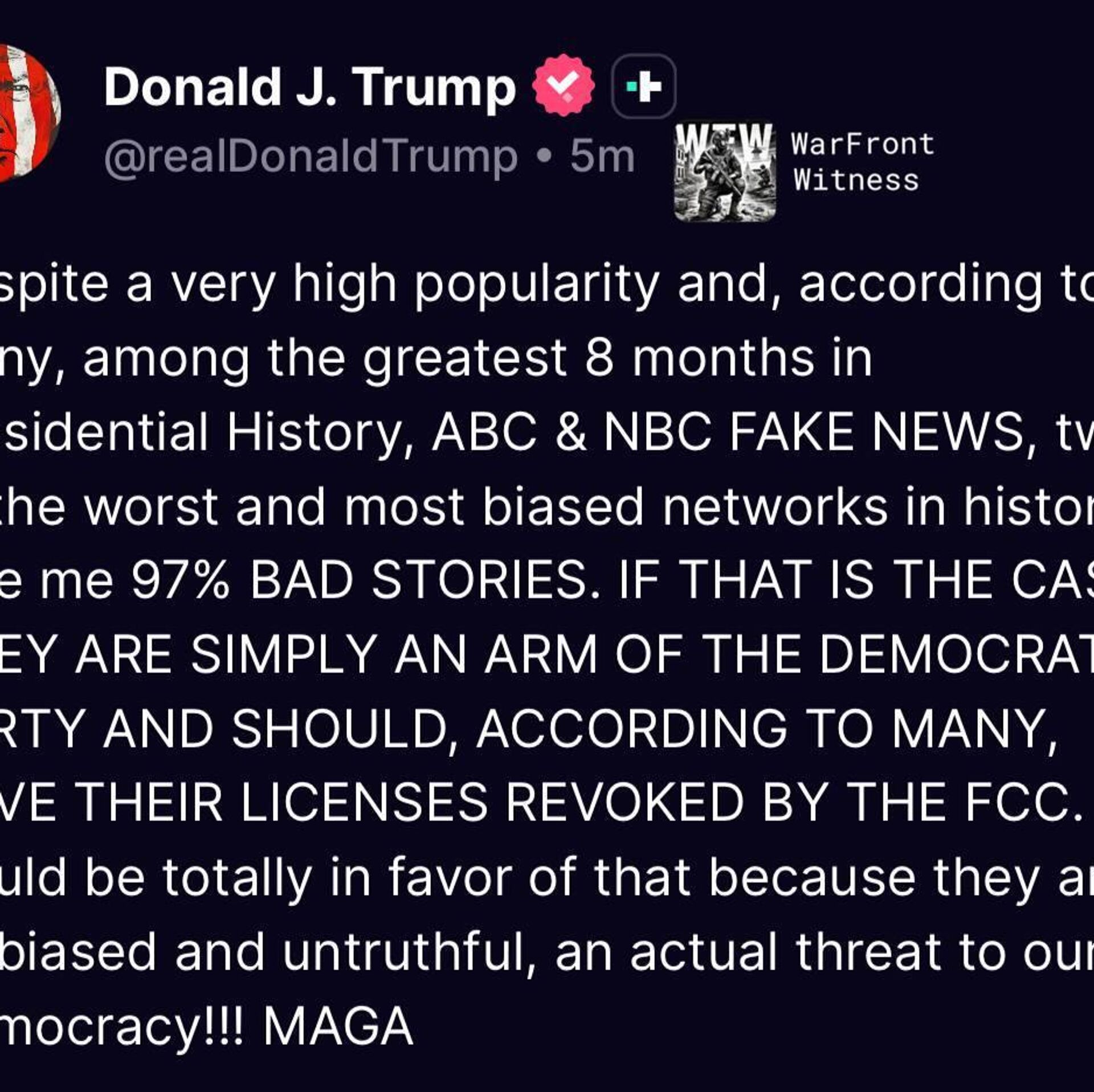 ⭕ترامپ خواستار لغو مجوز پخش برنامههای شبکههای ABC و NBC شد