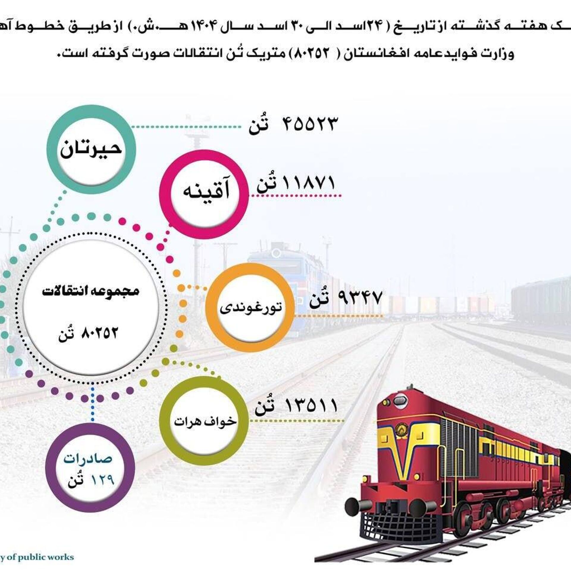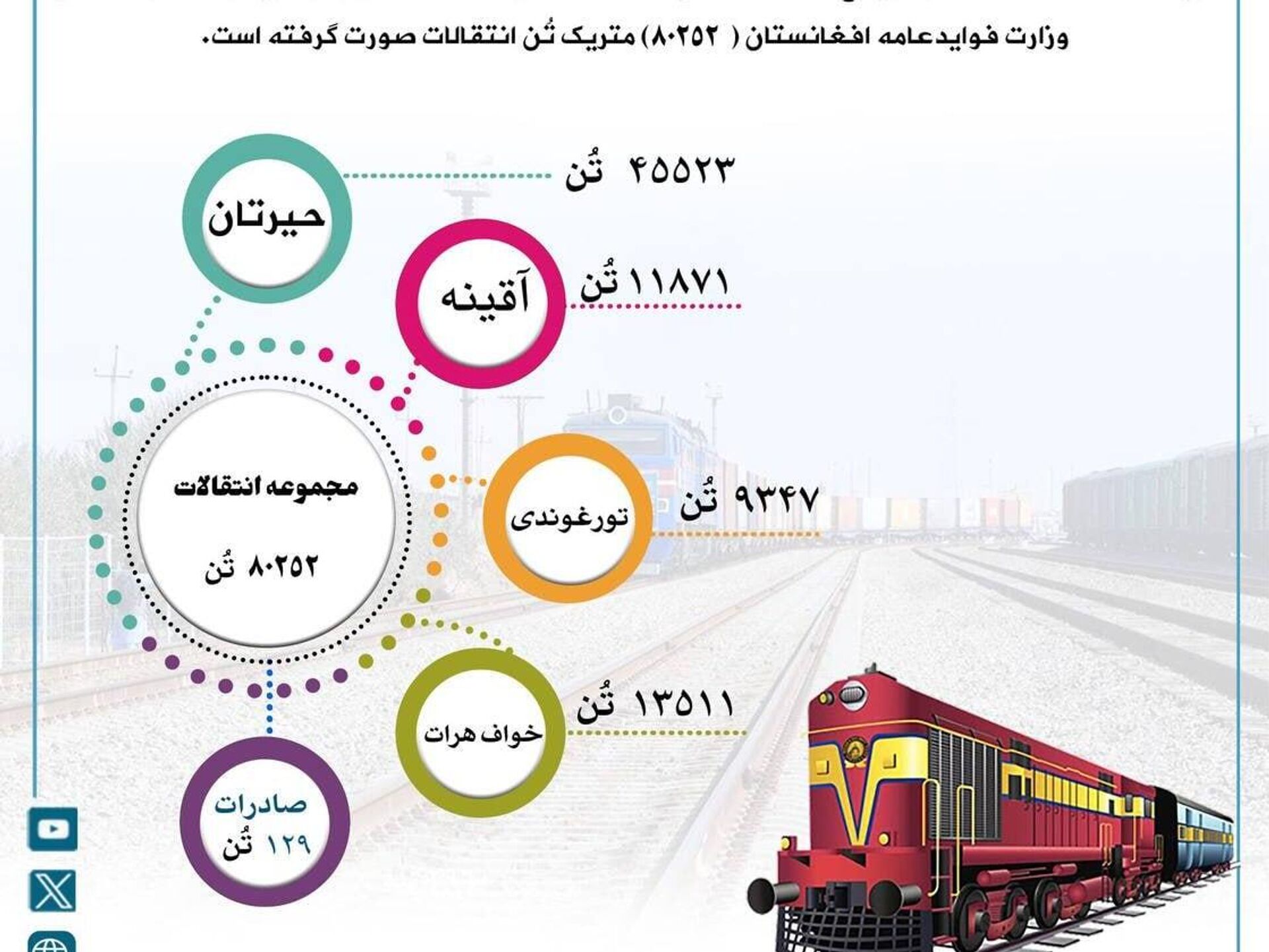 🟠همچنین طی این مدت 129 تُن سنگ معدنی بهعنوان صادرات از کشور بیرون شده است. وزارت فواید عامه اعلام کرده است که با افزایش انتقالات ریلی، زمینه اشتغال، رشد عواید ملی و ثبات اقتصادی تقویت خواهد شد.