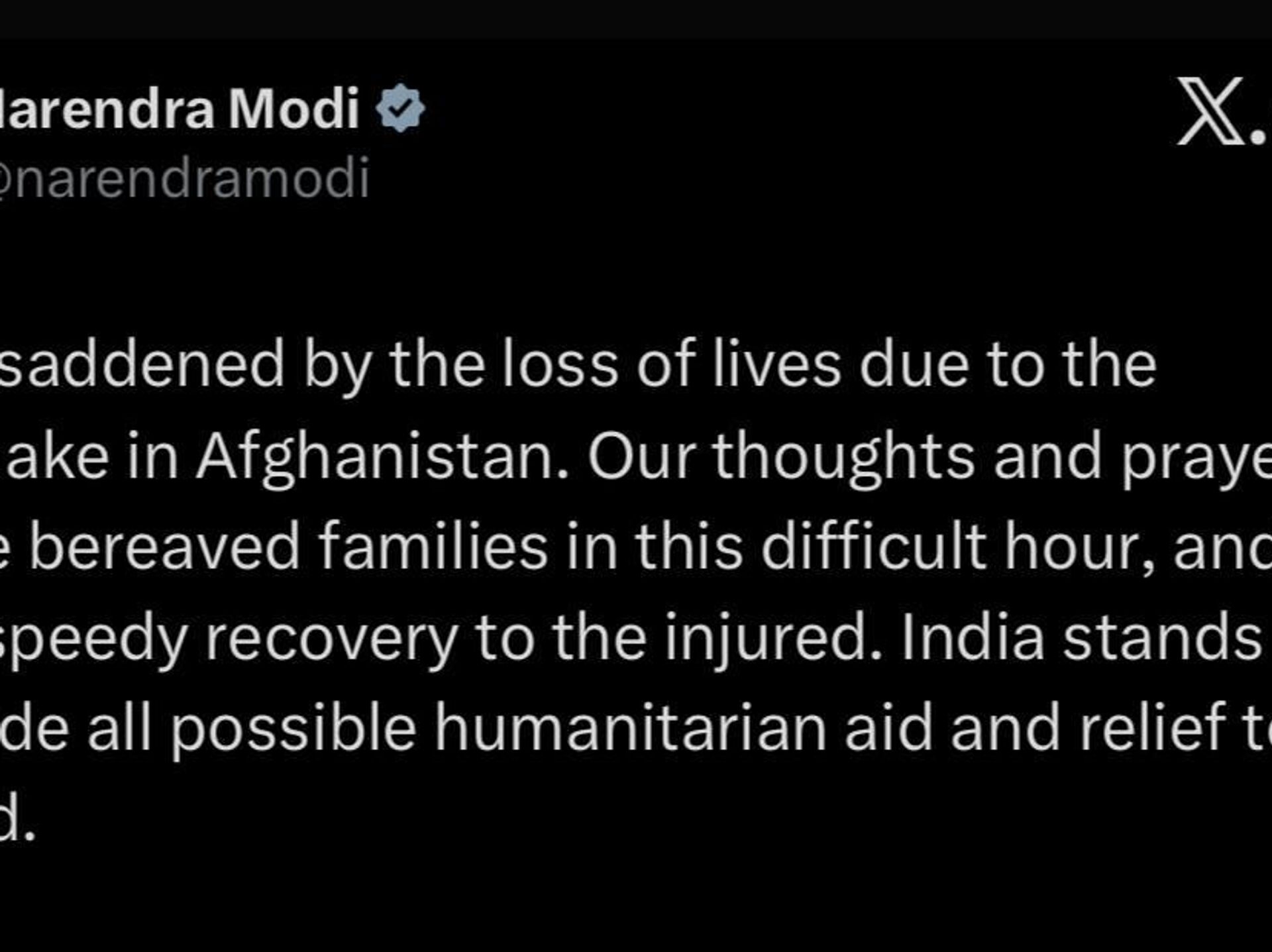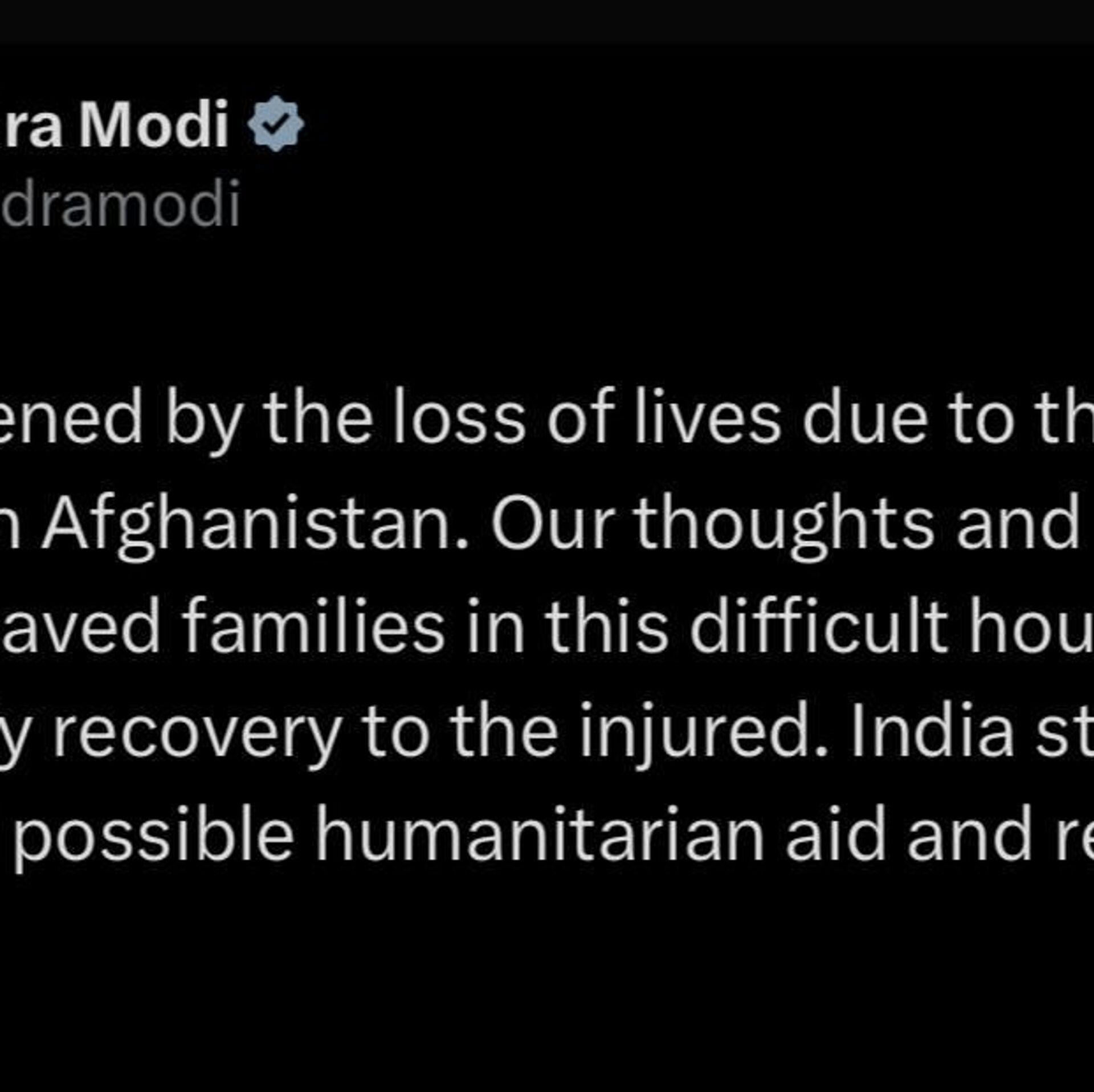 او در ایکس نوشته است که هند آماده است تا تمام کمکهای بشردوستانه و امدادی ممکن را به آسیبدیدگان ارائه دهد.