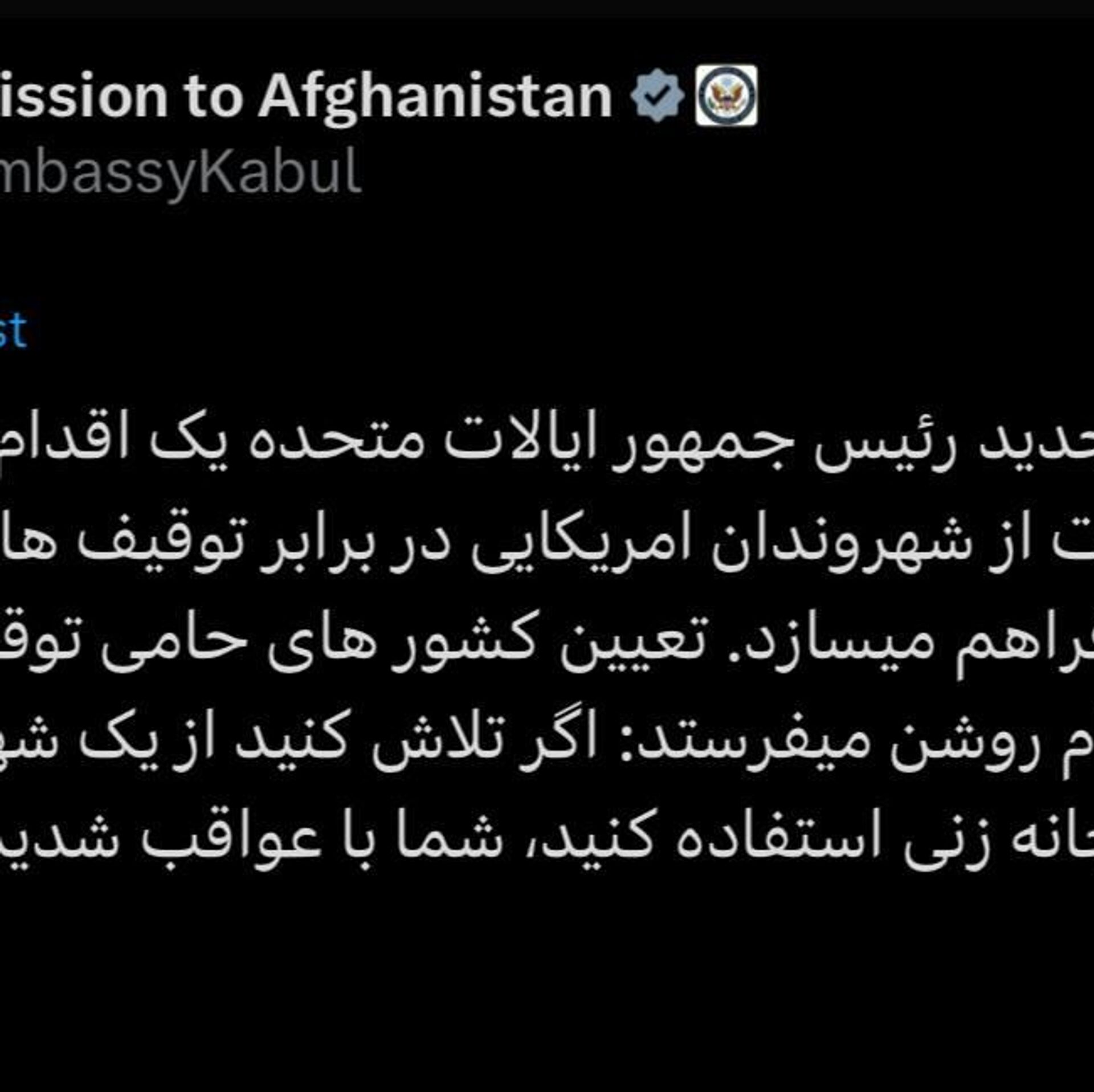 سفارت امریکا در کابل که از قطر فعالیت میکند در صفحه ایکس نوشته است: