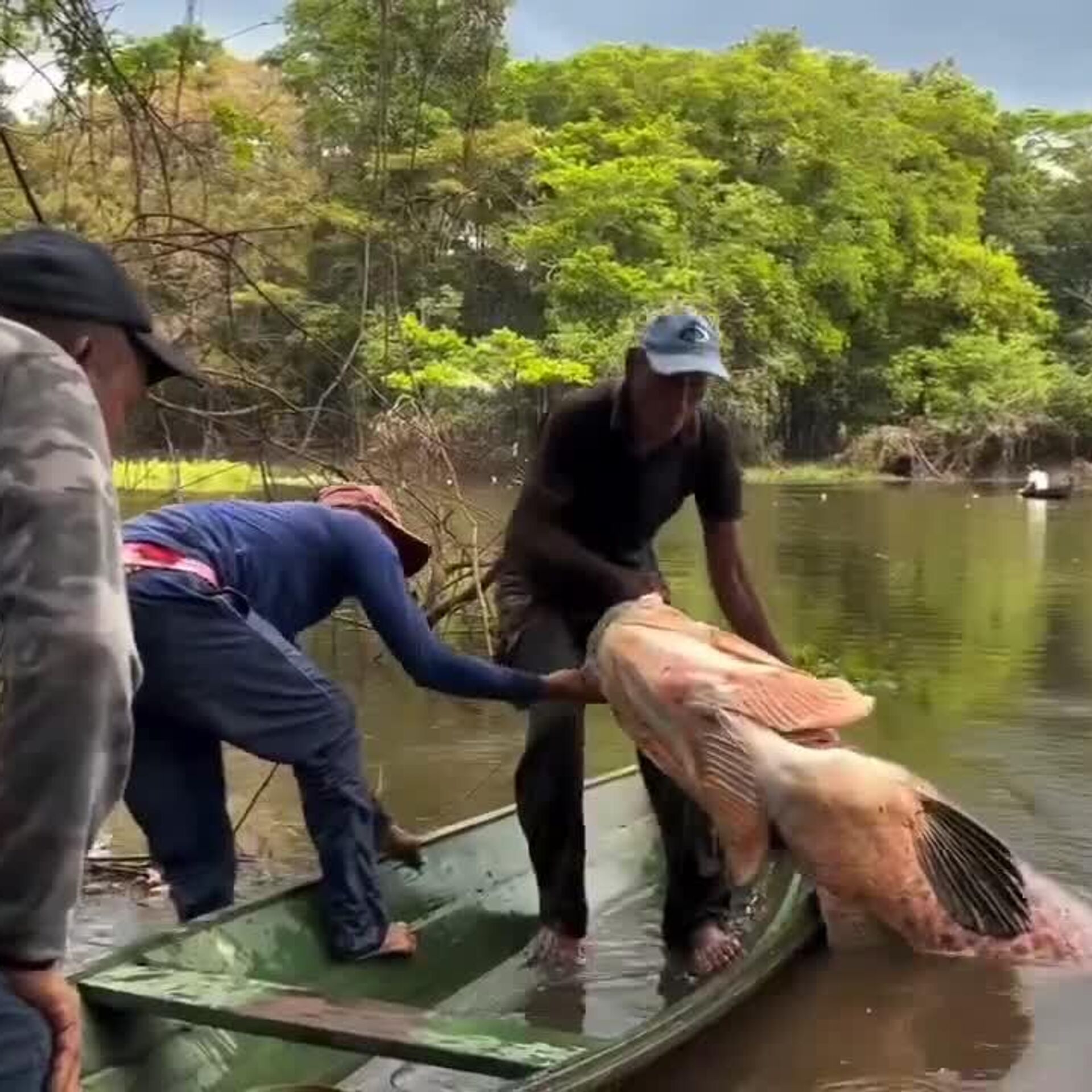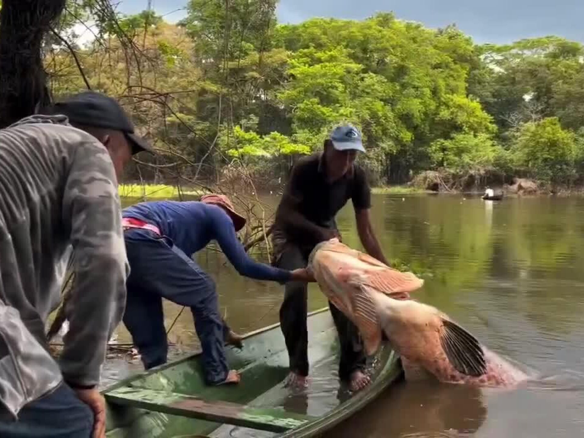 ◻ماهیگیری در آمازون یک ماهی 150 کیلوگرامی پیراروکو (آراپایما) را صید کرد.