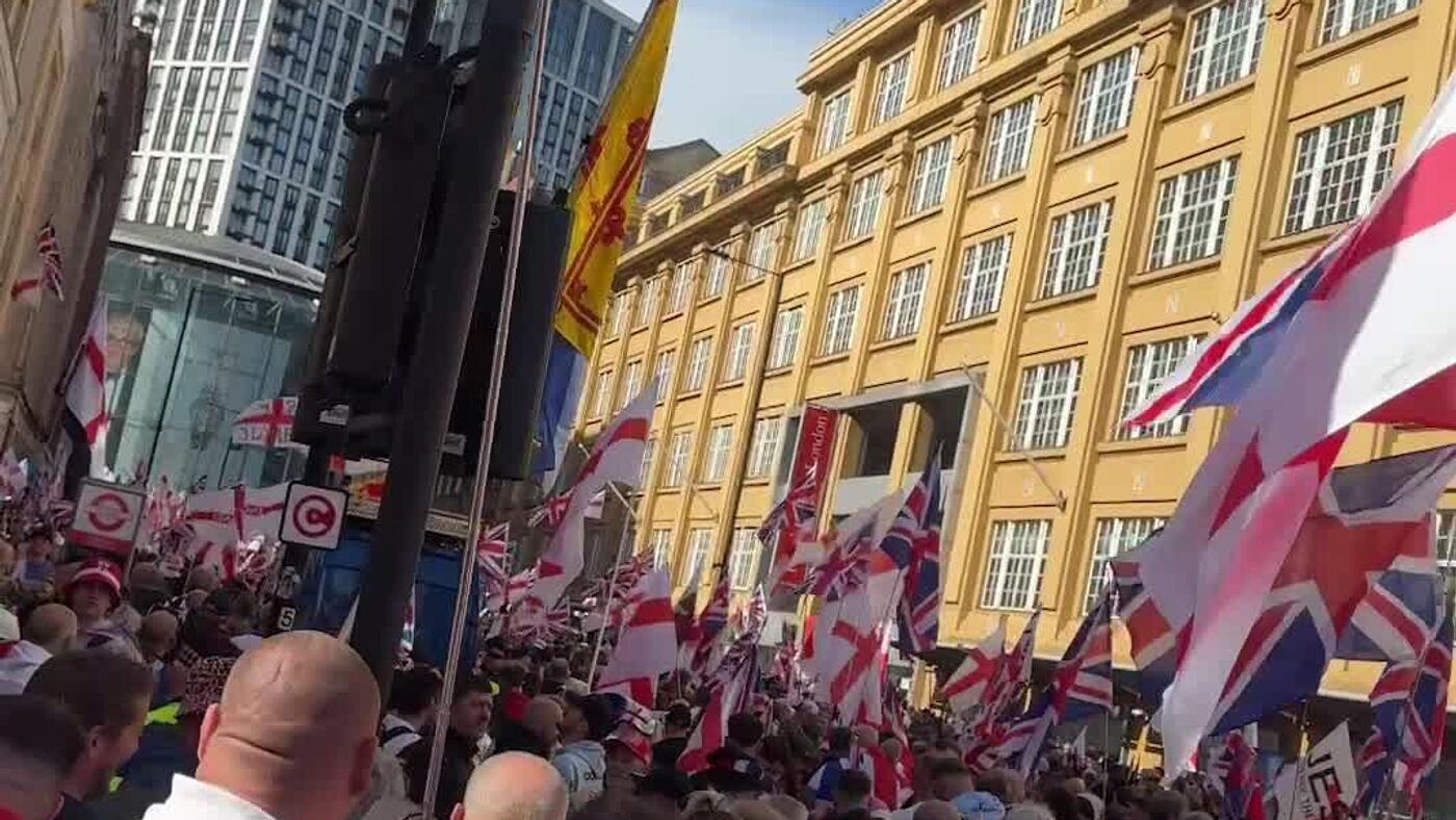 معترضان با شعار دادن در برابر کی یر استارمر نخستوزیر جدید، سیاستهای مهاجرتی دولت و محدودیتهای اعمال شده بر آزادی بیان را مورد انتقاد قرار دادند.