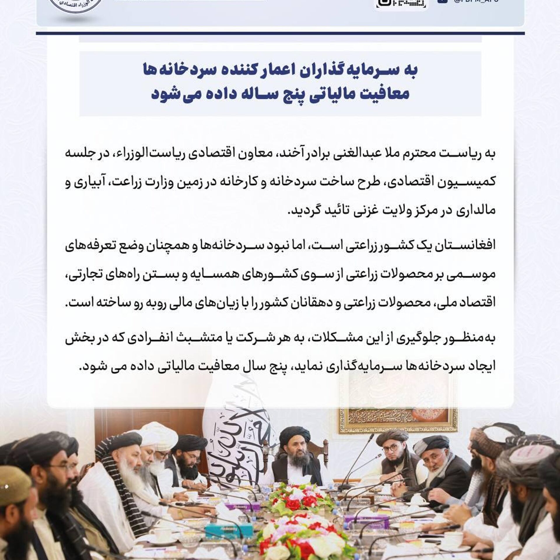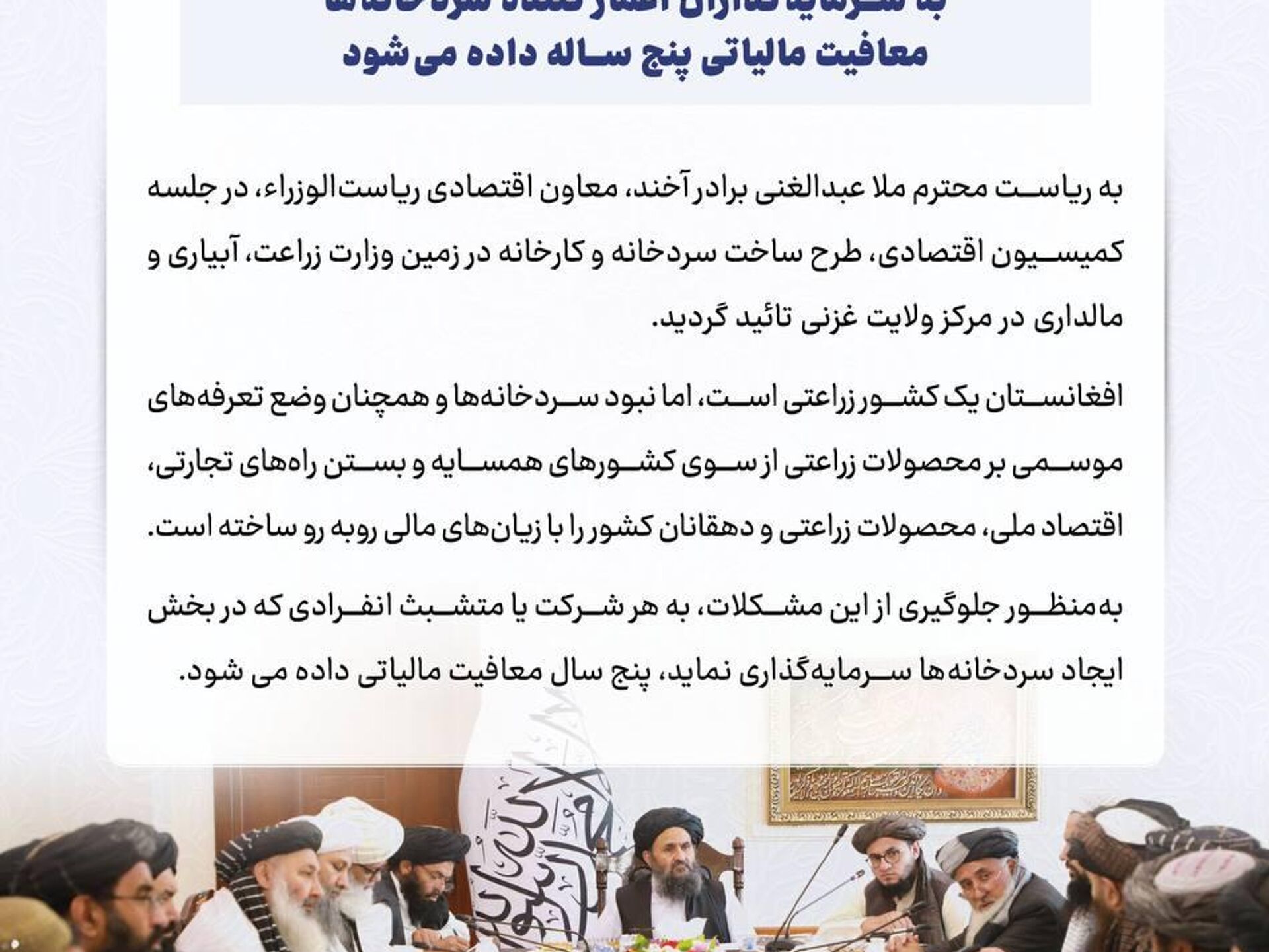 این تصمیم در نشست کمیسیون اقتصادی که به ریاست ملا عبدالغنی برادر ، معاون اقتصادی ریاستالوزرا، برگزار شده بود، مورد تصویب قرار گرفت.