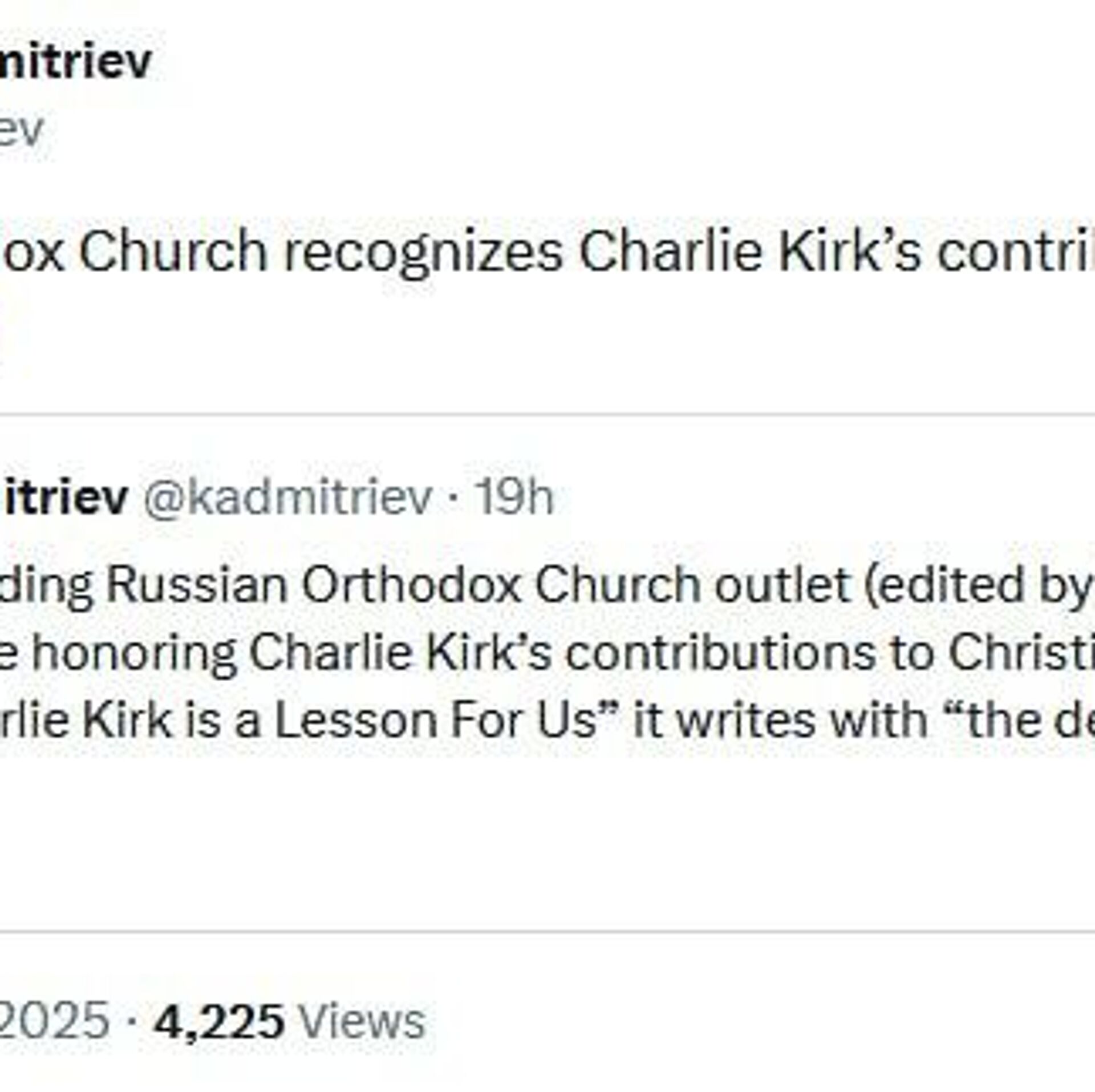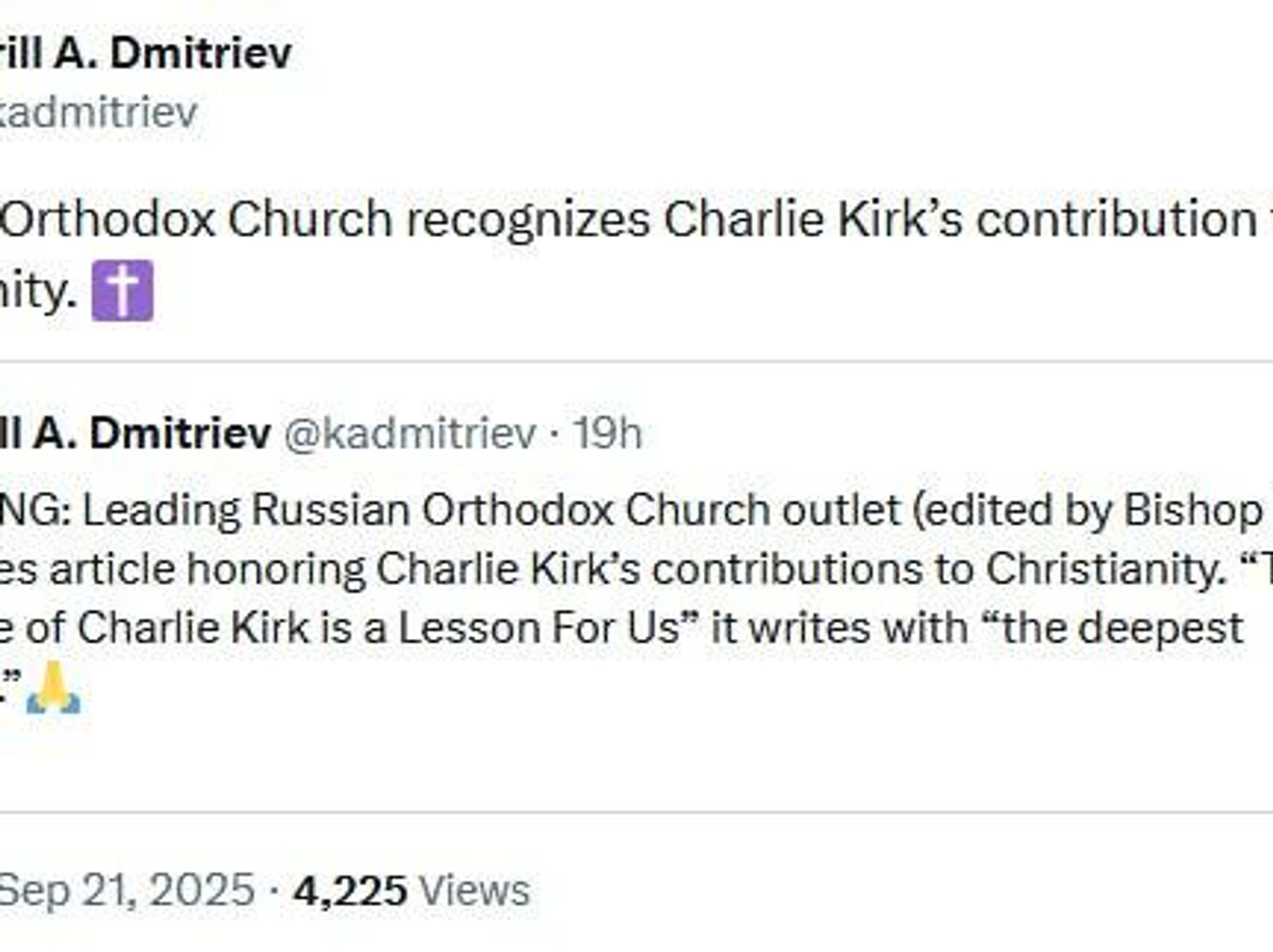◻کریل دیمیتریف، رئیس صندوق سرمایهگذاری مستقیم روسیه و نماینده رئیس جمهور در همکاریهای اقتصادی بینالمللی، گفت که کلیسا سهم چارلی کرک در مسیحیت را به رسمیت میشناسد: