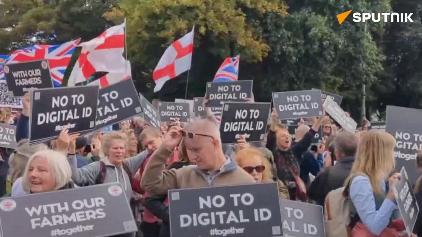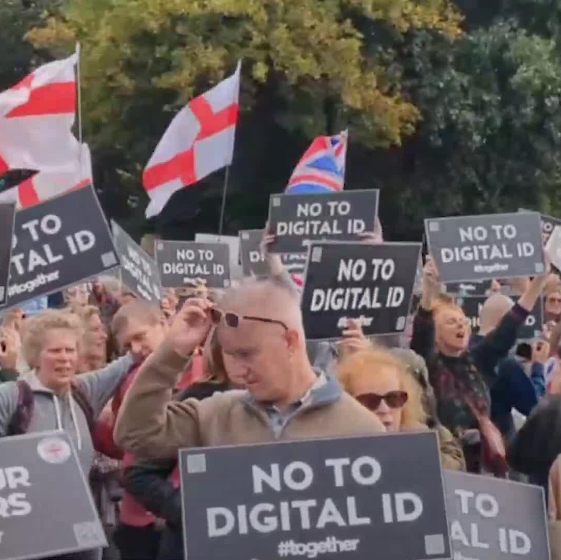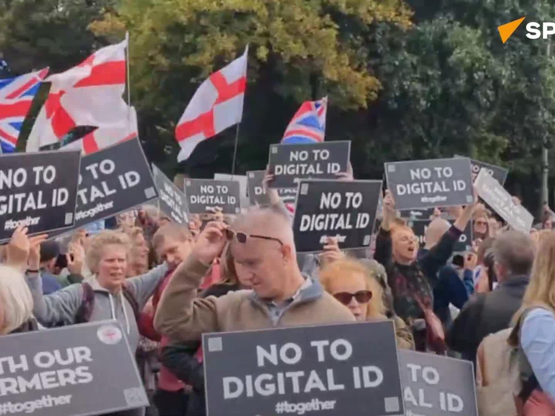 ◻ جمعیت با پلاکاردهایی که روی آنها نوشته شده بود «نه به کارتهای شناسایی دیجیتال» و «نه به خشونت دیجیتال»، شعار میدادند: «کارت شناسایی ممنوع، مرگ بر استارمر، مرگ بر حزب کارگر!»