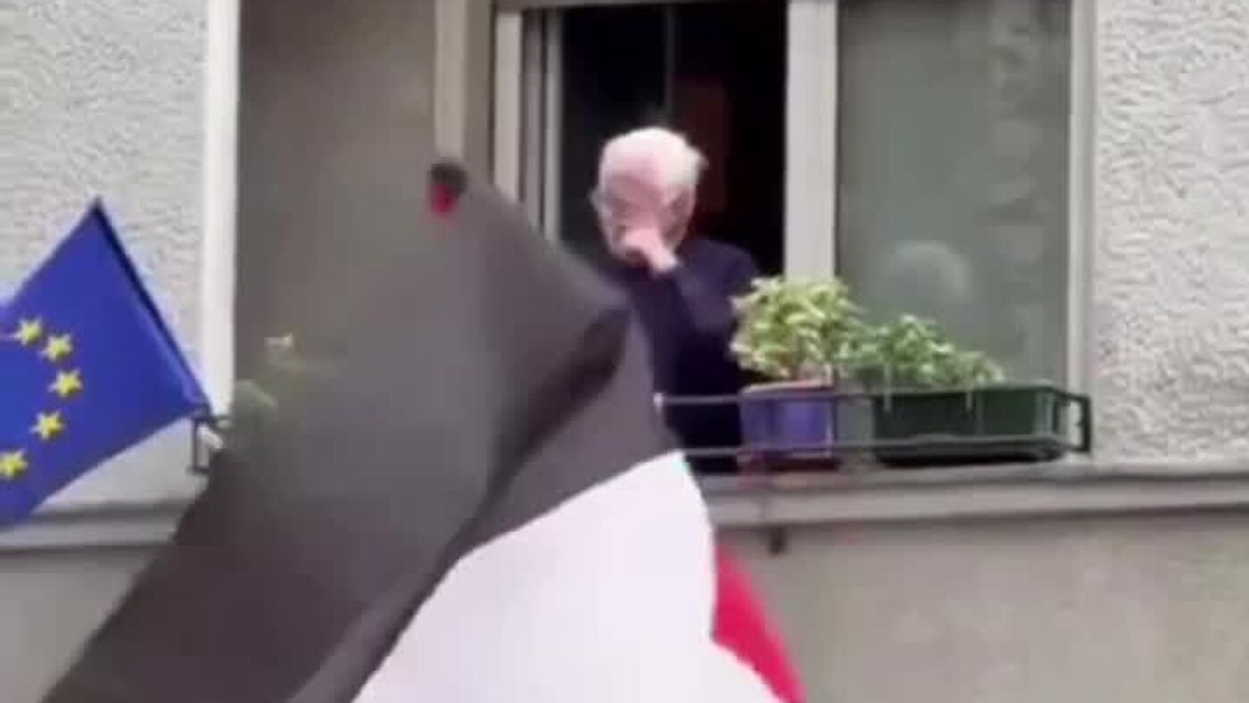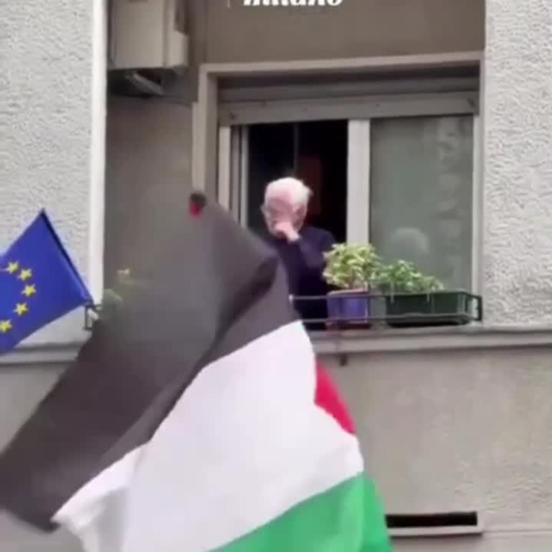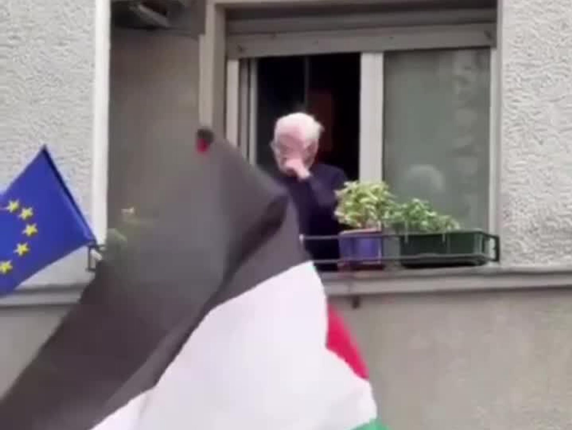 یک مرد مسن از بالکن خانهاش به جمعیتی که در خیابانهای میلان ایتالیا تظاهرات میکردند، پیوست و با تکان دادن پرچم کوچک فلسطین، در همبستگی با قربانیان غزه گریه و جنگ اسرائیل علیه نوار غزه را محکوم کرد.