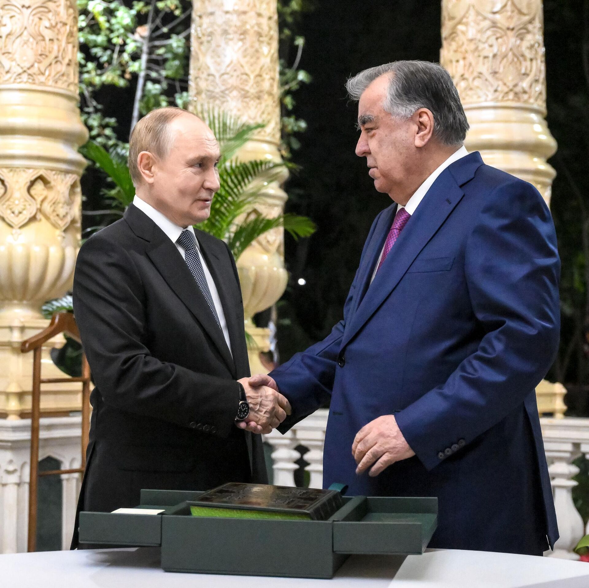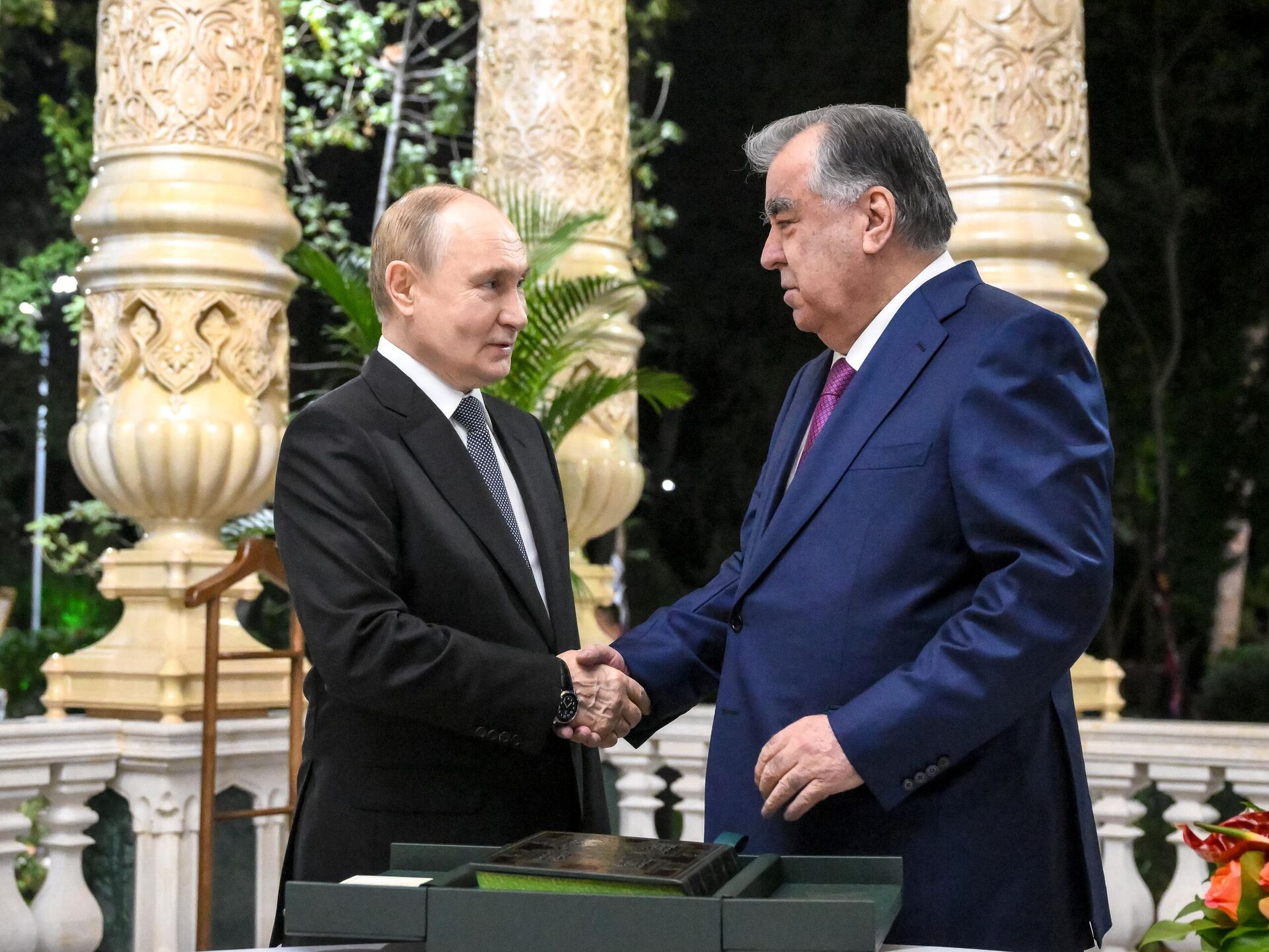 امامعلی رحمان، رئیس جمهور تاجیکستان شخصاً در فرودگاه دوشنبه از ولادیمیر پوتین استقبال کرد: روسای جمهور با هم دست دادند و یکدیگر را در آغوش گرفتند.