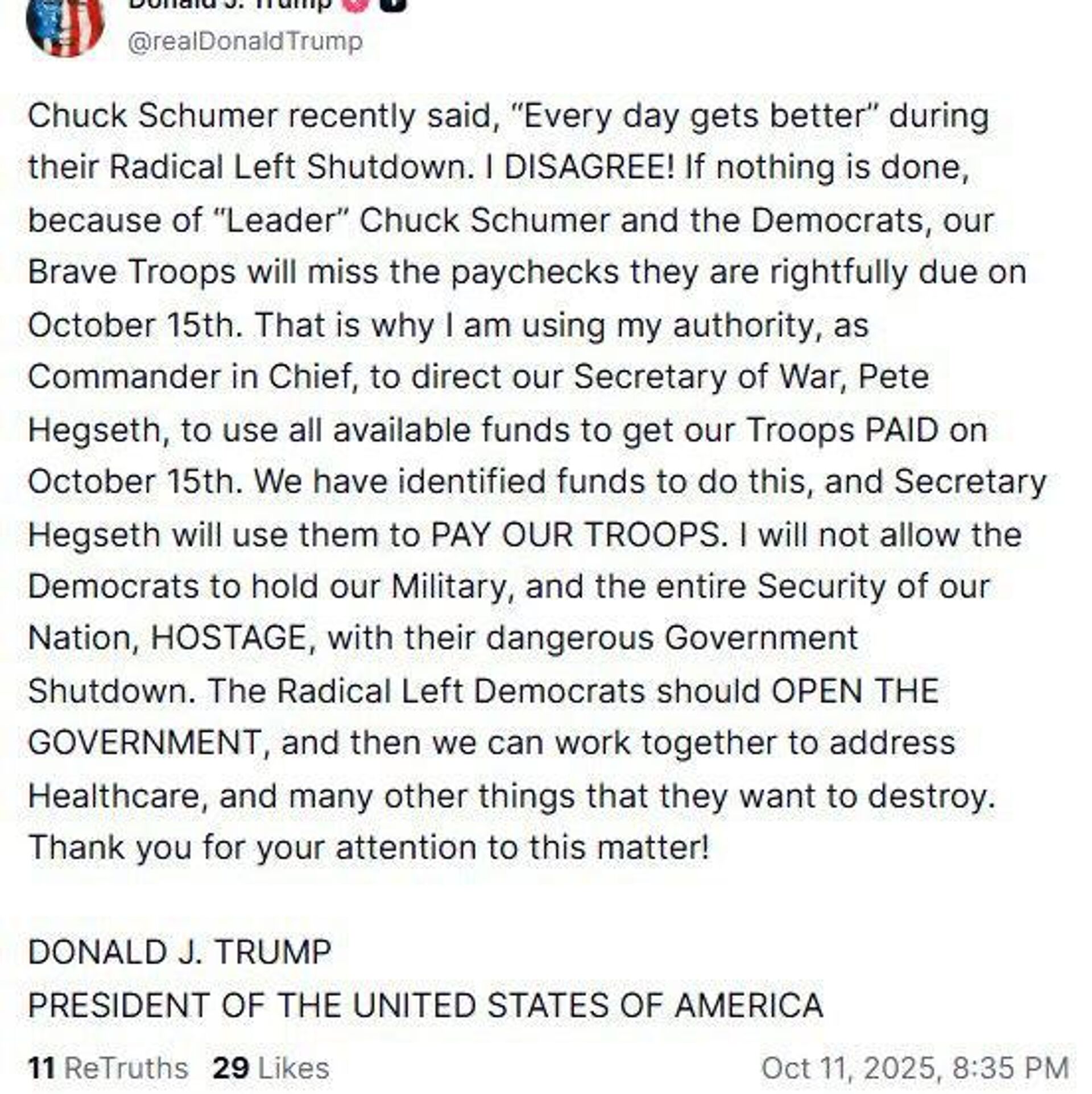 ترامپ اظهار داشته است که در بحبوحهٔ تعطیلی حکومت ایالات متحده، به رئیس پنتاگون دستور داده تا تاریخ 15 اکتبر، تمام بودجهٔ موجود را برای پرداخت معاش نظامیان اختصاص دهد.
