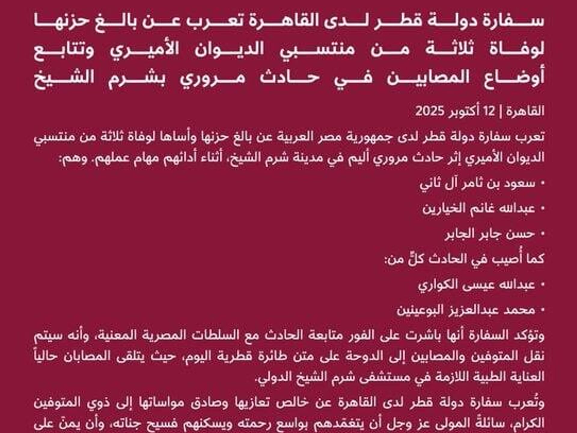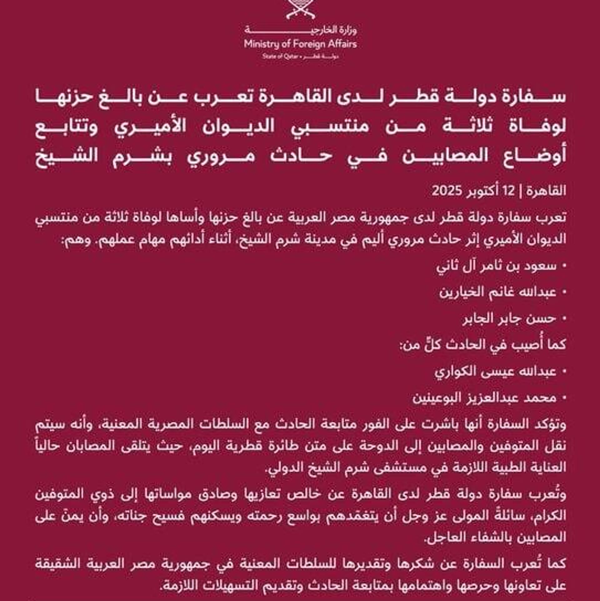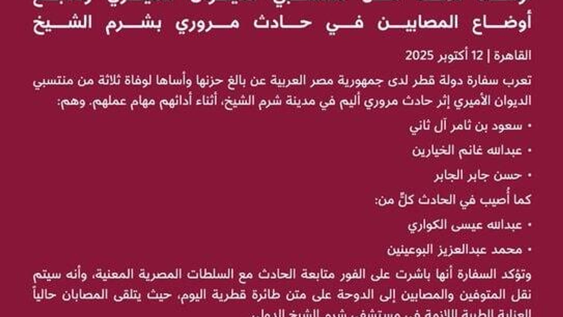 ◻سفارت قطر در قاهره رسماً تأیید کرد که مقامات مهم وزارت امور خارجه در یک سانحه رانندگی در نزدیکی شرمالشیخ مصر - جایی که قرار است اجلاس بینالمللی بزرگی در مورد غزه آغاز شود - جان باختند.