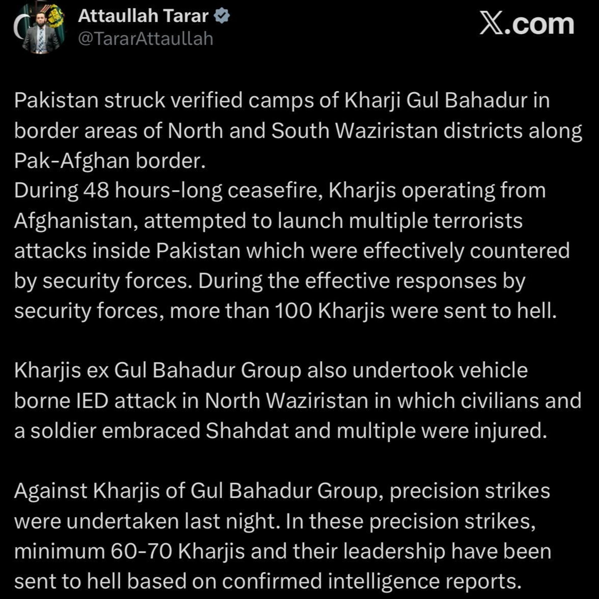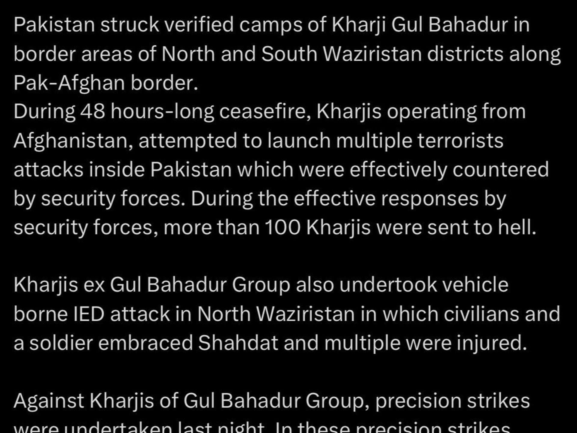 🟠به گفتهٔ وی، این عملیات پس از تلاش افراد وابسته به گروه گل بهادر برای انجام حملات تروریستی از داخل خاک افغانستان علیه اهداف در پاکستان صورت گرفته است.