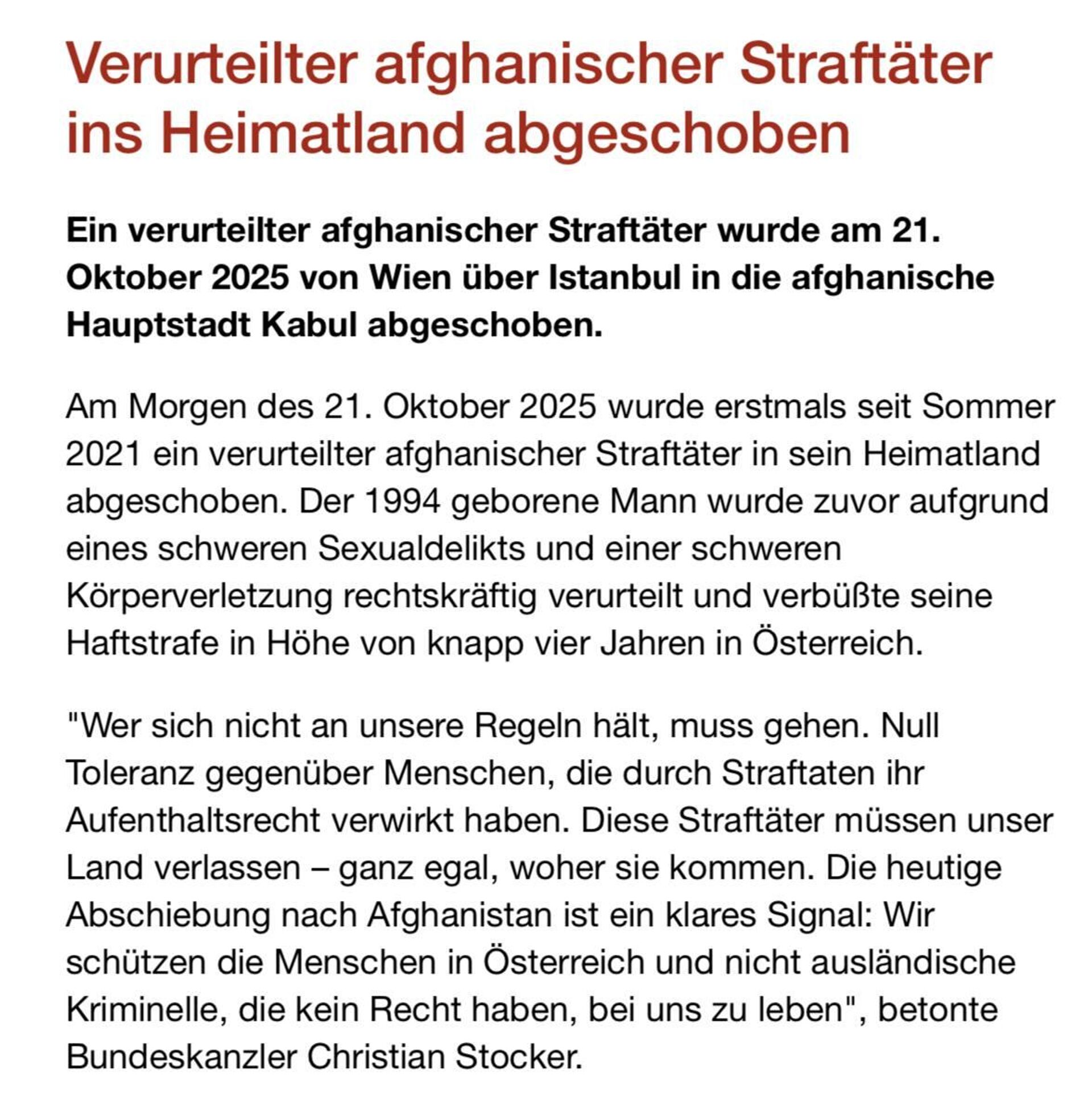 ما اخراج مجرمان محکوم شده به افغانستان را اعلام کردیم، و اکنون ما آن را اجرا می کنیم. ما این مسیر سخت اما ضروری را ادامه خواهیم داد. در حال حاضر اخراج جنایتکاران محکوم شده به افغانستان در حال آماده سازی است.