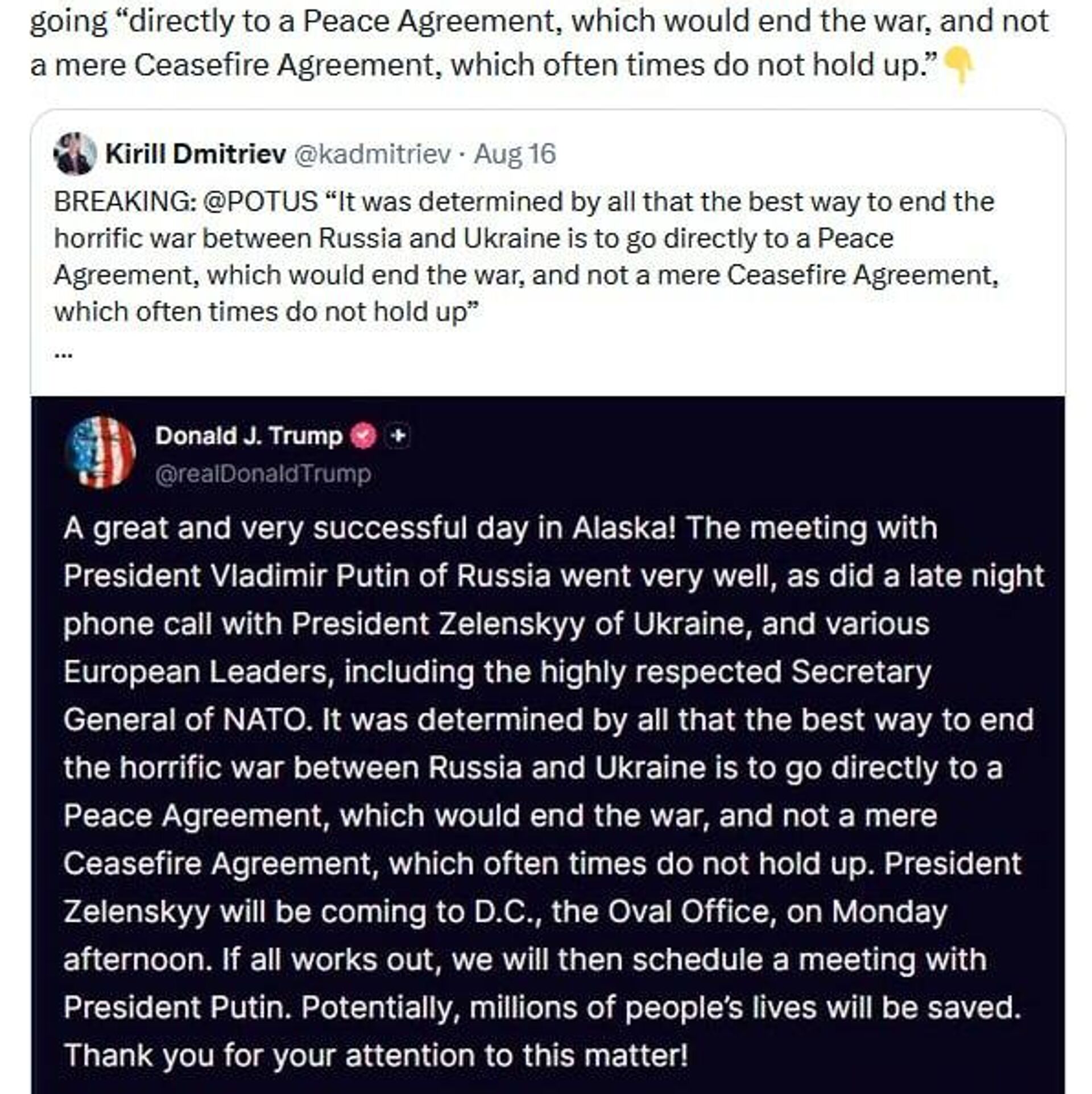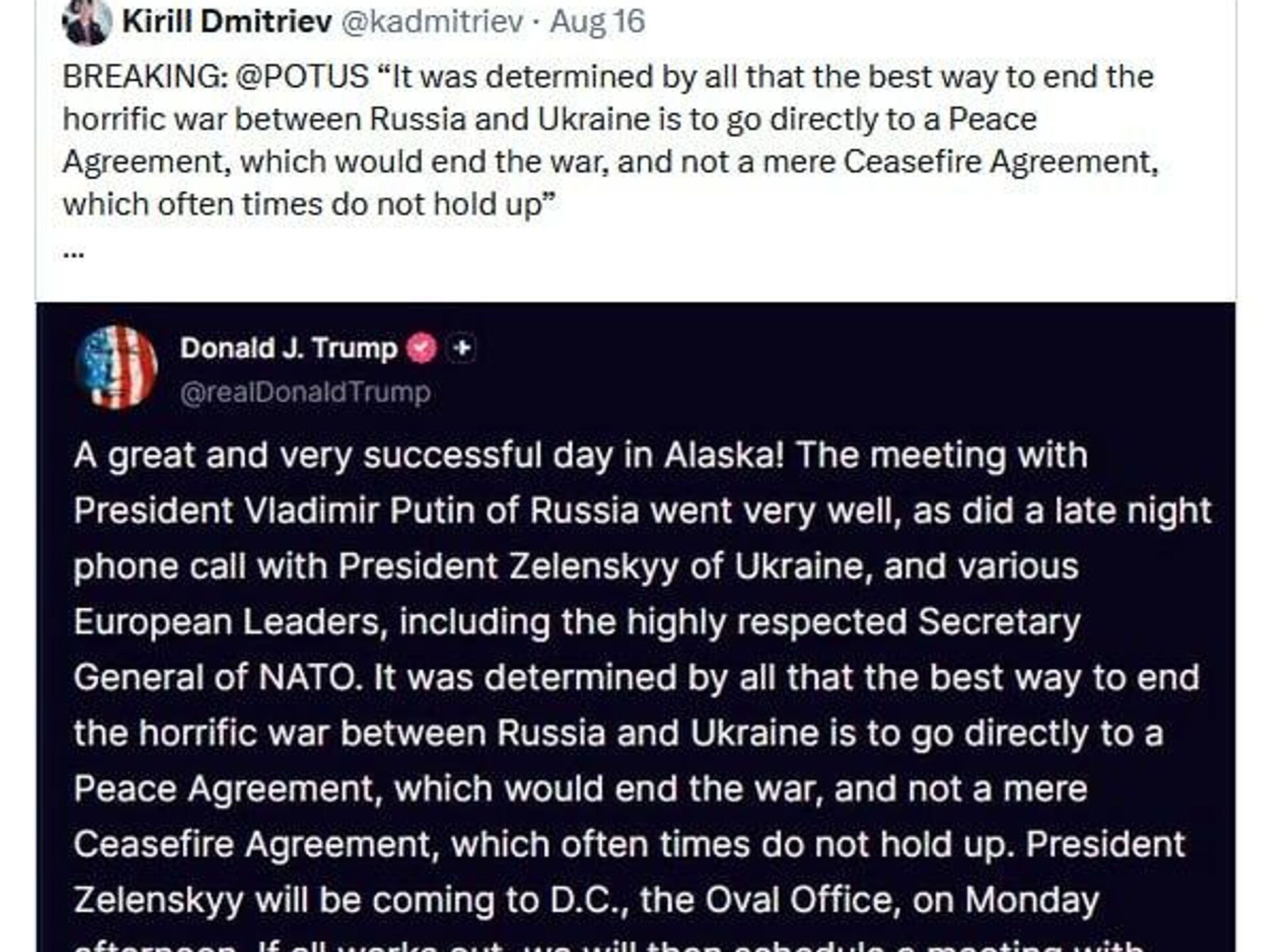 کریل دمیتریف، رئیس صندوق سرمایهگذاری مستقیم روسیه، در ایکس به این نکته اشاره کرد که یکی از نتایج کلیدی اجلاس آلاسکا، درخواست دونالد ترامپ برای «رسیدن مستقیم به یک توافق صلح، نه فقط آتشبس، که اغلب برقرار نمیشود» بود.