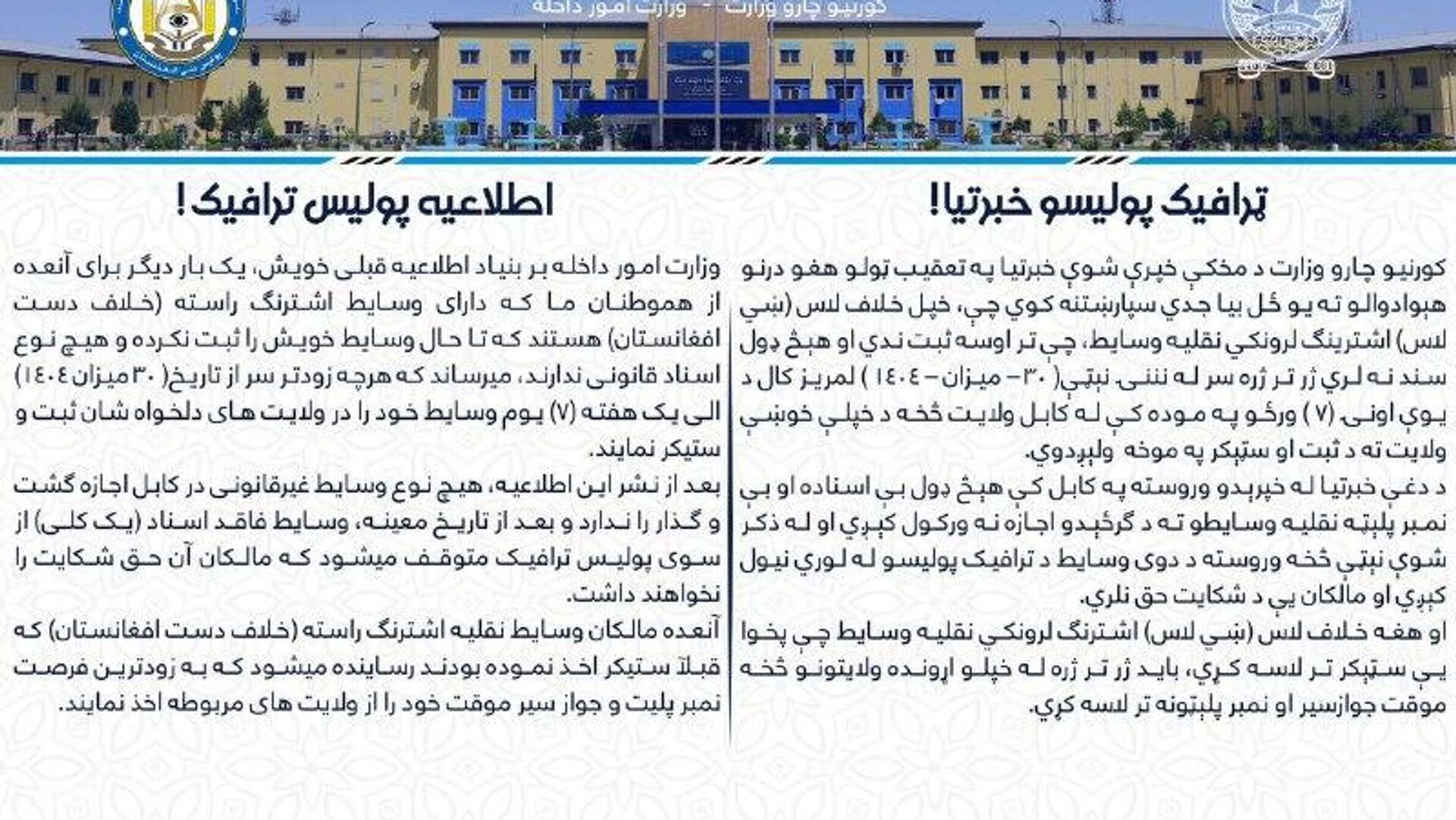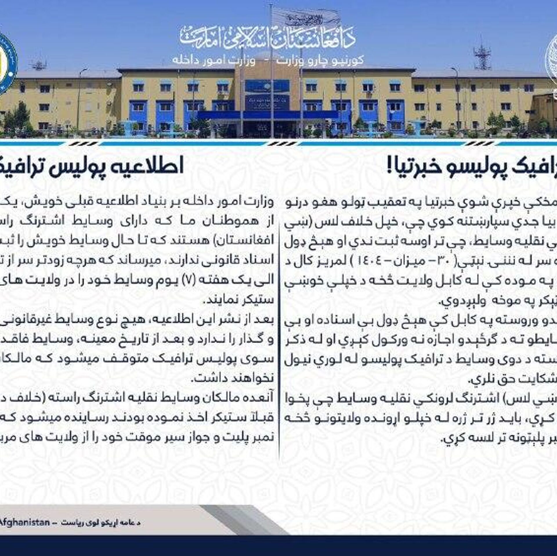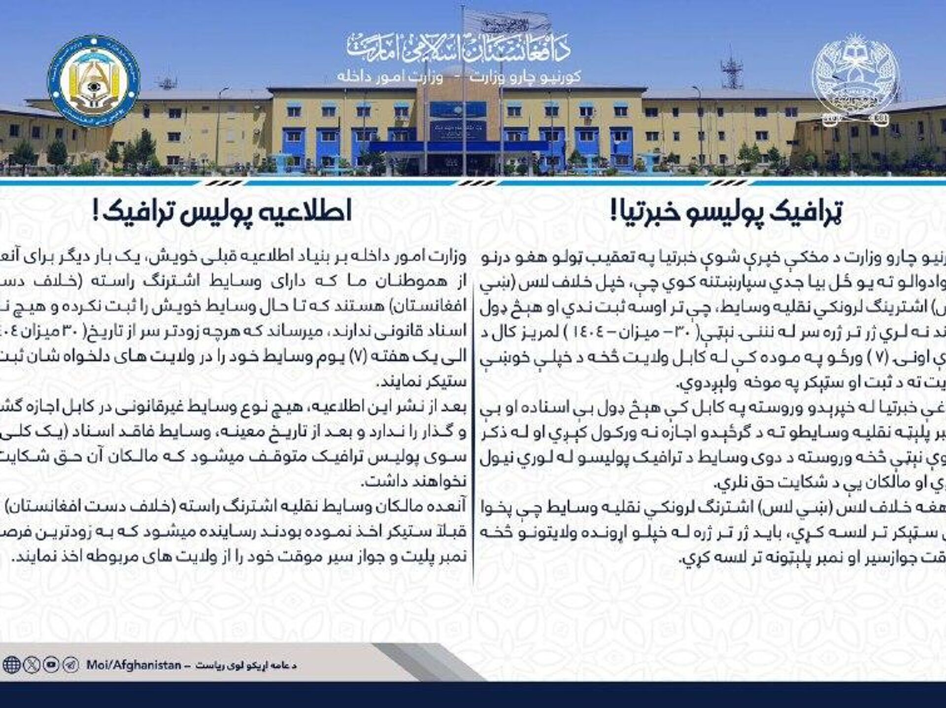ریاست ترافیک هشدار داده است که موترهای خلافدست افغانستان که فاقد جواز سیر و نمبرپلیت رسمیاند، اجازه رفتوآمد در کابل را ندارند.