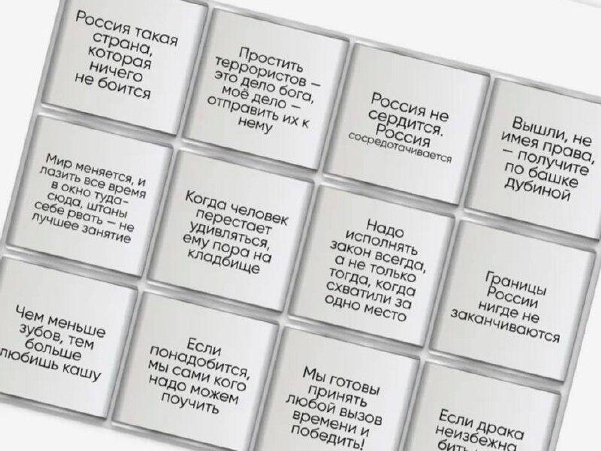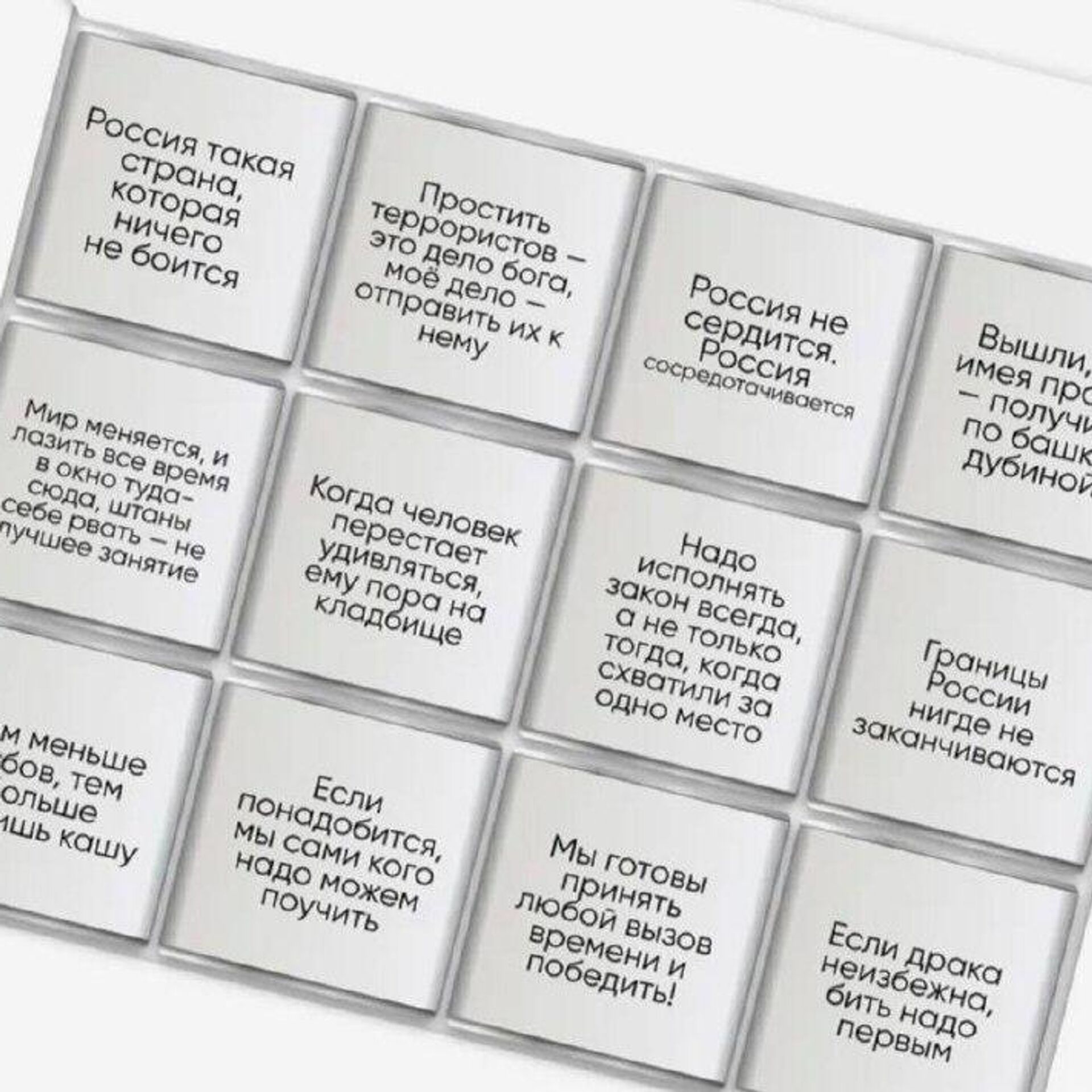 🟠او در کانال تلگرام خود عکسی از بستهبندی این شیرینیها را منتشر کرد. بر اساس اطلاعات منتشرشده در منابع باز، بر روی پوشهای درونی شکلاتها نقلقولهایی از سخنان رئیسجمهور روسیه درج شده است.