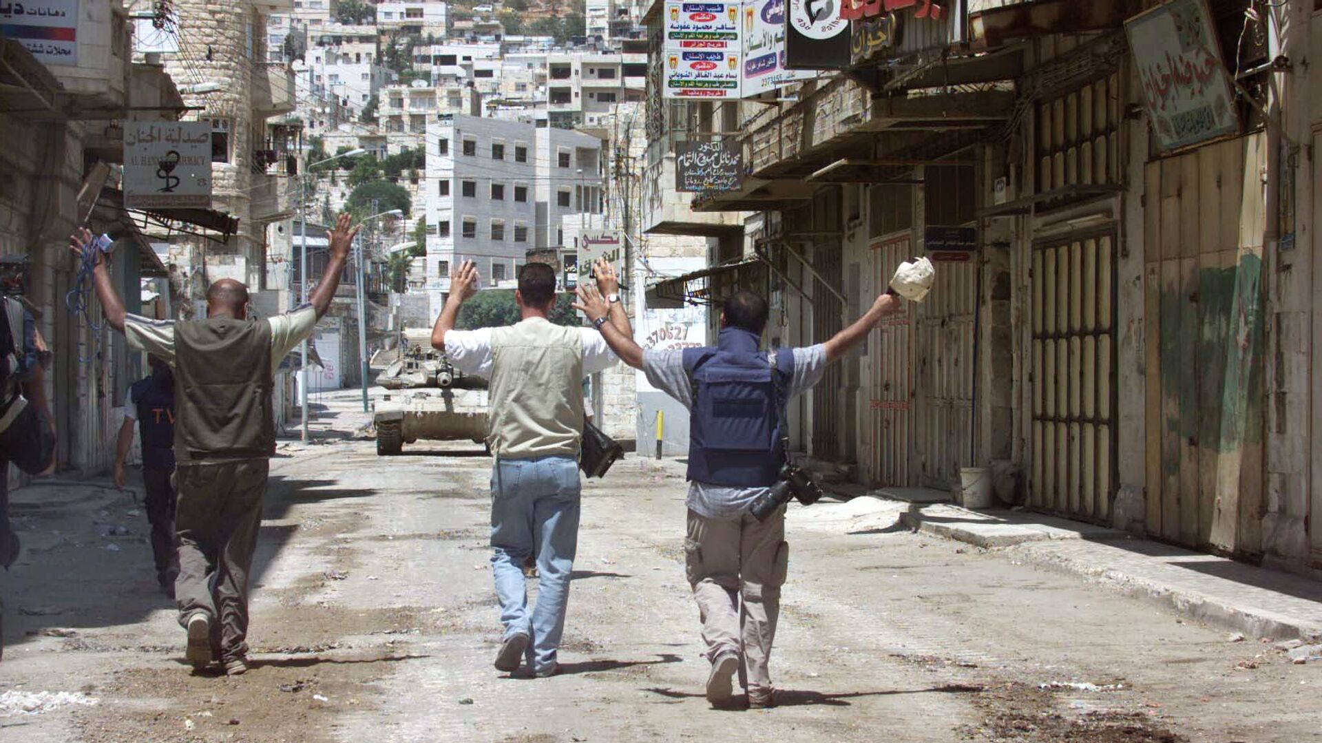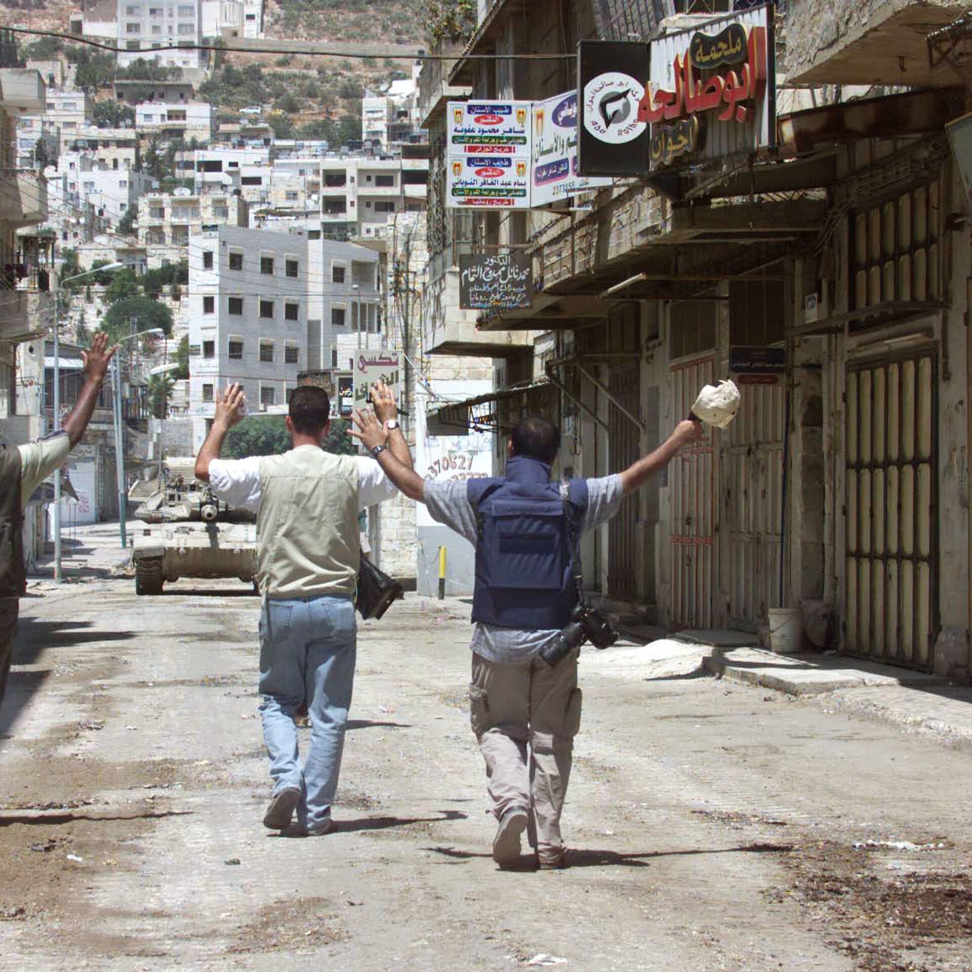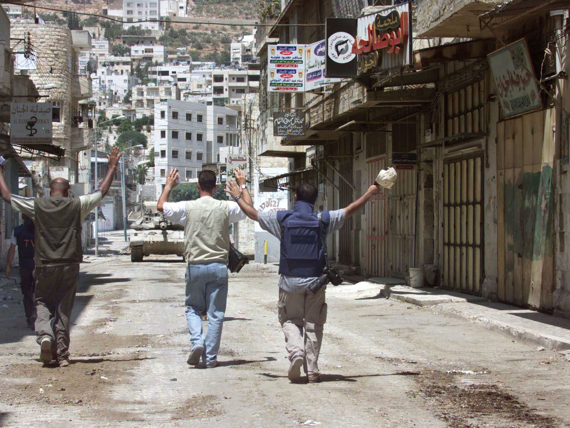 Журналисты с поднятыми руками идут по направлению к израильскому танку на одной из улиц в центре города Наблус, 2002 год - اسپوتنیک افغانستان  , 1920, 27.10.2025