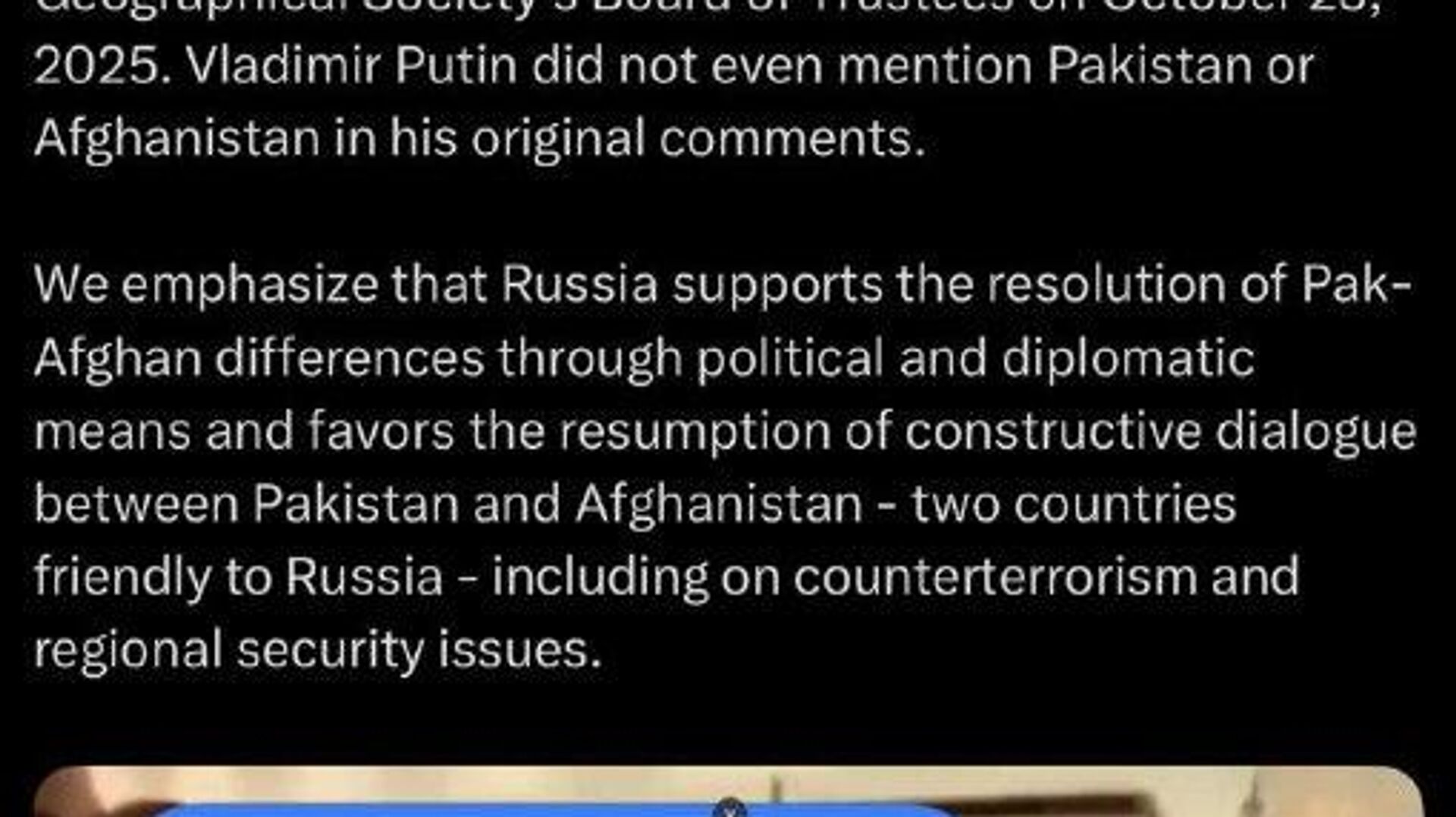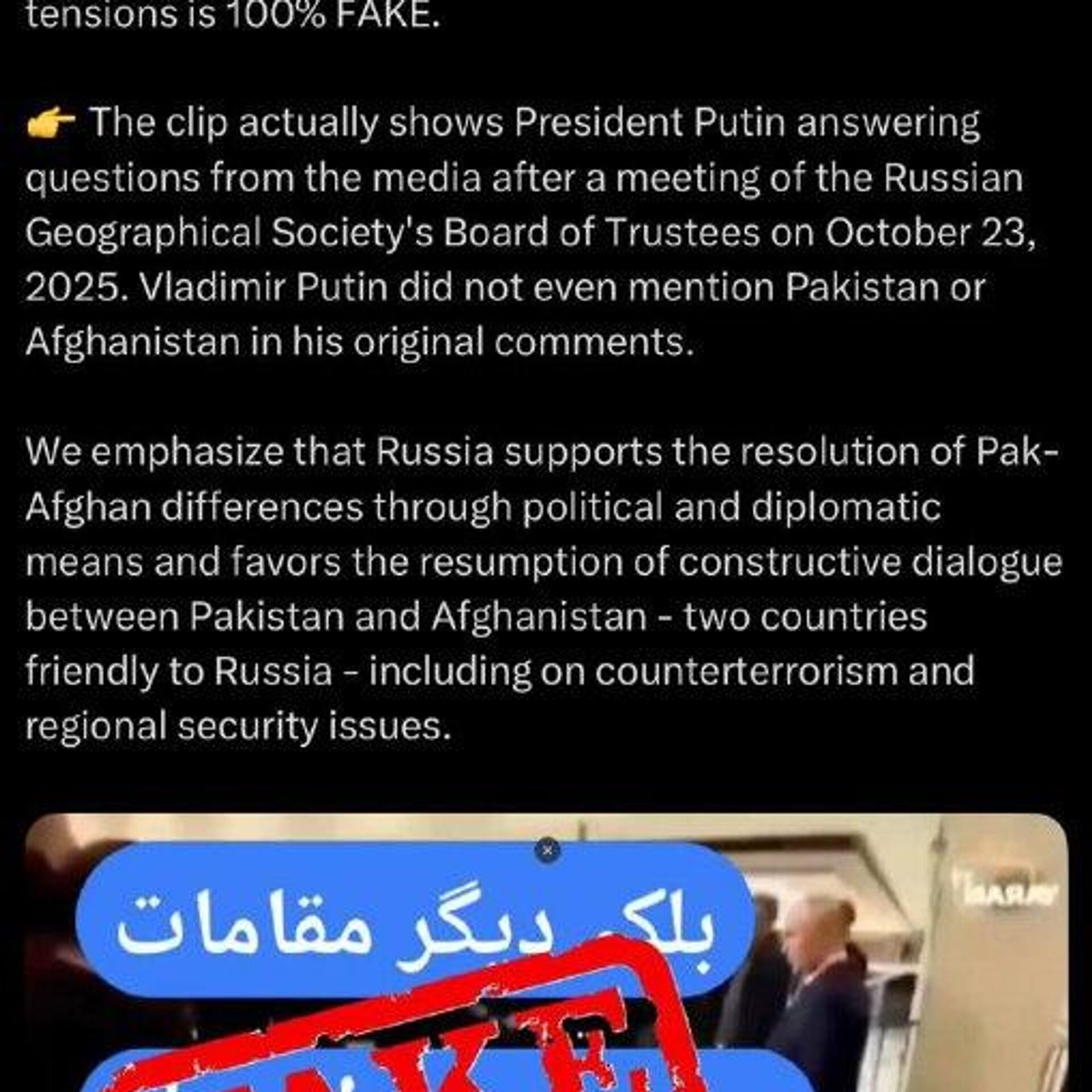 سفارت روسیه در اسلام آباد در بیانیه ای ویدئویی که در آن ولادیمیر پوتین، ظاهراً در بحبوحه تنشهای پاکستان و افغانستان، پاکستان را تهدید میکند، 100% جعلی است