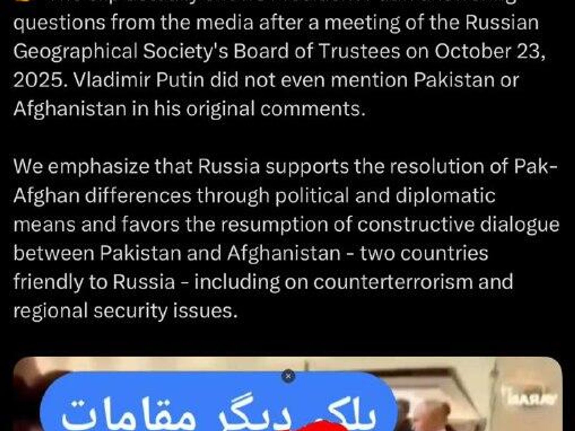 این کلیپ در واقع رئیس جمهور پوتین را در حال پاسخ به سوالات رسانهها پس از جلسه هیئت امنای انجمن جغرافیای روسیه در 23 اکتبر 2025 نشان میدهد. ولادیمیر پوتین در اظهارات اولیه خود حتی نامی از پاکستان یا افغانستان نبرد.