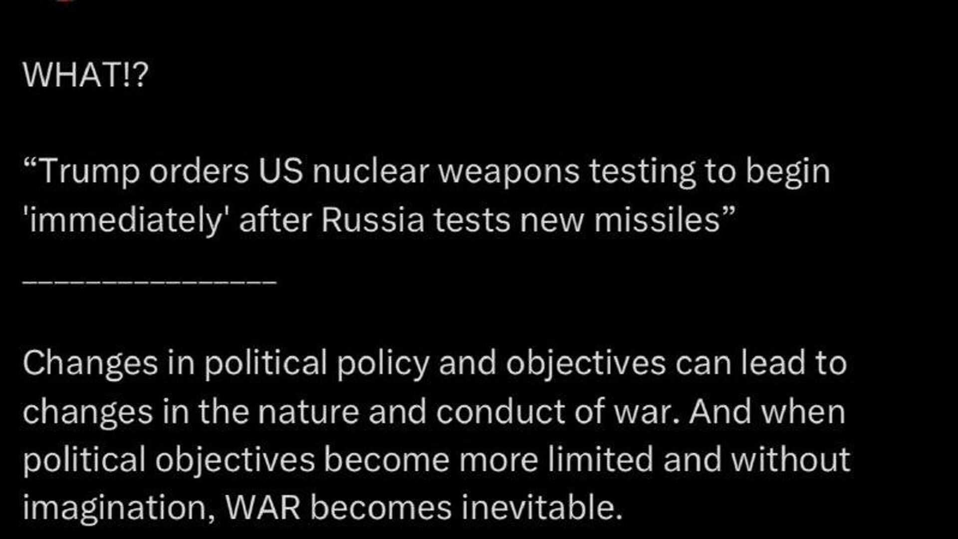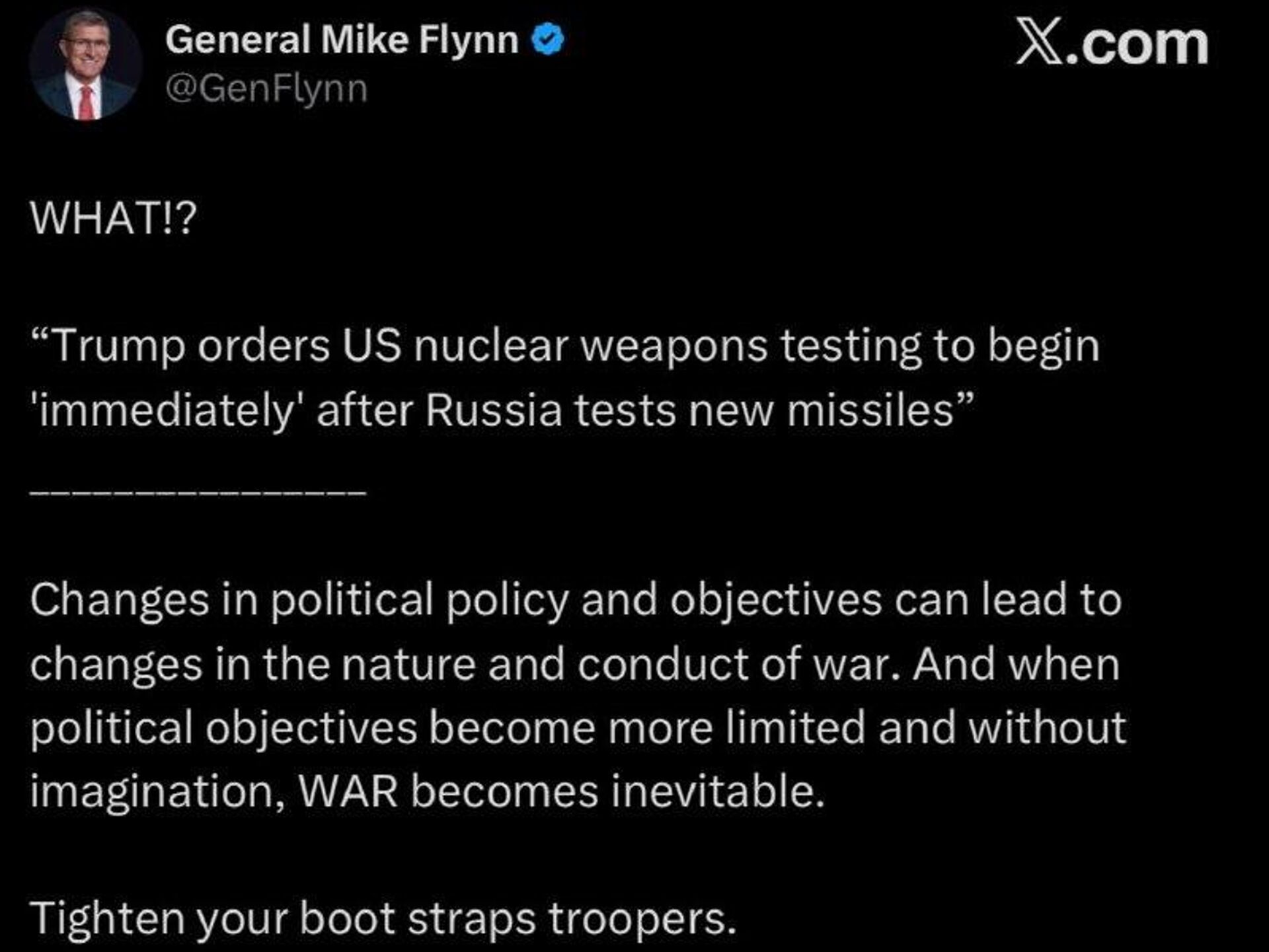 مایکل فلین مشاور سابق امنیت ملی دونالد ترامپ در شبکه اجتماعی X اعلام کرد که جنگ بعد از اظهارات رئیس کاخ سفید در مورد آزمایش های هسته ای اجتناب ناپذیر است