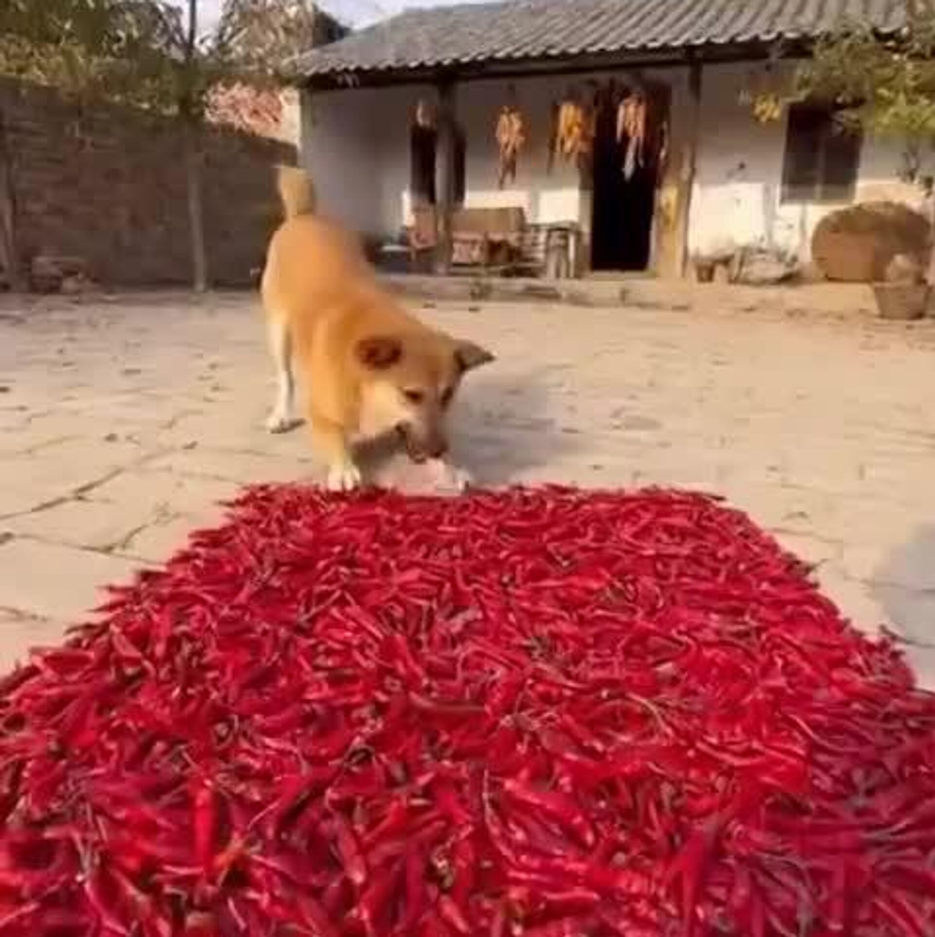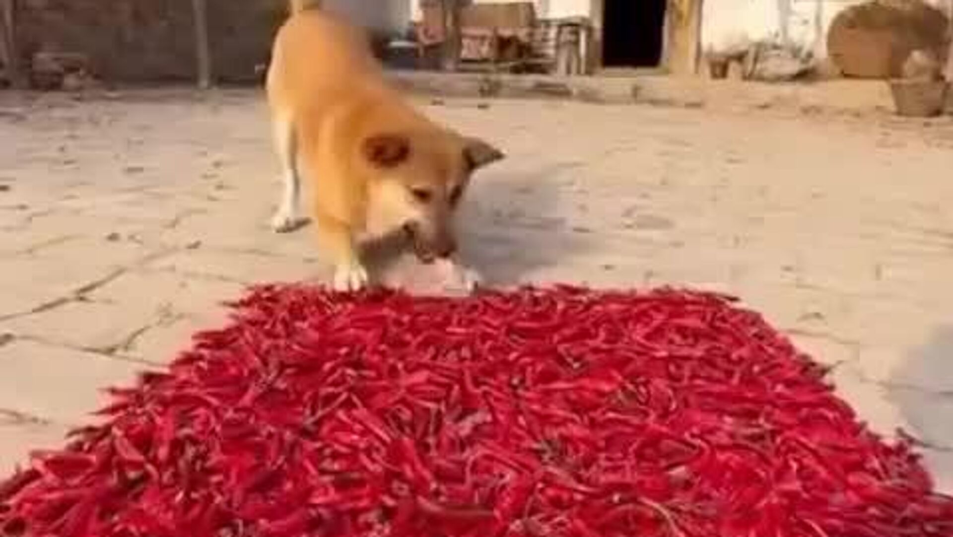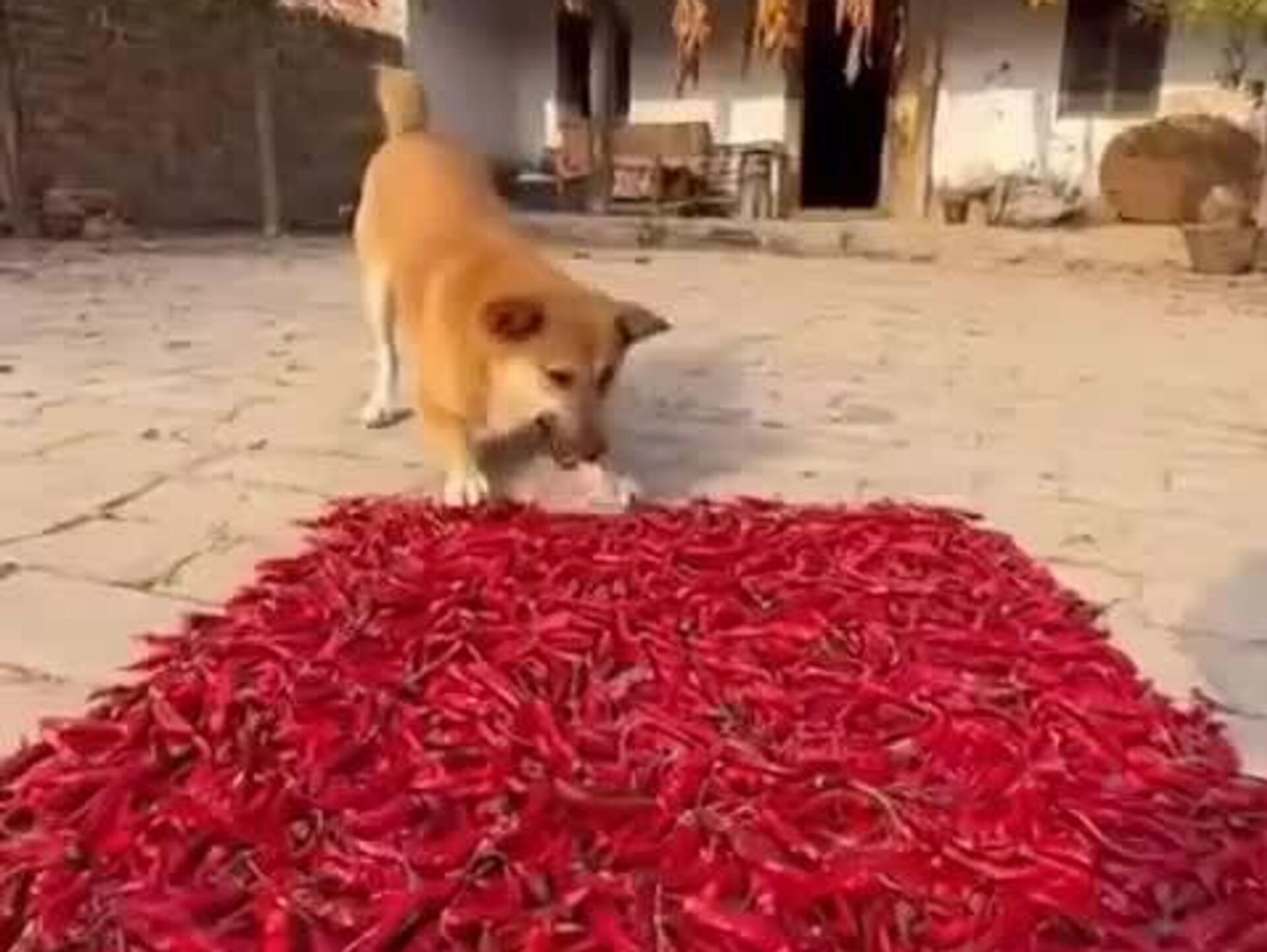 یک سگ کنجکاو چینی برای اولین بار فلفل سرخ خیلی تند را که برای خشک شدن هموار شده بود، امتحان کرد و بسیار شگفت زده شد.