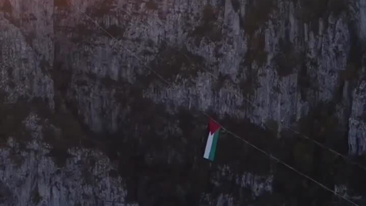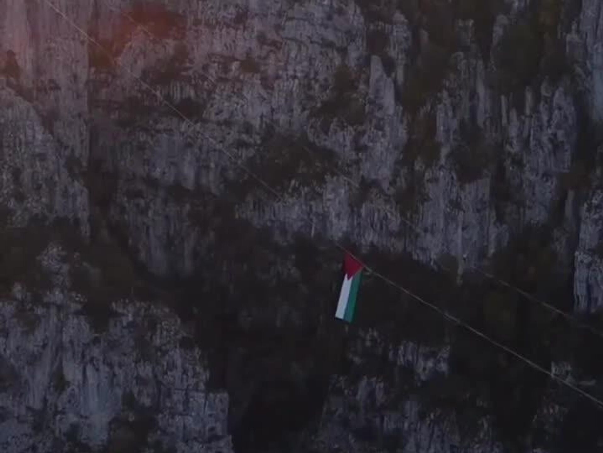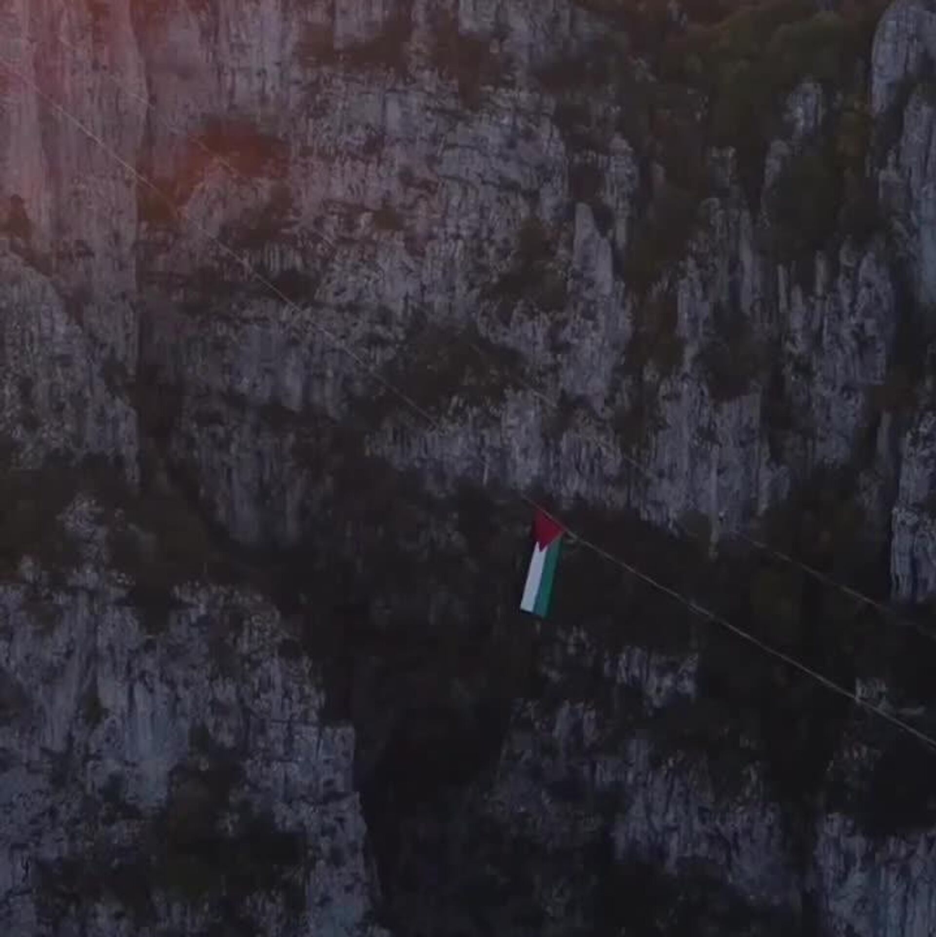 ● دو ورزشکار جسور با گذشتن از مسیری هوایی به درازای یک کیلومتر، در بلندای 850 متری بر فراز دره ویکوس در یونان، پرچم فلسطین را به نمایش گذاشتند.