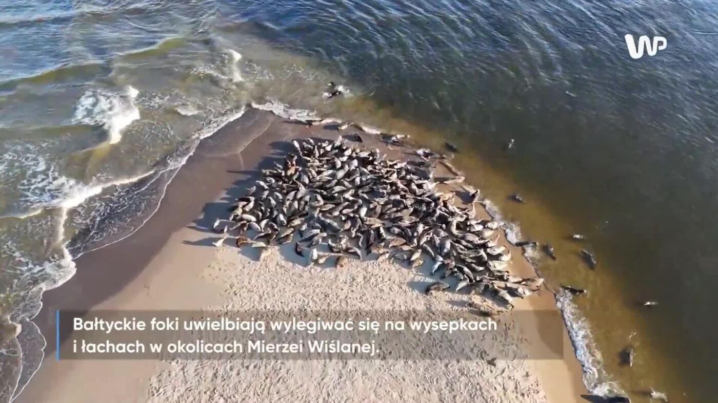 حیونات دریایی در حال آفتاب گرفتن روی شنزار در دهانه رودخانه ویستولا، نزدیک دماغه ویستولا. حیوانات آخرین پرتوهای خورشید را دریافت میکنند، اگرچه هوای نوامبر دیگر برای «استراحت ساحلی» مناسب نیست.