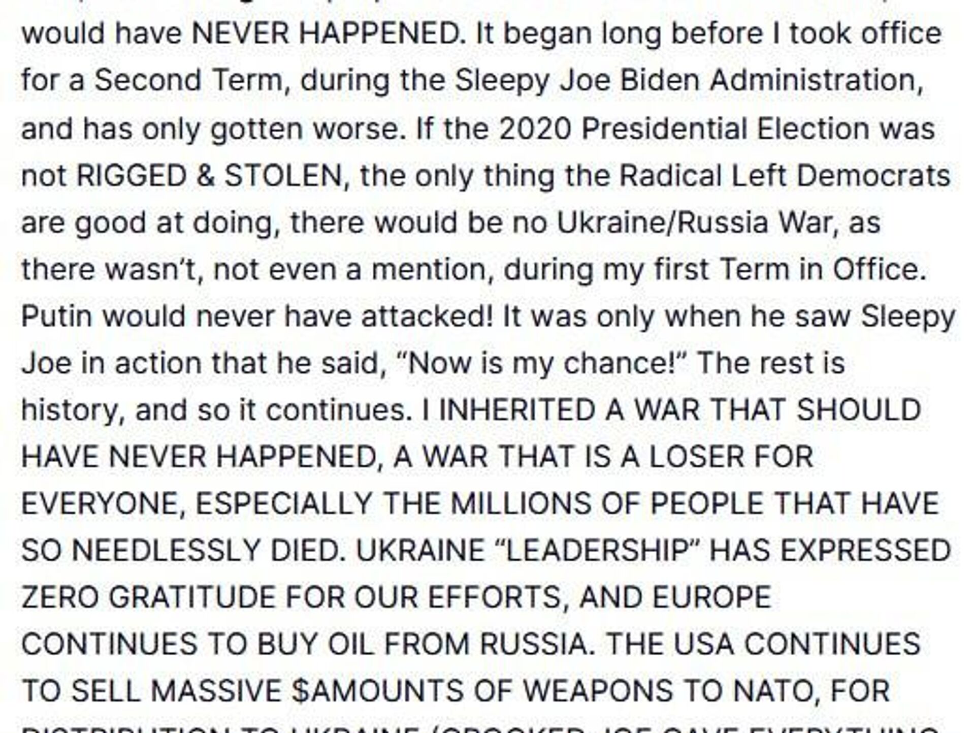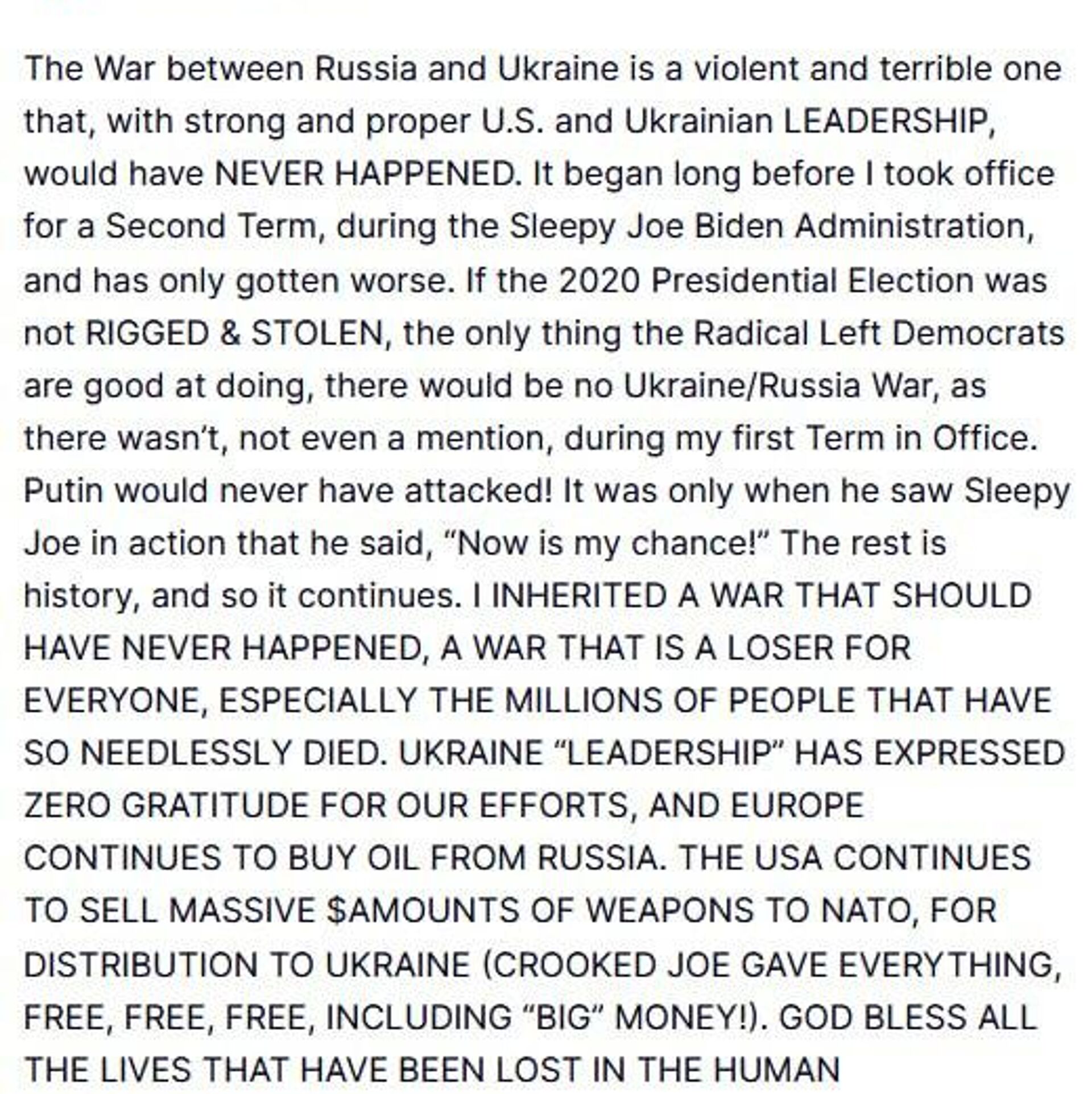 او کلمه «رهبری» را در گیومه قرار داد. رئیس جمهور ایالات متحده همچنین نوشت که اگر مقامات ایالات متحده و اوکراین به درستی مستقر شده بودند، هیچ جنگی در خاک اوکراین رخ نمیداد.
