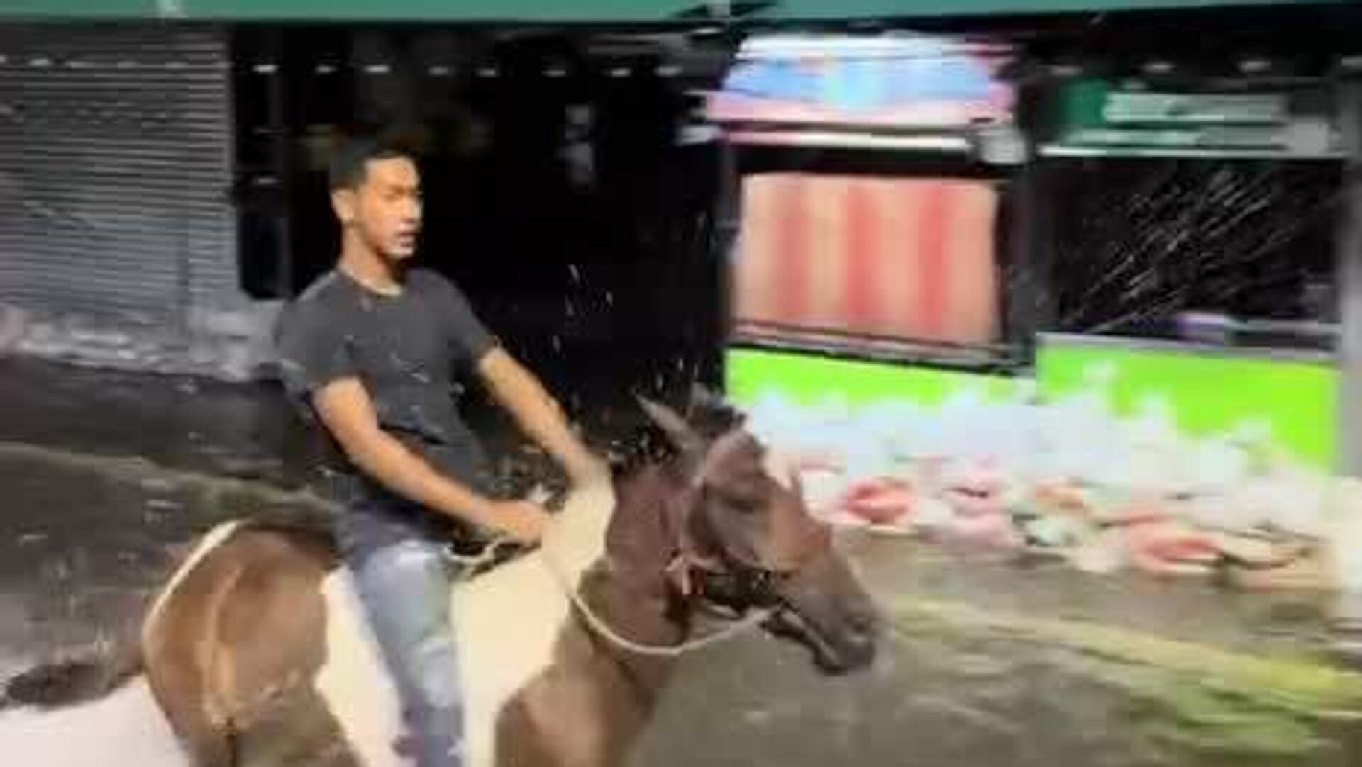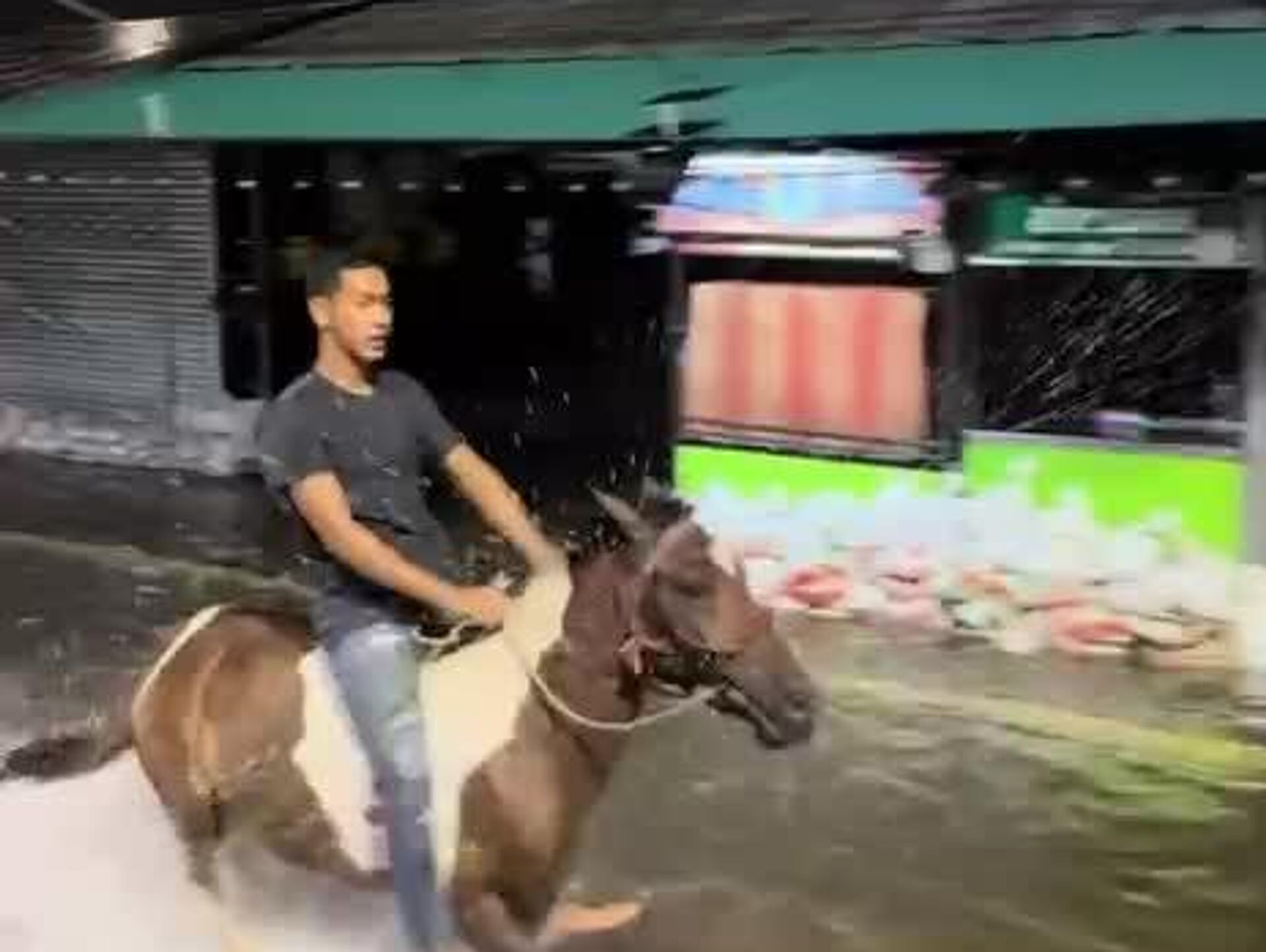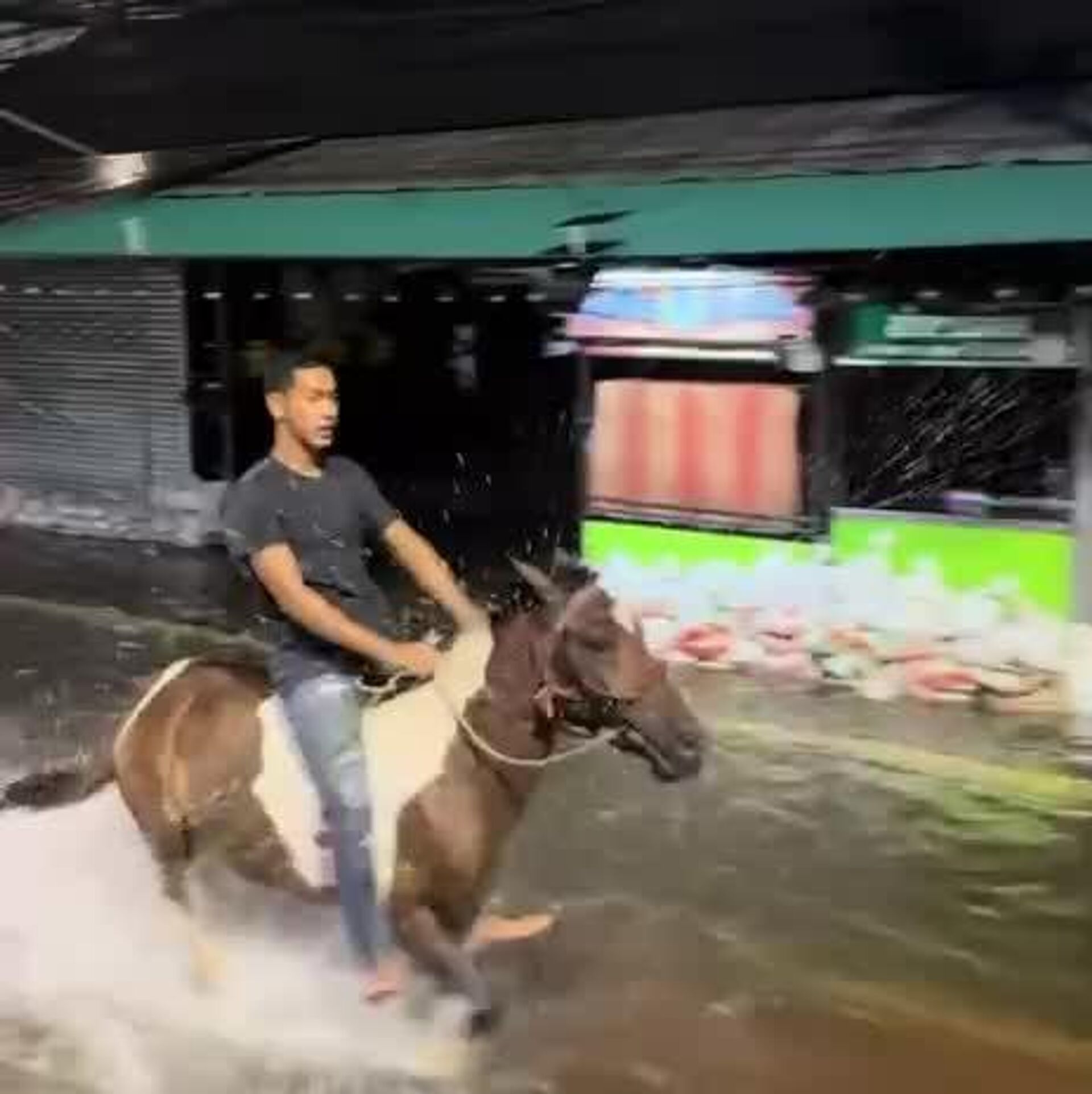 ▪ساکنان پاتانی، شهری در جنوب تایلند، تصمیم گرفتهاند برای عبور و مرور در خیابانهای سیلزده از اسب استفاده کنند.