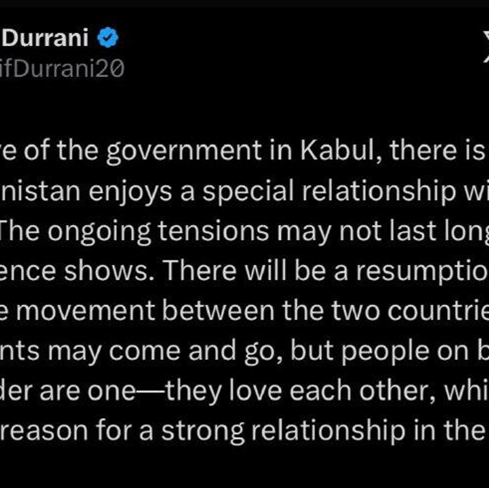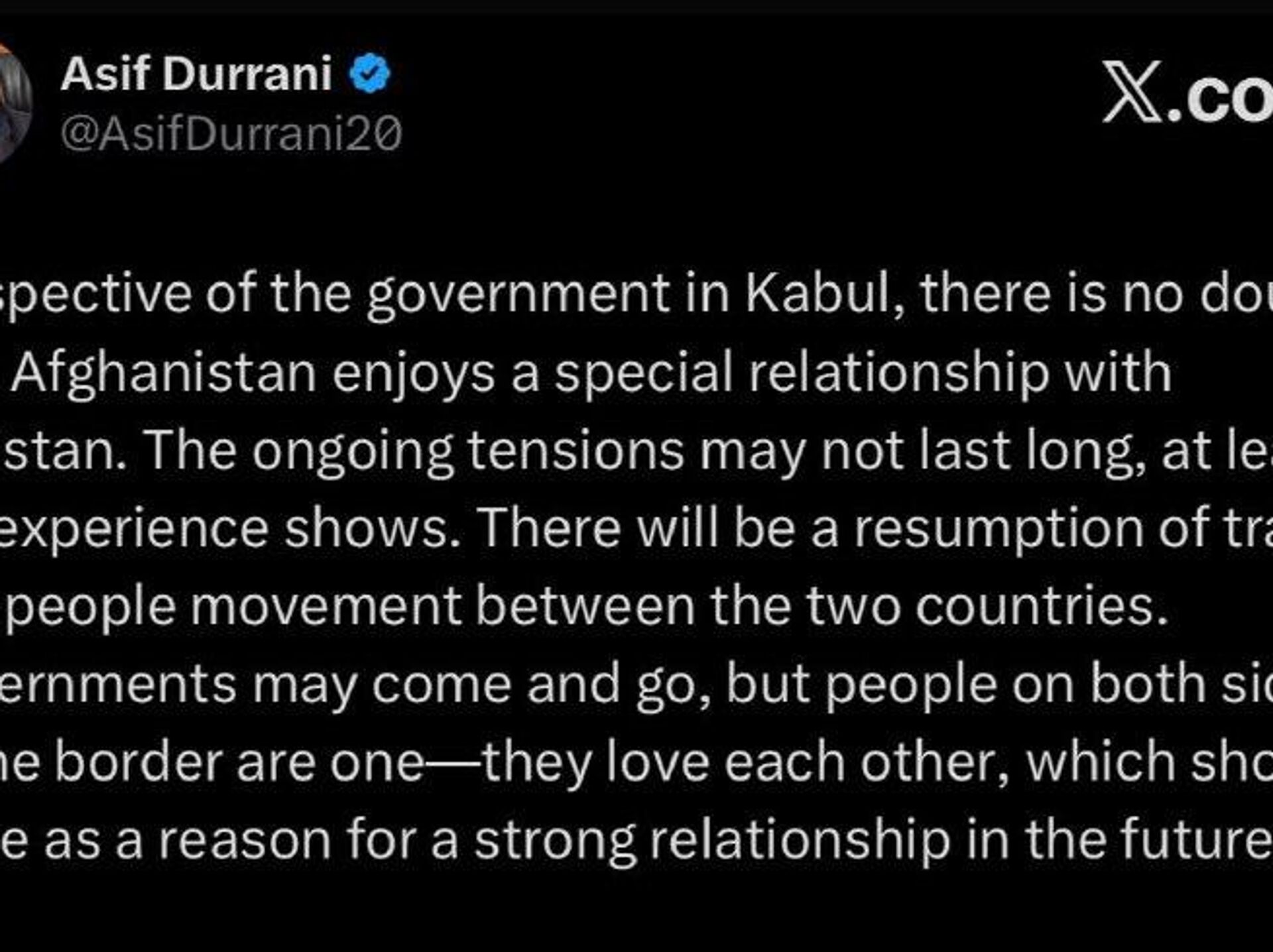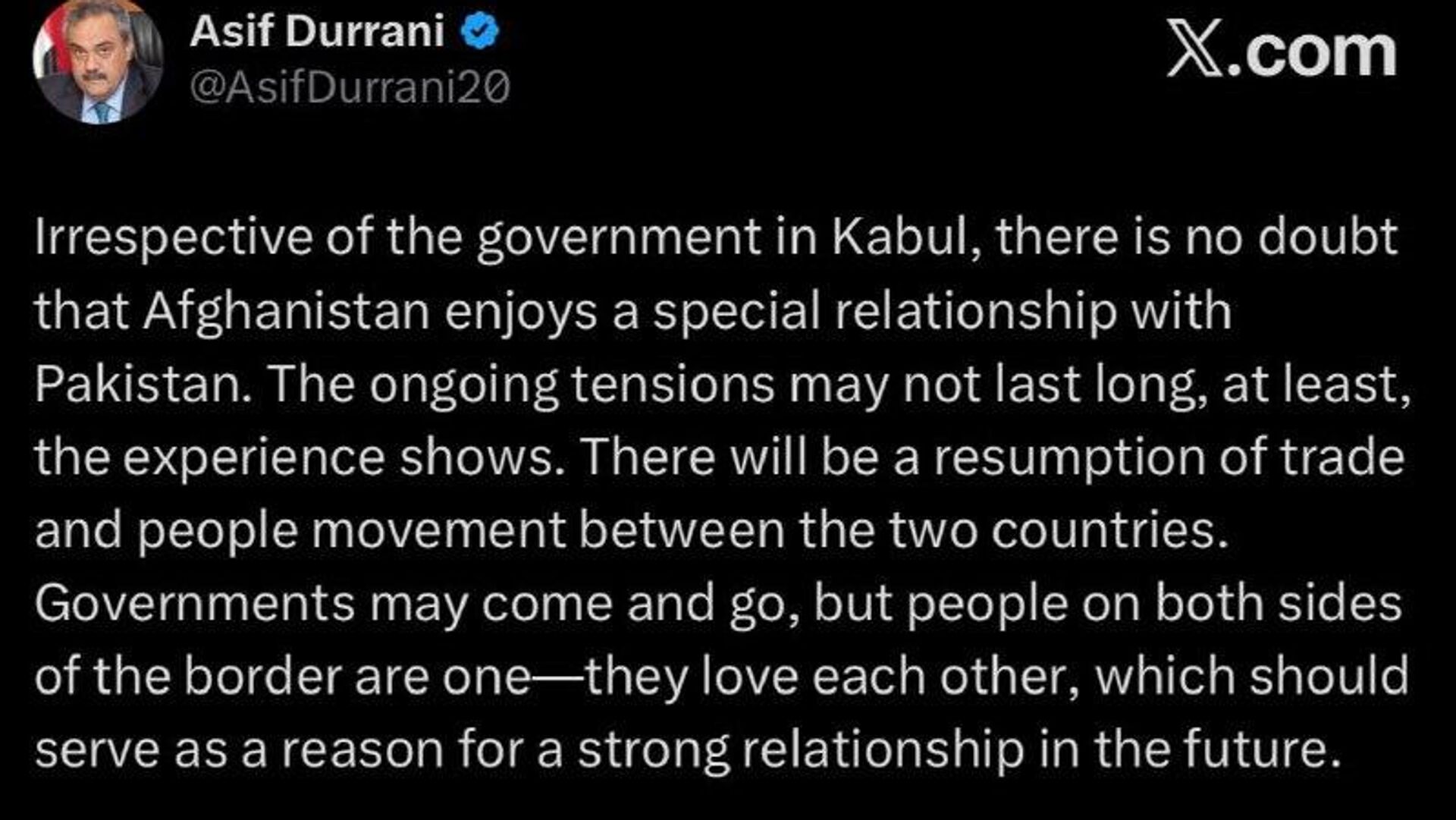 آصف درانی، نماینده ویژه پیشین پاکستان برای افغانستان، اعلام کرد که روابط تاریخی و دوستی دیرینه میان مردم افغانستان و پاکستان، با وجود نوسانهای سیاسی، پایهای محکم برای ازسرگیری تجارت و عادیسازی مناسبات دو کشور است.