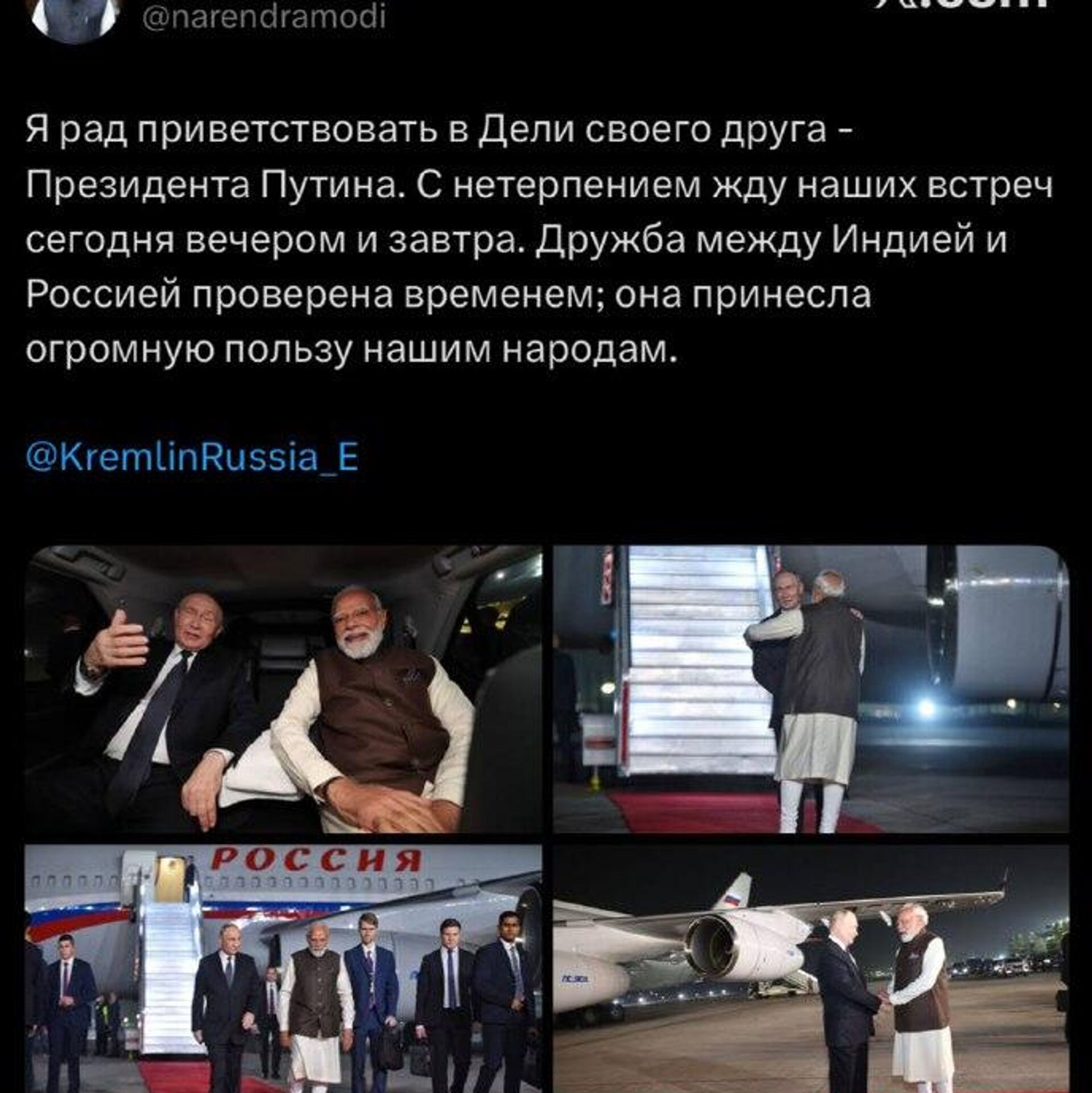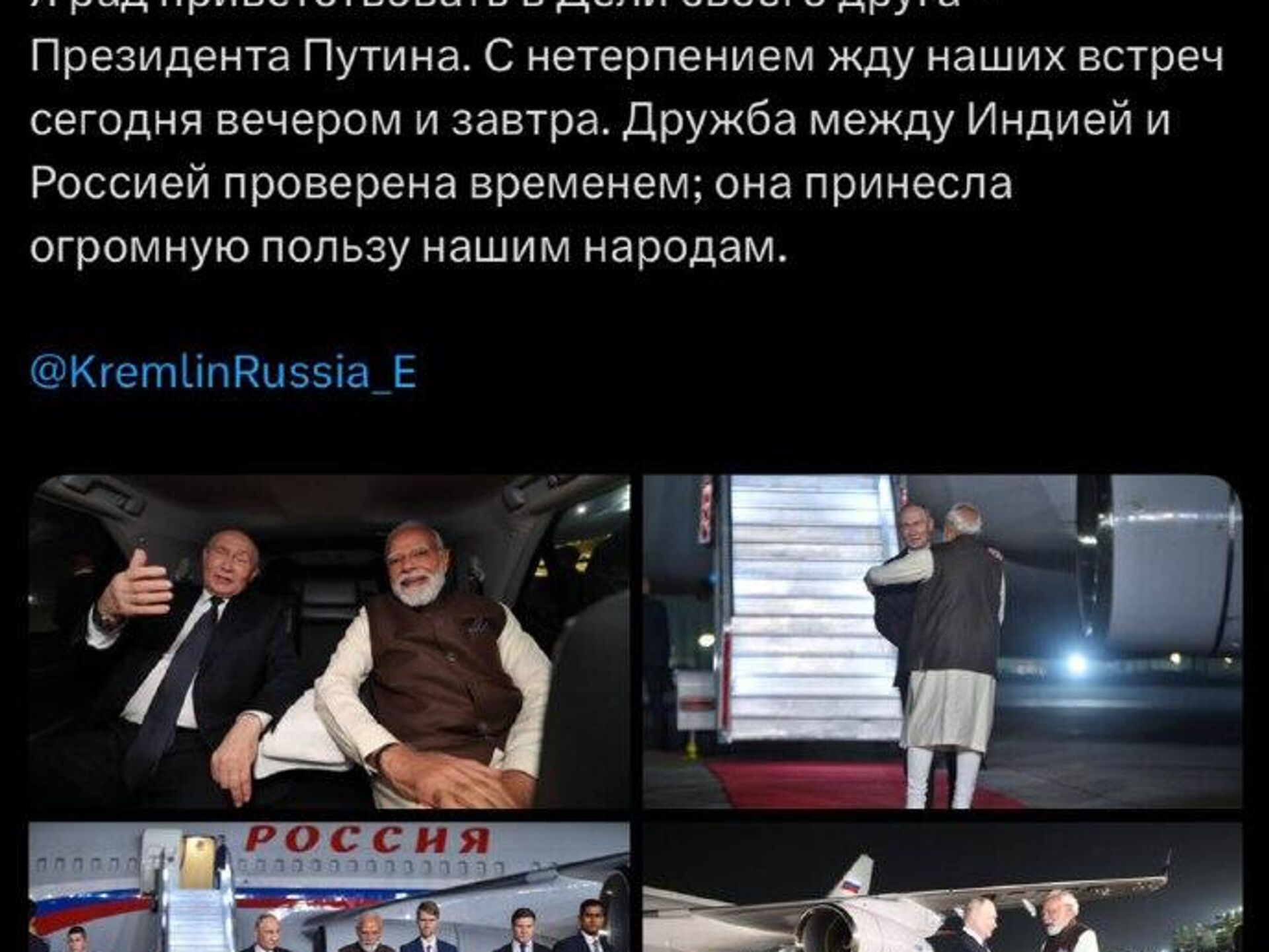 ◻مودی در پستی در شبكه اجتماعی "ایکس" با انتشار عکسی از دیدار خود با پوتین، به زبان روسی نوشت:" خوشحالم كه از دوست خود، رييس جمهور پوتين در هند استقبال ميكنم. مشتاقانه منتظر ديدار امشب و فرداى خود هستم."