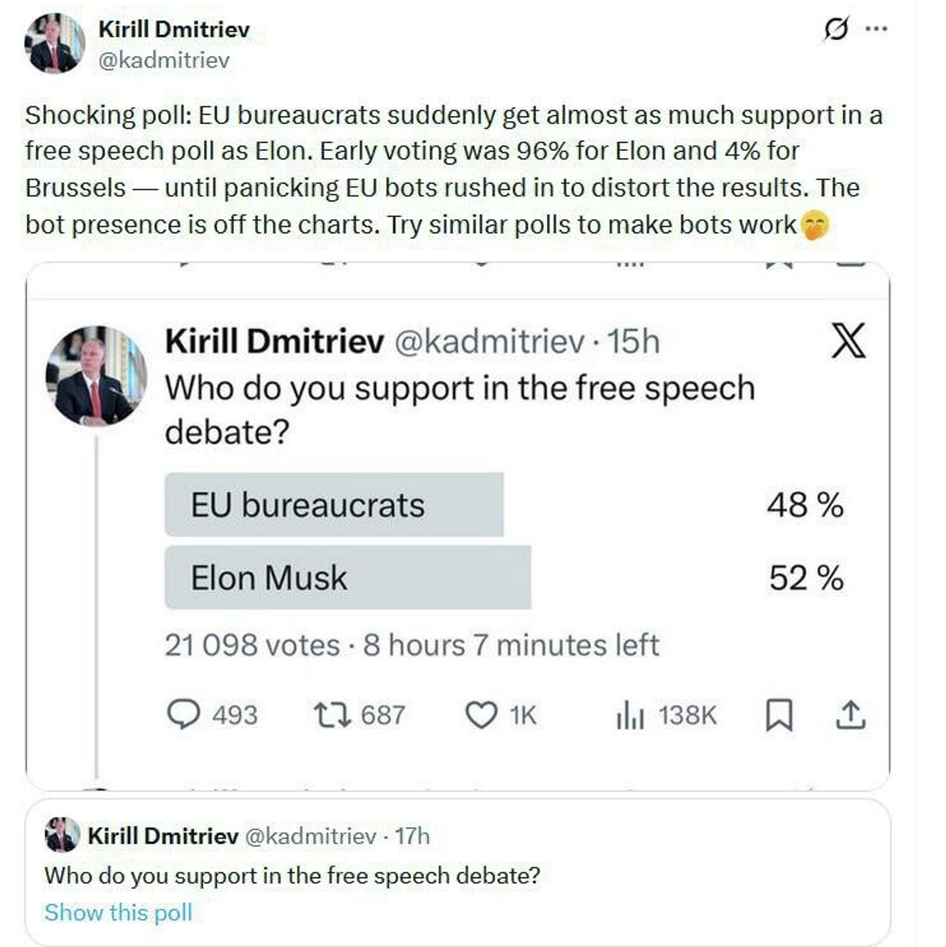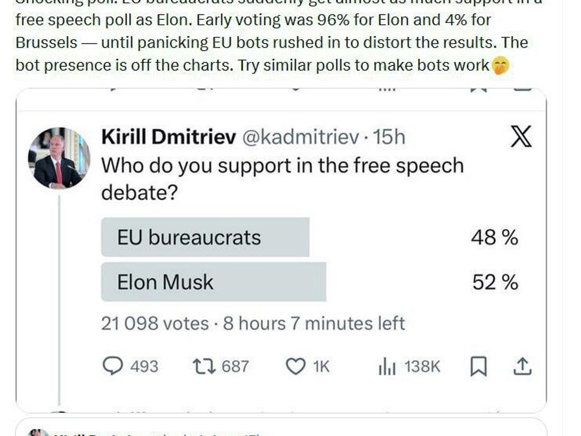 ◻کریل دیمیتریف، رئیس صندوق سرمایهگذاری مستقیم روسیه (RDIF) و نماینده ویژه رئیس جمهور در امور سرمایهگذاری و همکاری اقتصادی با کشورهای خارجی، میگوید بوروکراتهای اتحادیه اروپا ناگهان در نظرسنجی که او در ایکس راهاندازی کرده بود، به اندازه ایلان ماسک حمایت دریافت.