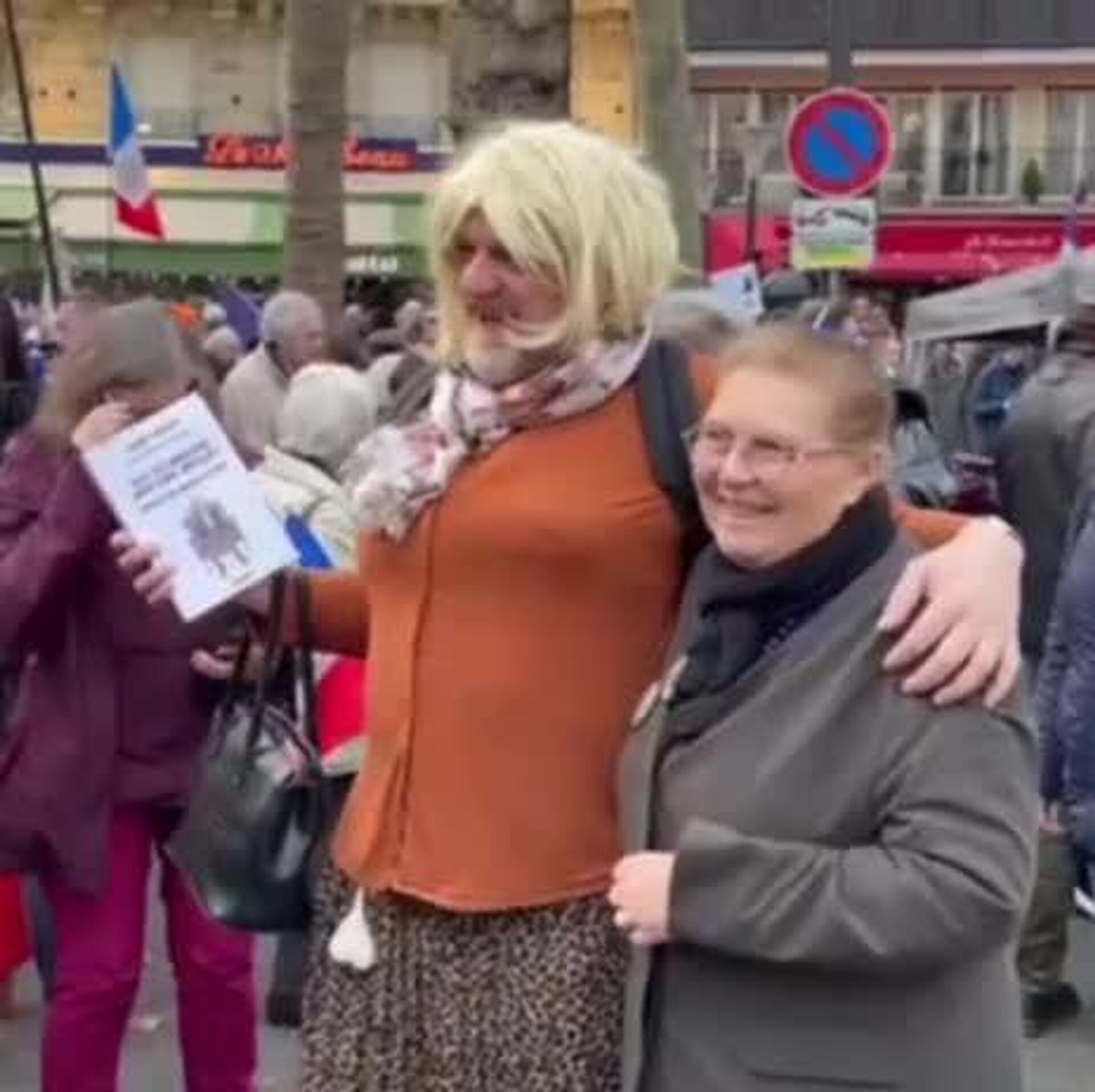 ◼ بر روی یکی از پلاکاردها نوشته شده است: «من روسیه هستم، من فرانسه هستم، من اوکراین هستم. تروریسم دولتی اروپا را متوقف کنید. اتحادیه اروپا در حال کشتن است. پاریس – بیرون از اتحادیه اروپا»