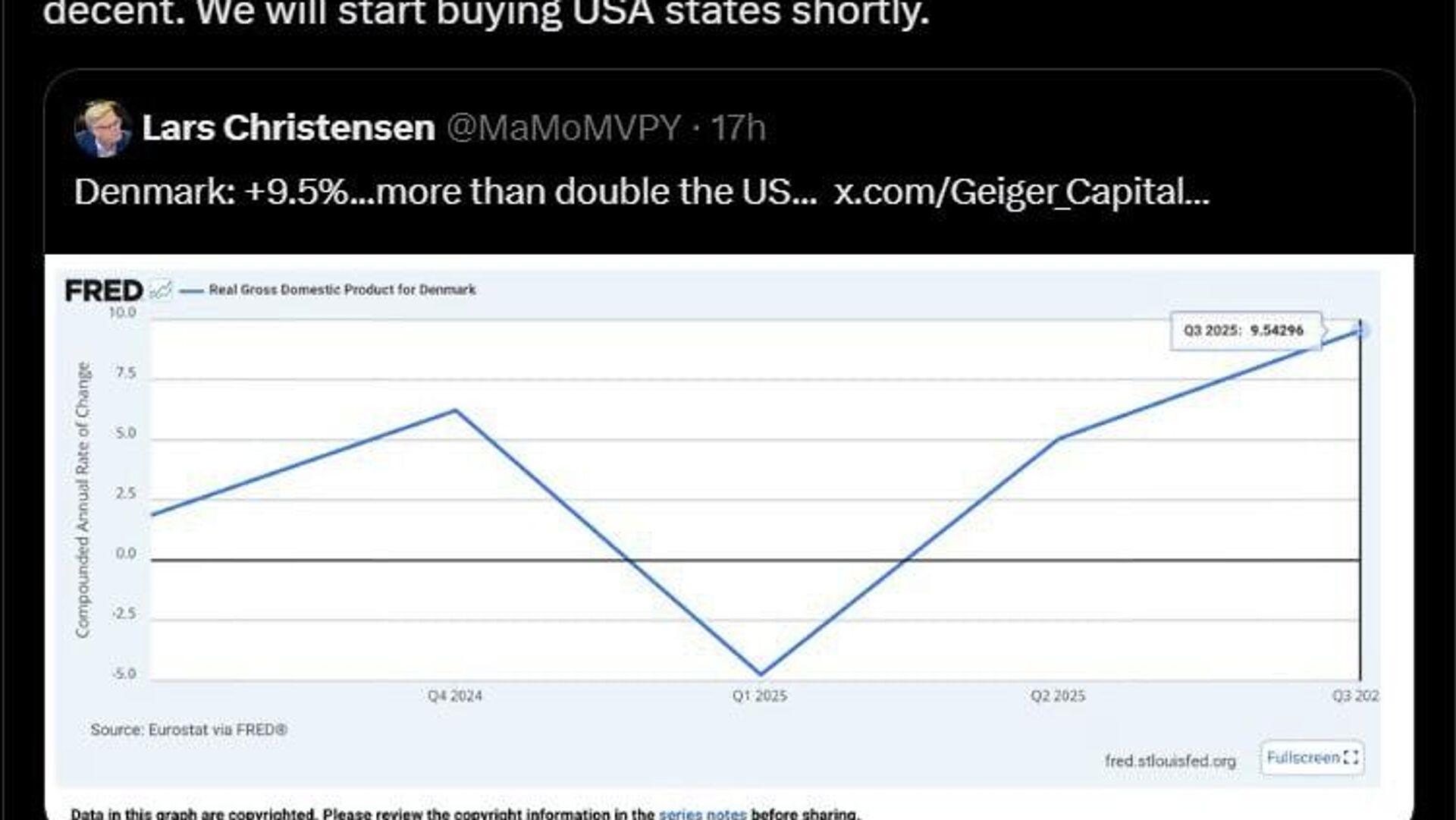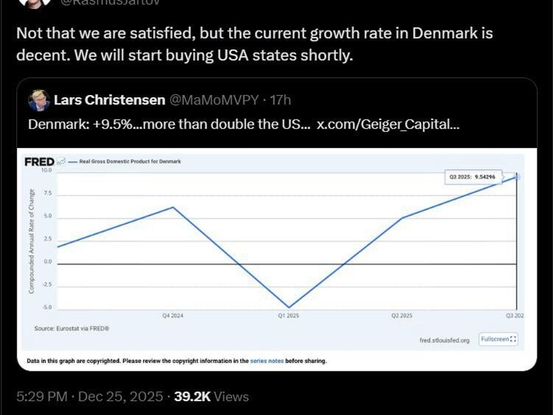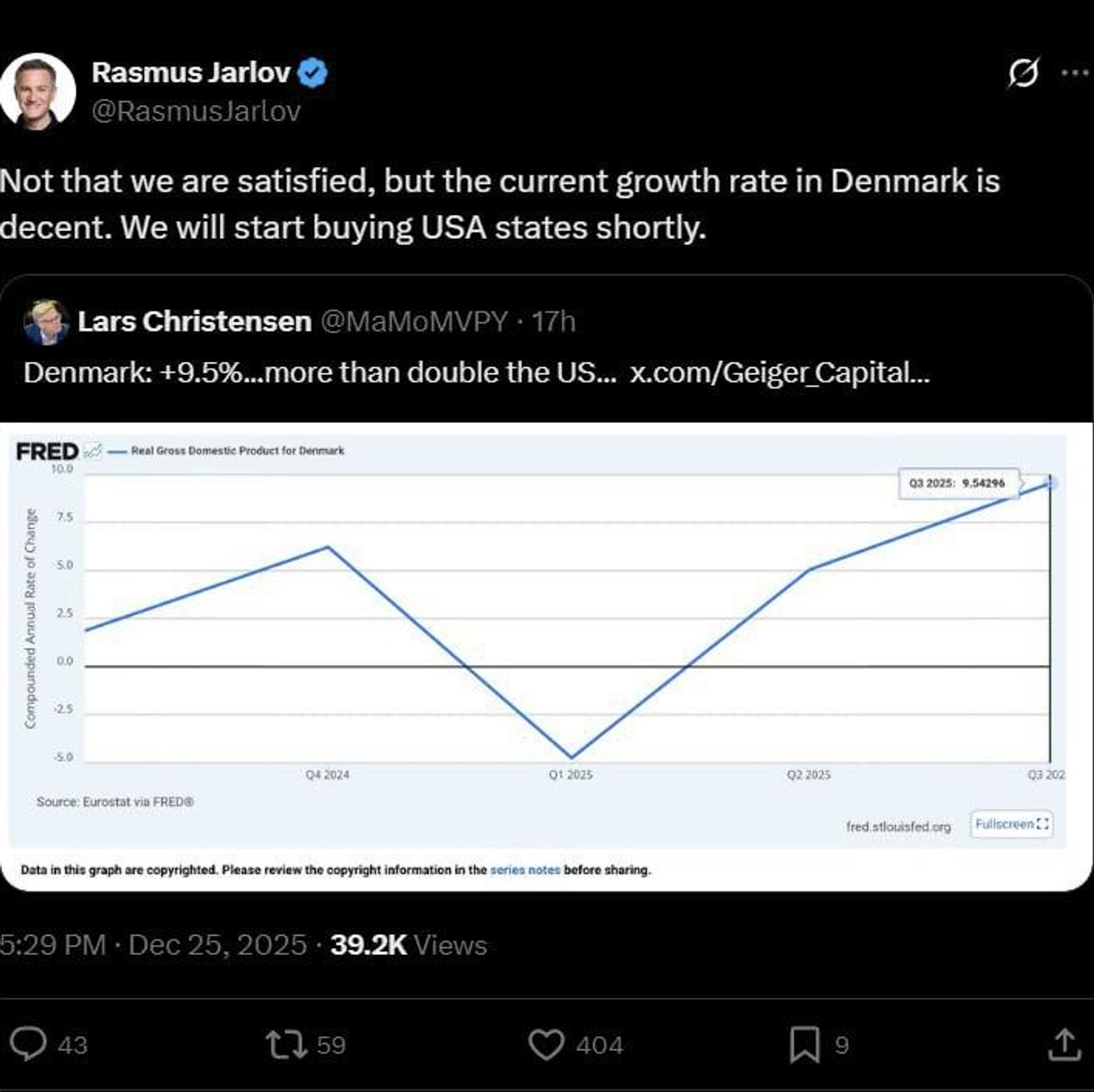 راسموس جارلوف، نماینده محافظهکار دانمارک و وزیر سابق تجارت، در 25 دسامبر توییت کرد که رشد اقتصادی دانمارک به اندازهای قوی است که میتواند خرید ایالتهای آمریکا را آغاز کند.