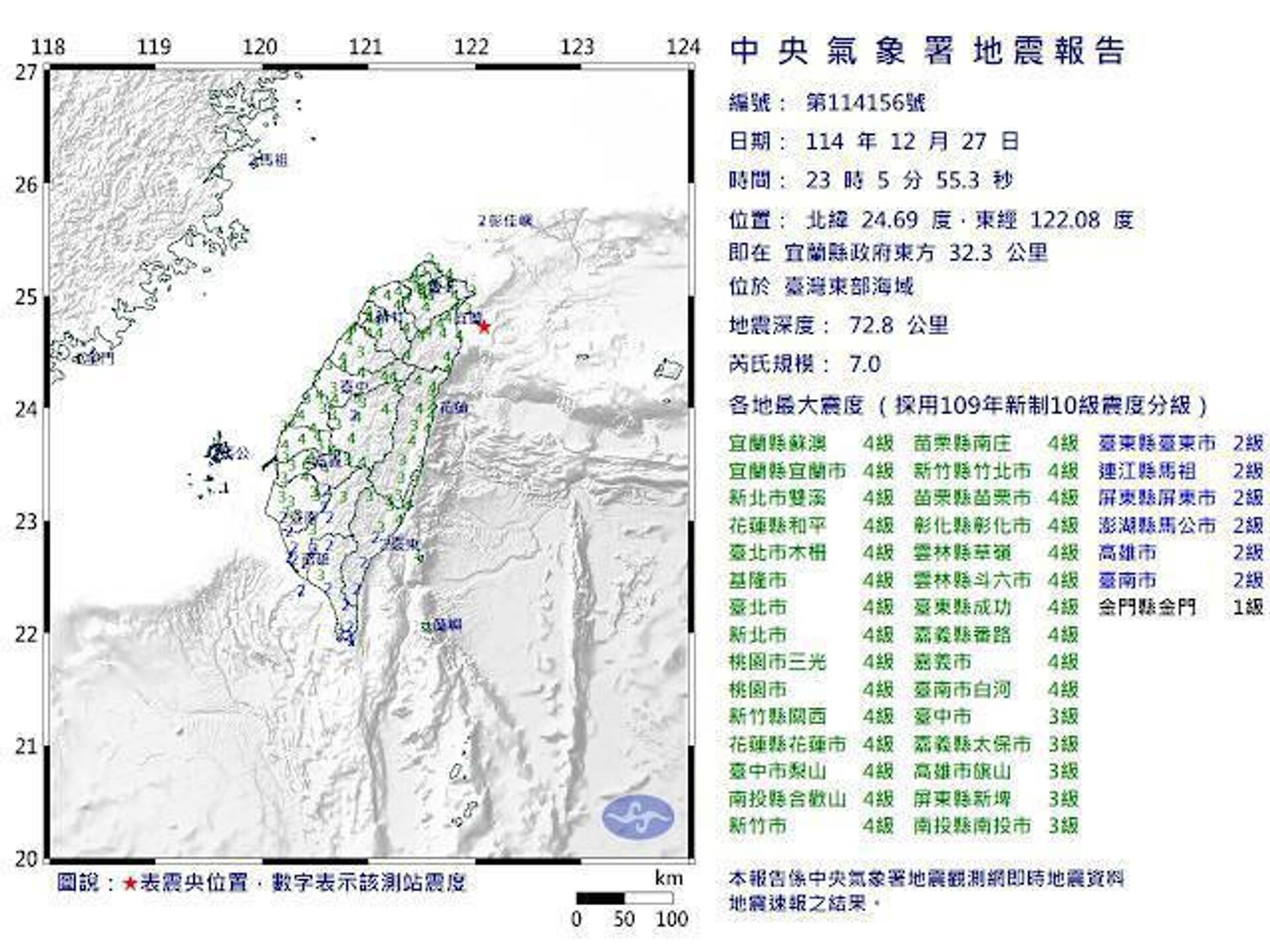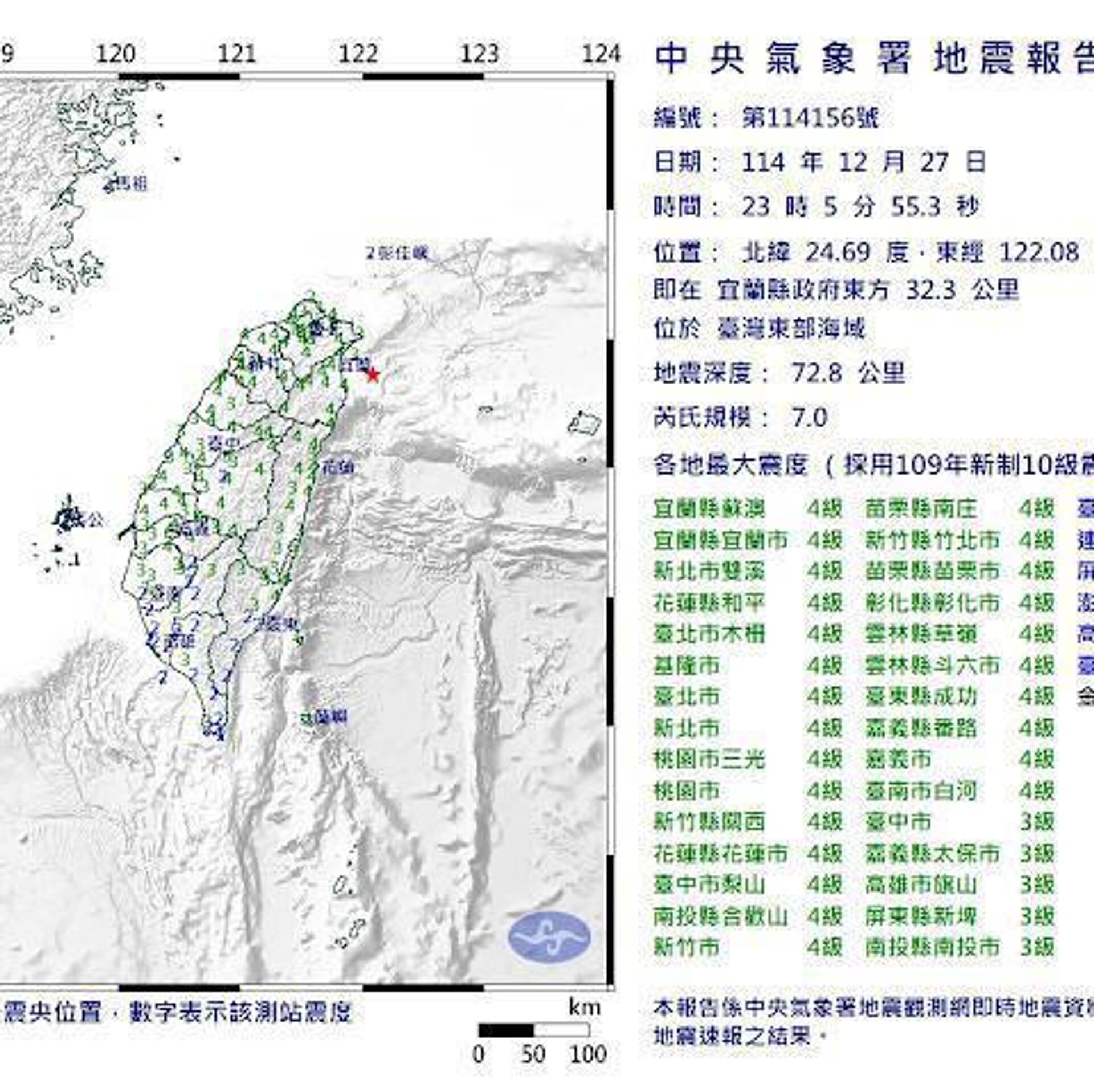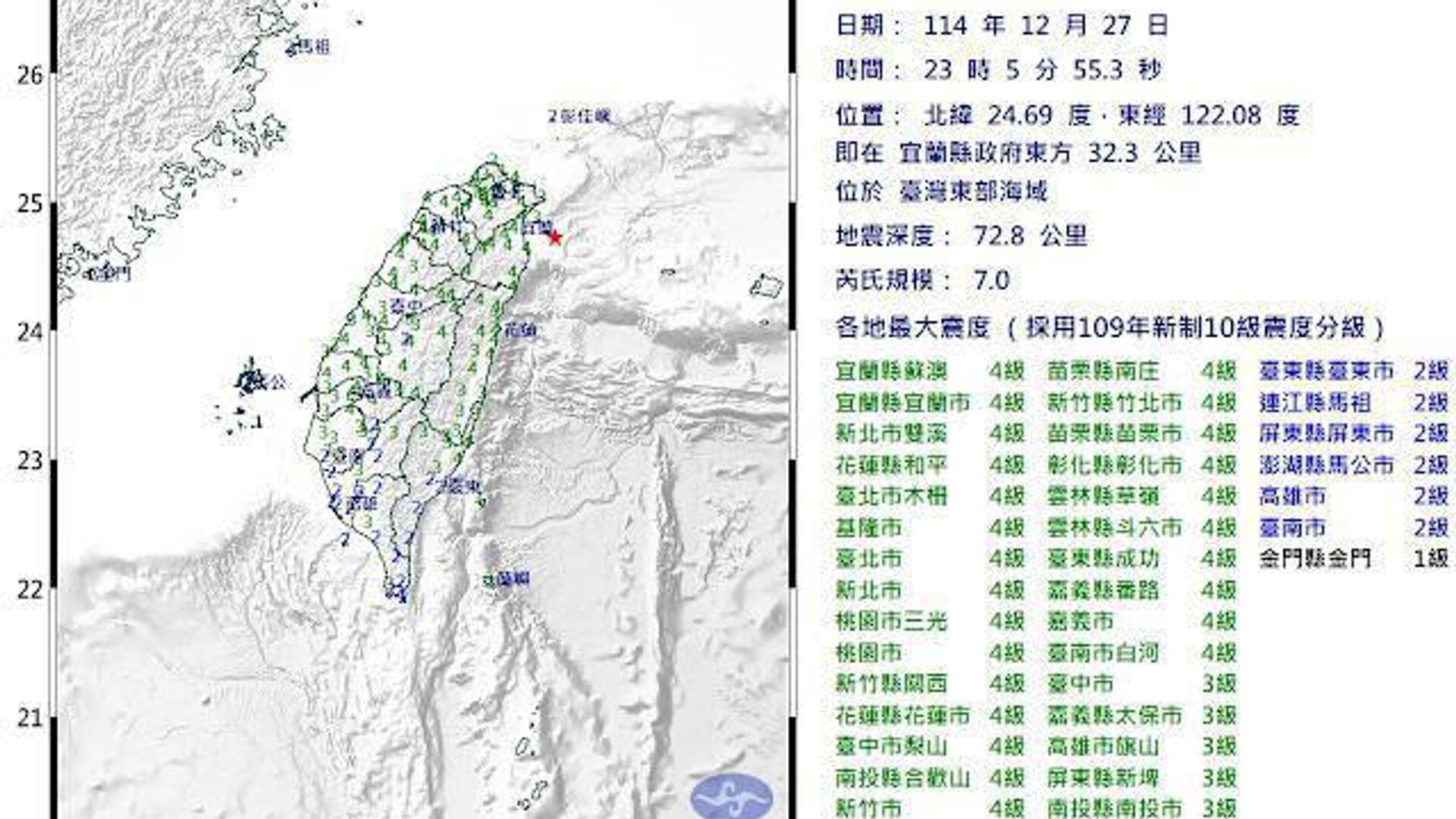 اداره هواشناسی مرکزی تایوان گزارش داد این لرزشها ساعت 11:05شب به وقت محلی، در 32.3 کیلومتری شرق شهر ییلان ثبت شده است. مرکز این زلزله در عمق 72.8 کیلومتری زمین بوده است.