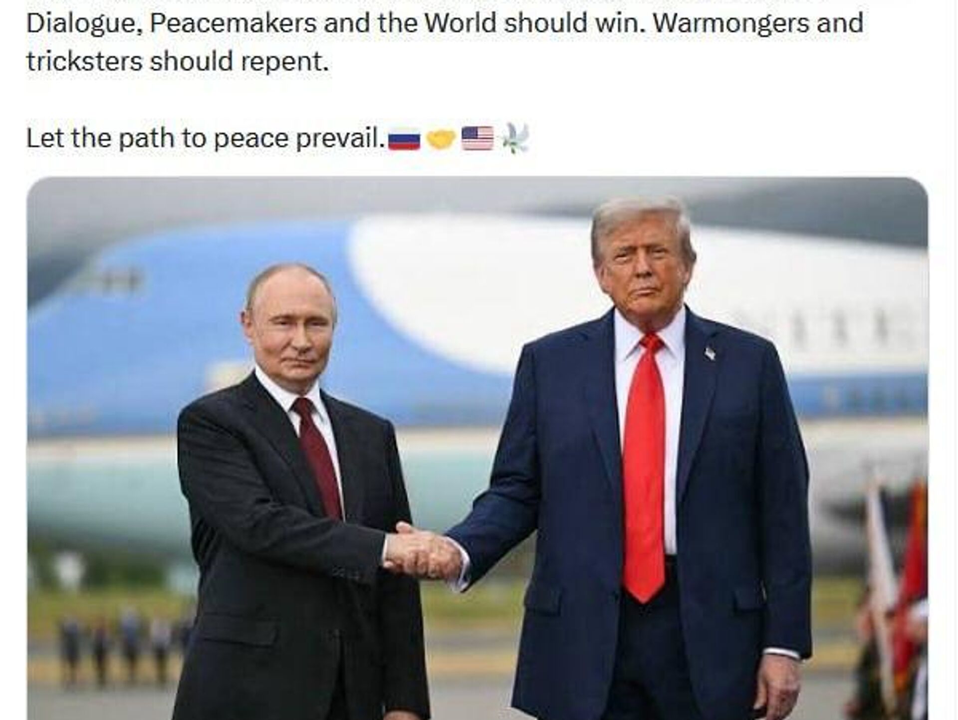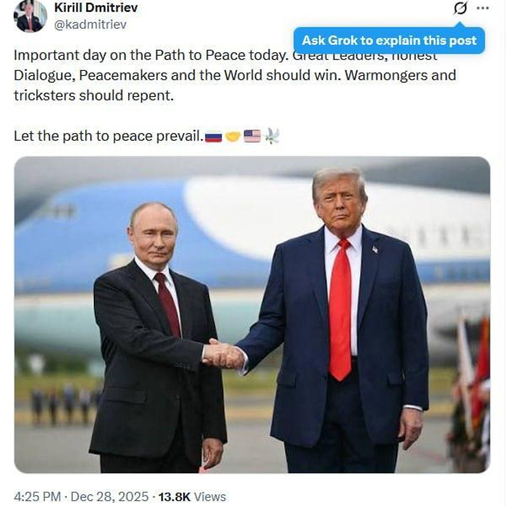 کیریل دیمیتریف، فرستاده ویژهٔ روسیه، عکسی از رؤسای جمهور ولادیمیر پوتین و دونالد ترامپ منتشر کرد:«بگذارید مسیر صلح پیروز شود»