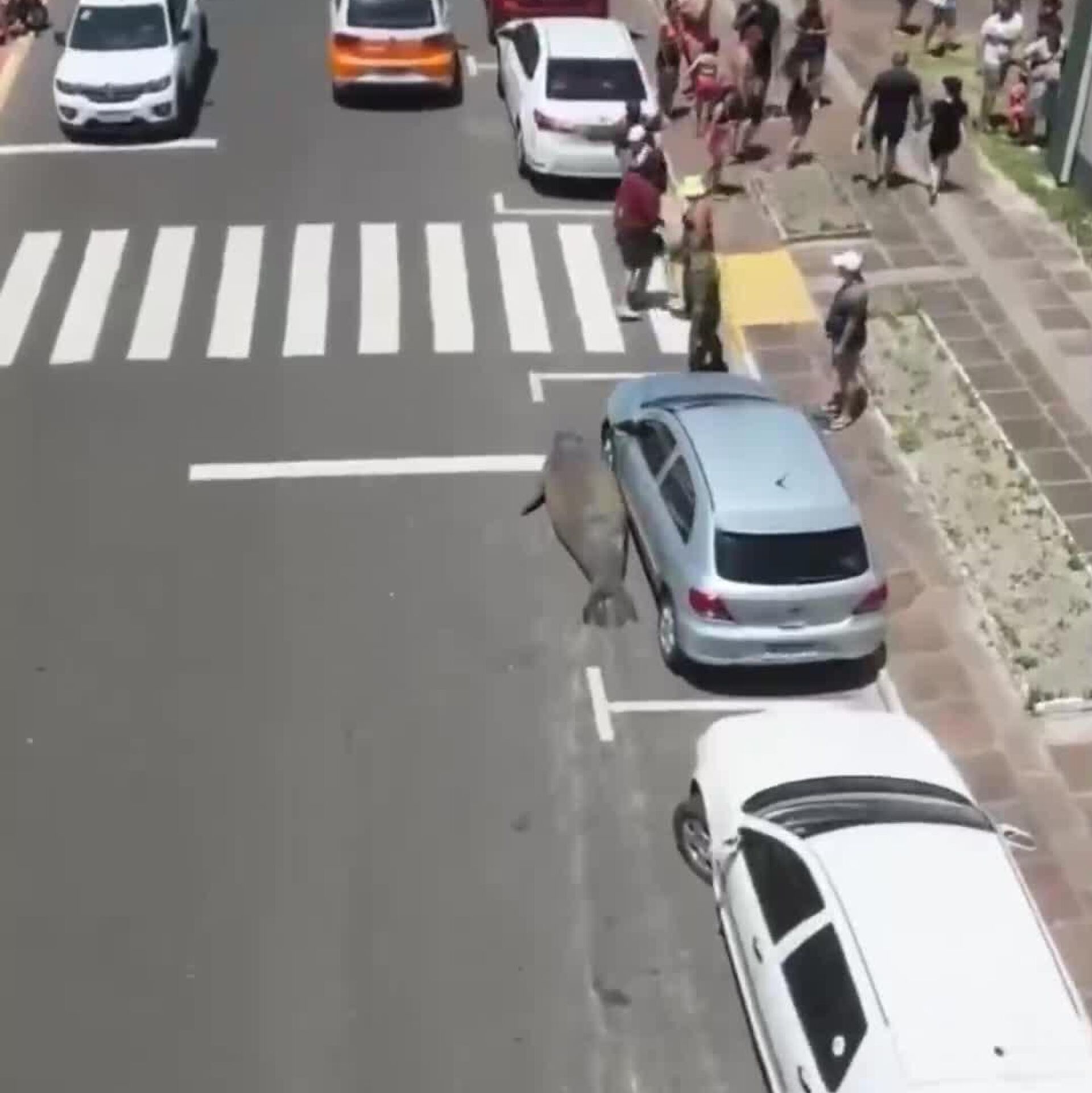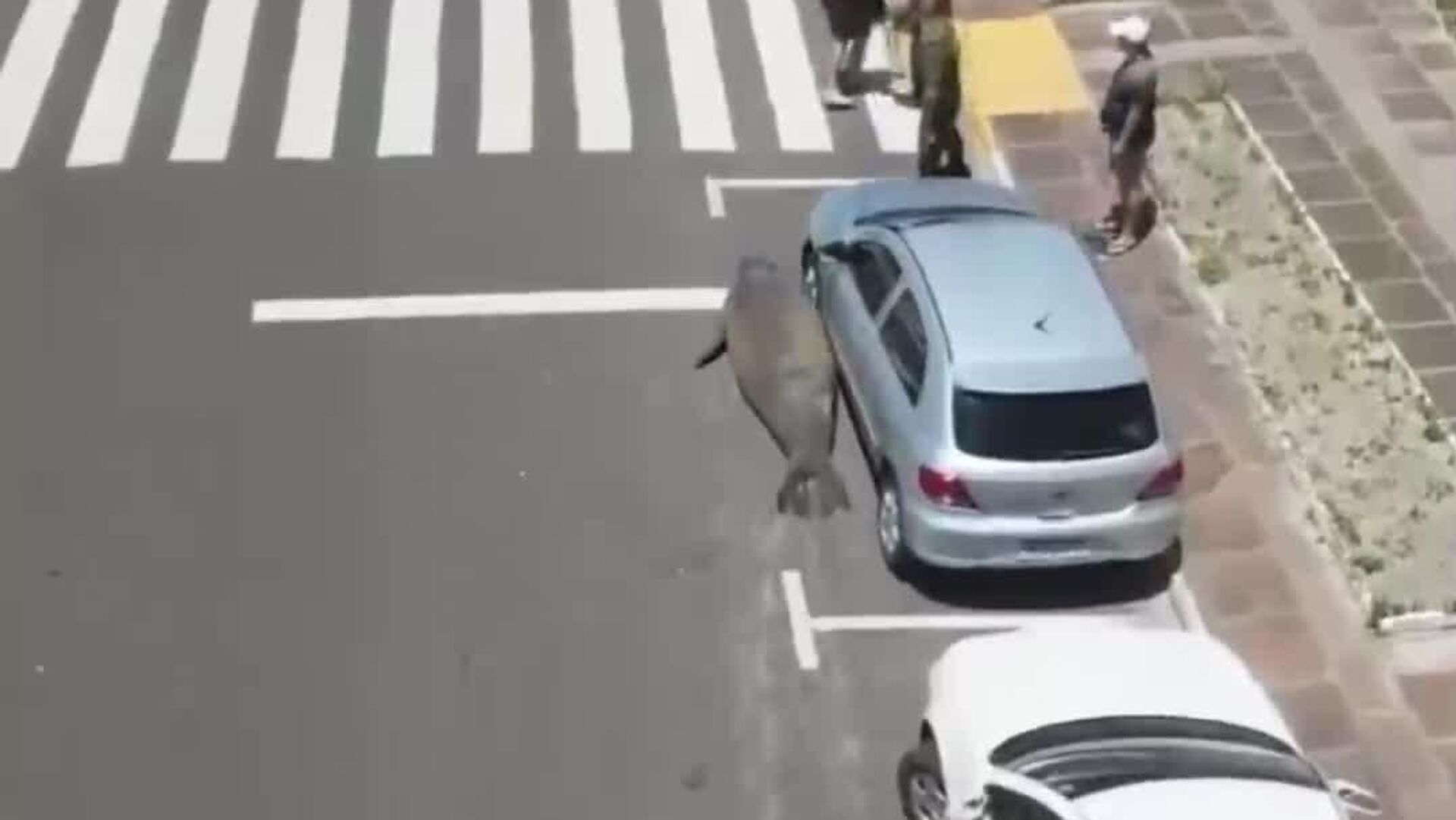 در ساحل تفرجگاه تراماندائی در ایالت ریو گرانده دو سول برزیل، گردشگران با دیدن یک فیل دریایی که ناگهان از اقیانوس بیرون آمد، شگفتزده شدند. این جانور با آرامش در امتداد ساحل حرکت میکرد و حتی از جاده ساحلی نیز گذشت.