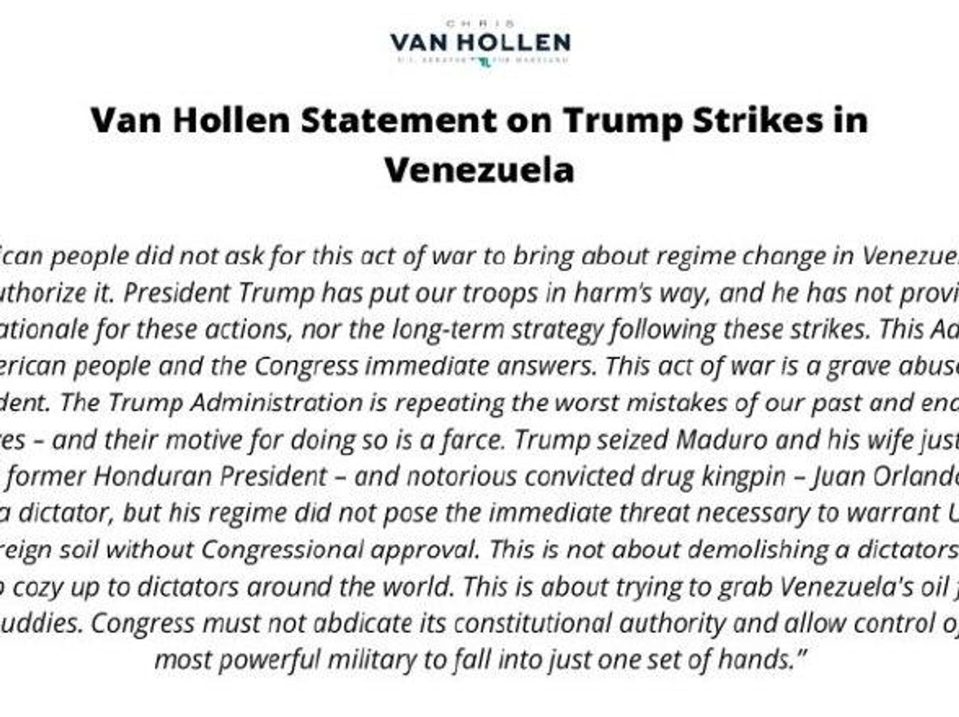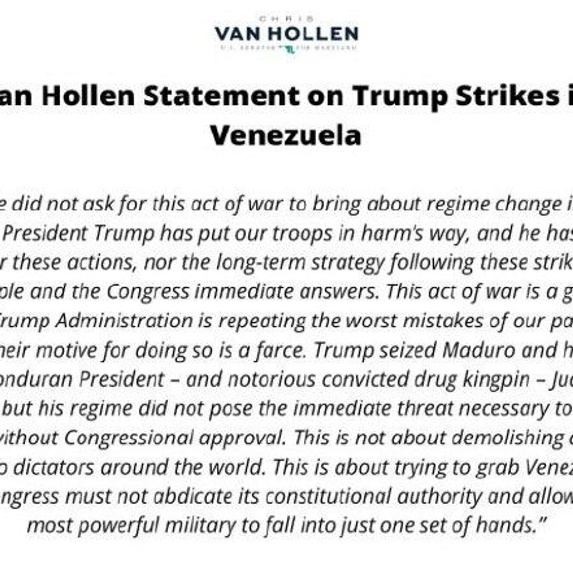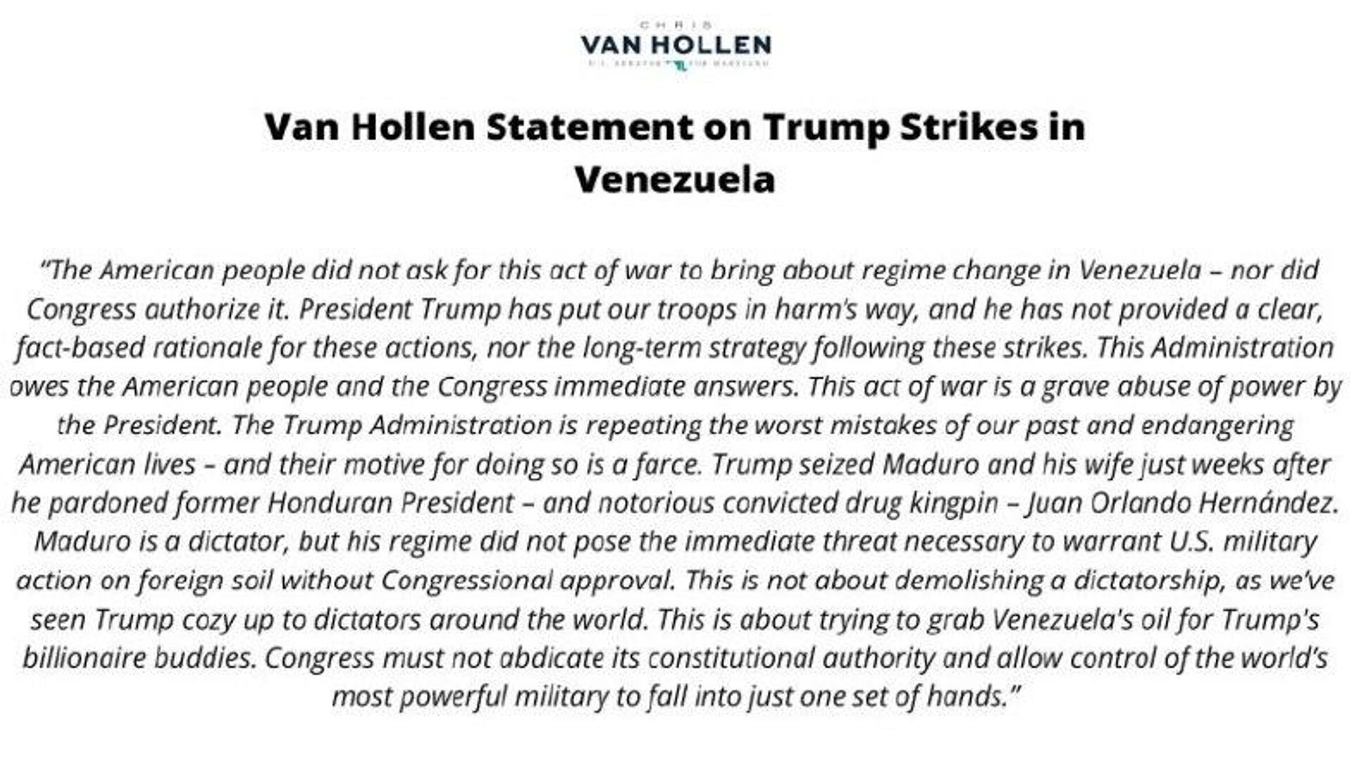 سناتور کریس ون هالن: این اقدام «یک عمل جنگی غیرقانونی» است، صرفنظر از اینکه کاخ سفید چگونه سعی کند آن را «توجیه کند».