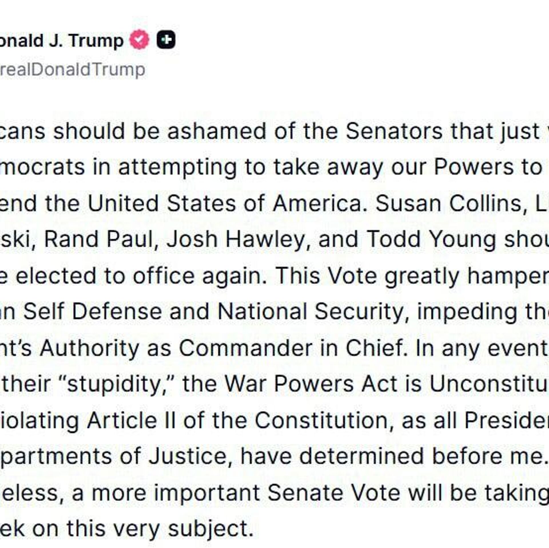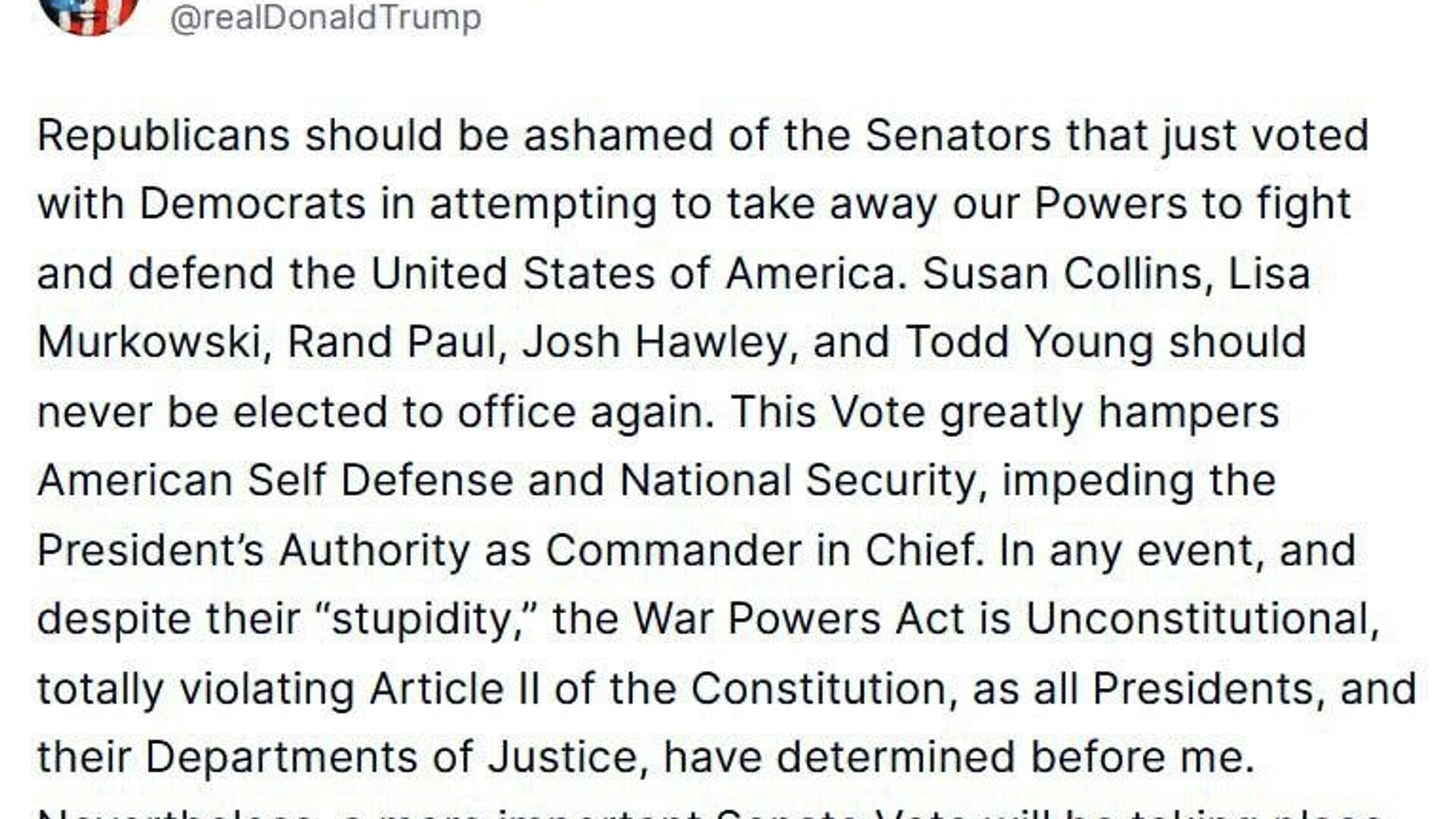 ◻دونالد ترامپ، رئیس جمهور آمریکا نوشت: جمهوریخواهانی که به همراه دموکراتها به سلب اختیارات ما برای دفاع از ایالات متحده رأی دادند، هرگز نباید دوباره به قدرت انتخاب شوند.