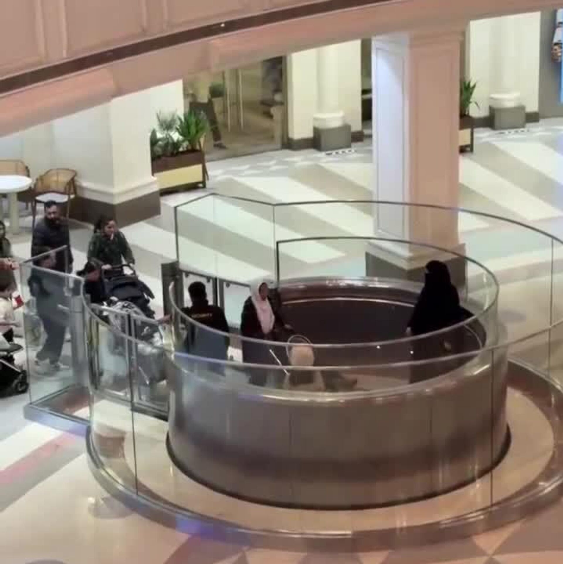 در یک مرکز خرید در عربستان سعودی، یک لیفت غیرمعمول توجه همگان را جلب کرده است: کابینی دایرهای شکل و باز که به نظر میرسد بین طبقات شناور است.