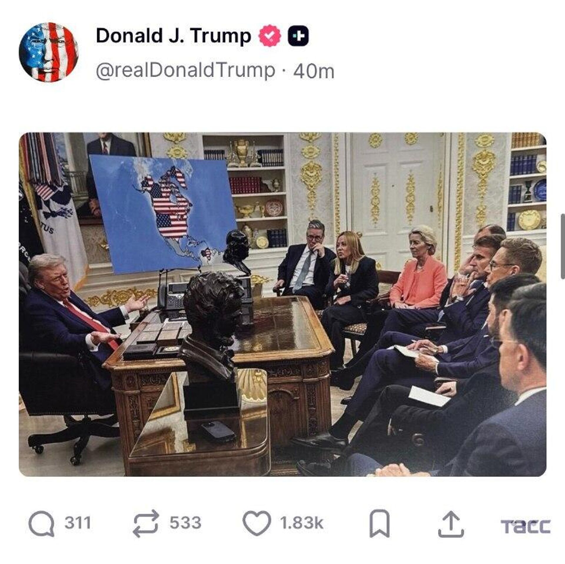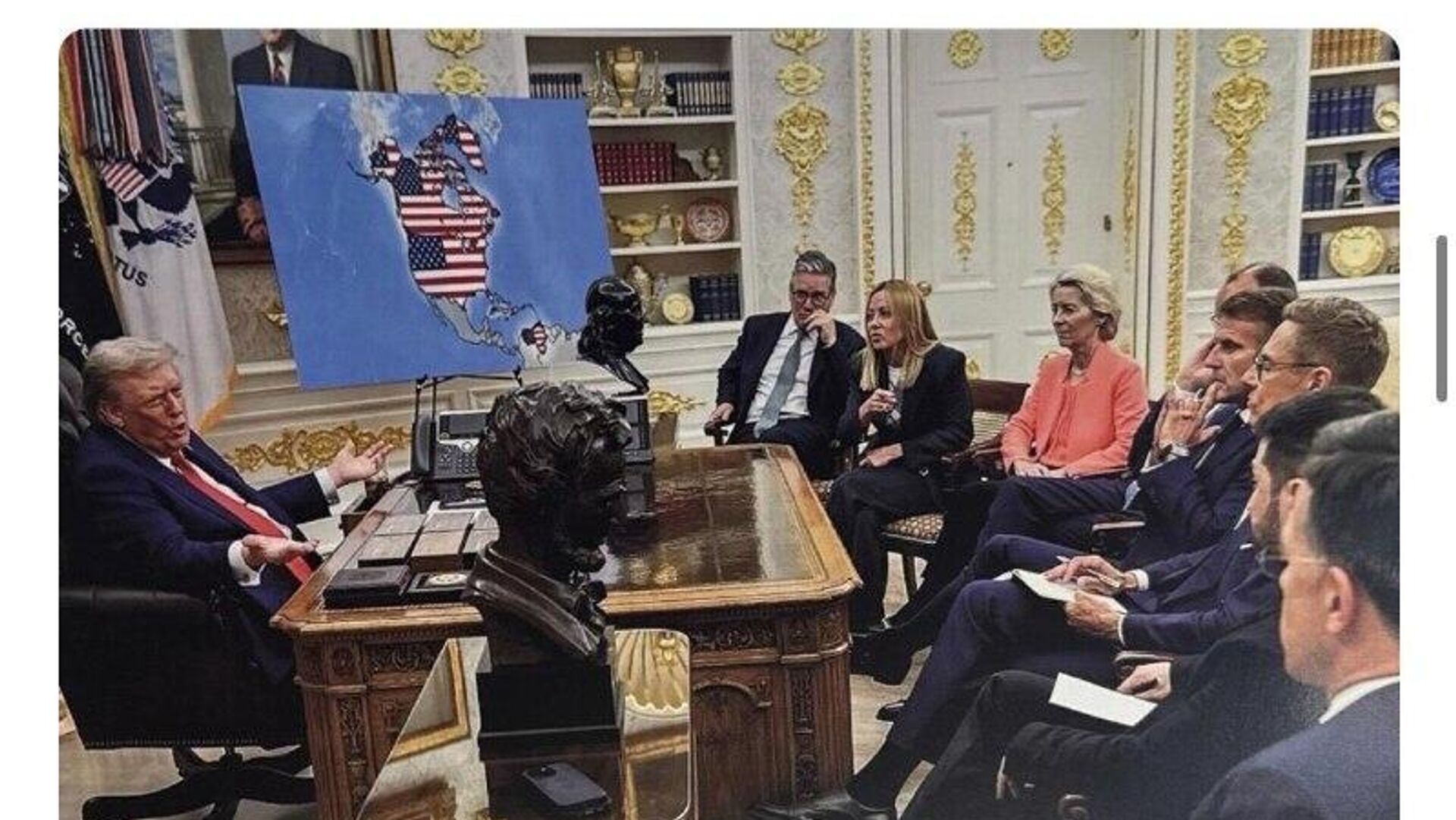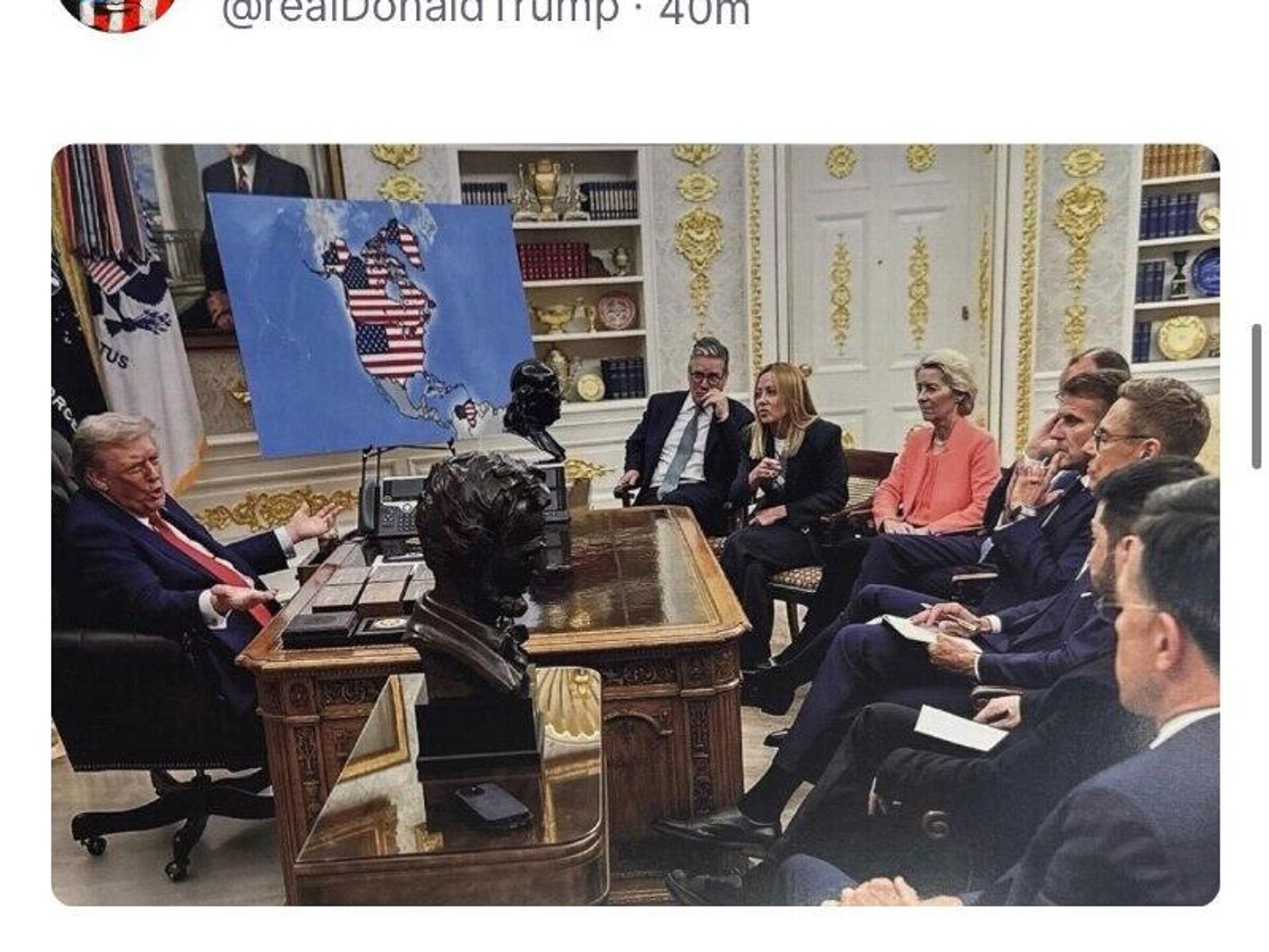 رئیسجمهور همچنین پستی منتشر کرده که او را در دفتر بیضوی در کنار رهبران اتحادیه اروپا نشان میدهد. در پسزمینه، نقشه بزرگی از ایالات متحده به همراه کانادا، گرینلند و ونزوئلا قرار دارد.