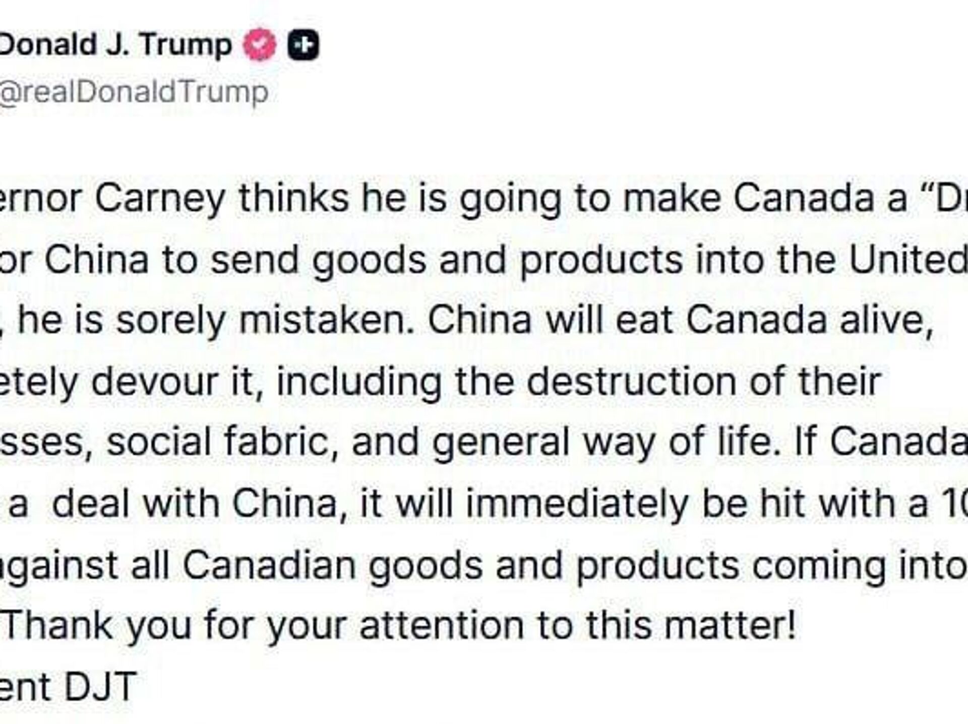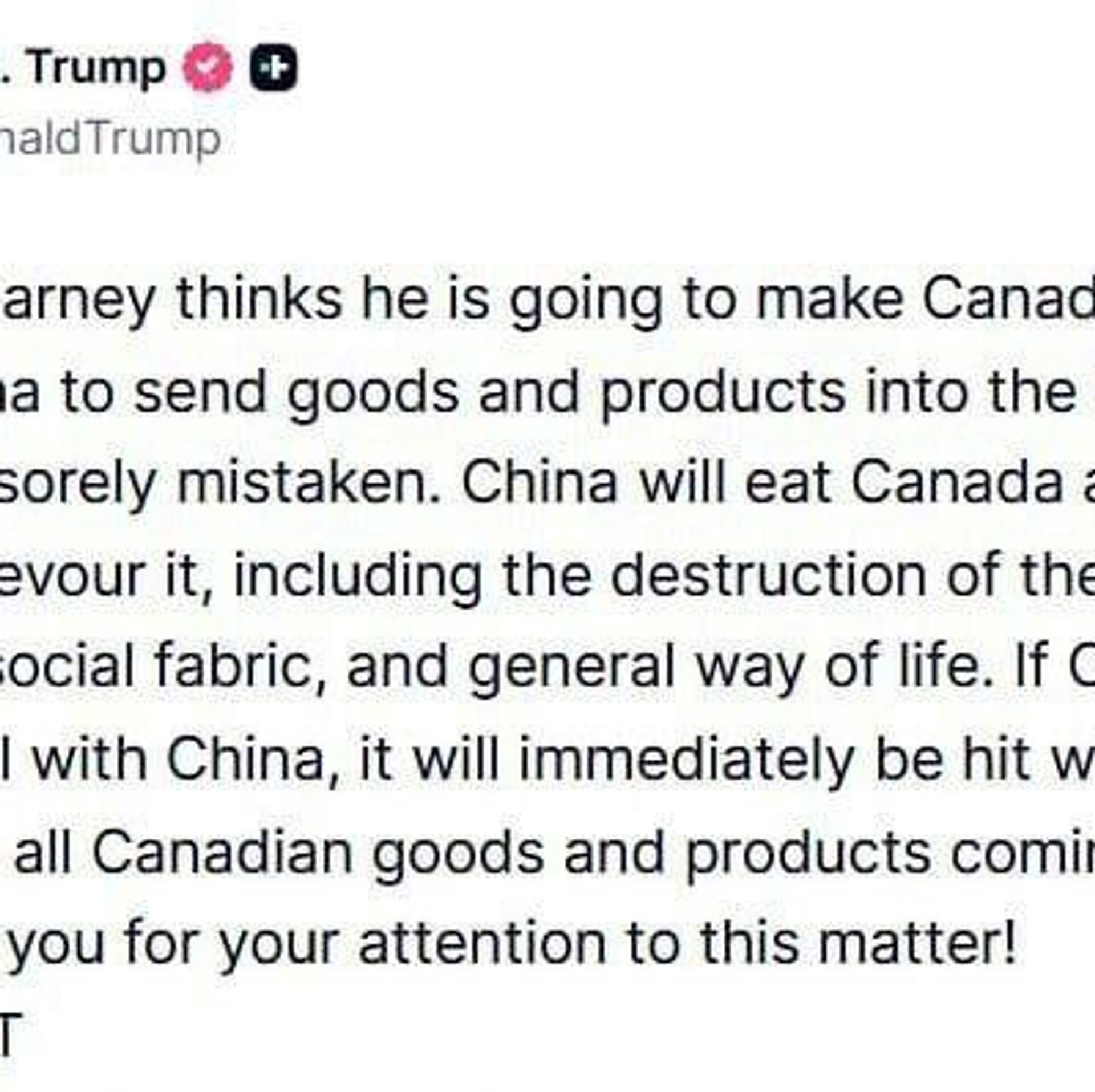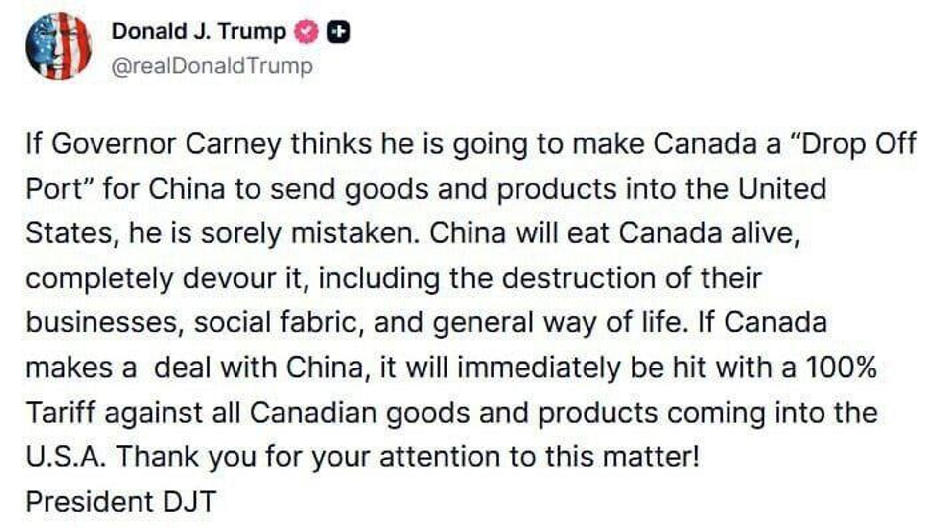 ◼ دونالد ترامپ در تروث سوشال نوشت: ایالات متحده در صورت بستن هرگونه توافق بازرگانی بین کانادا و چین، تعرفههای 100 درصدی بر کالاهای وارداتی از این کشور اعمال خواهد کرد.