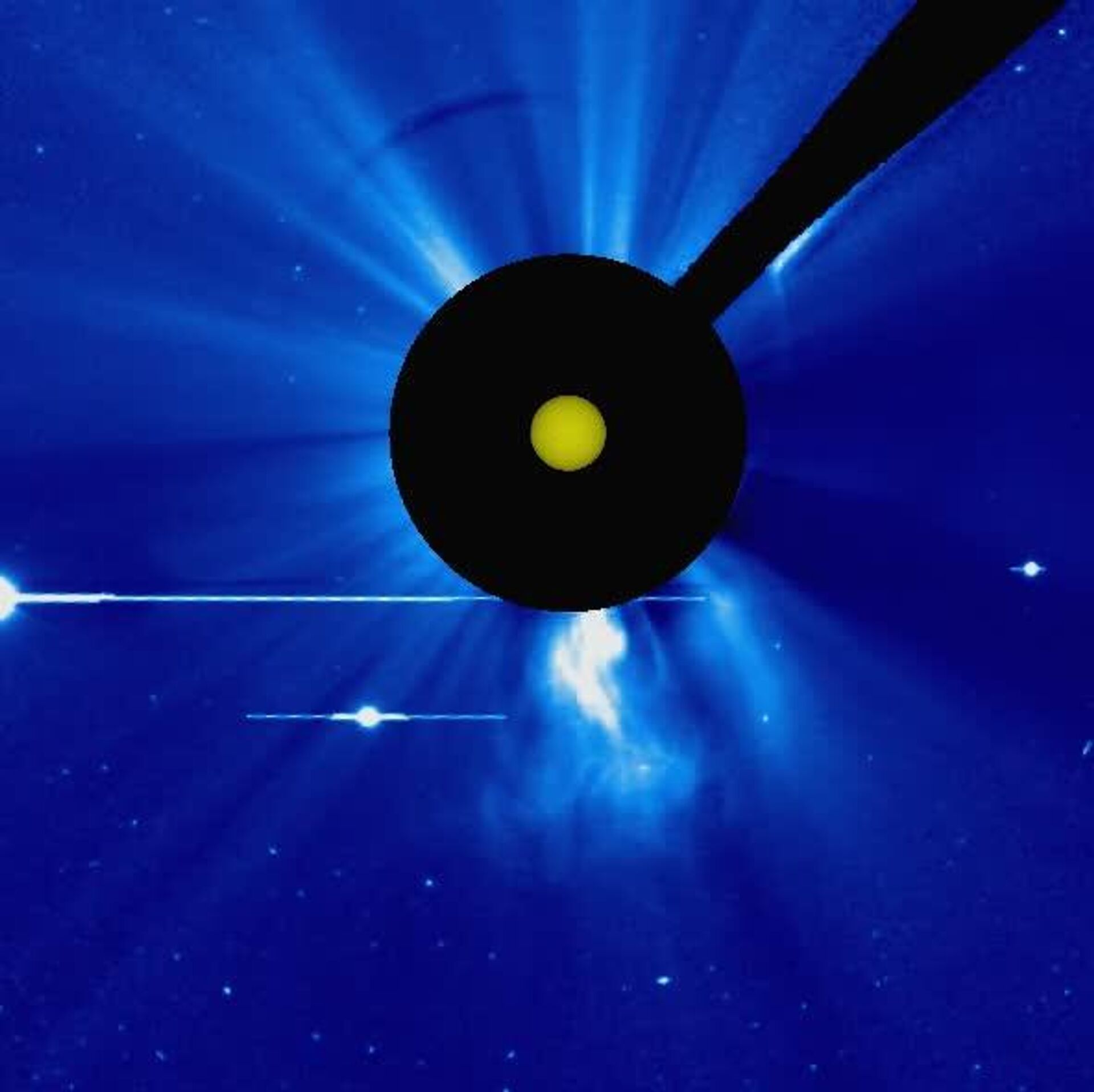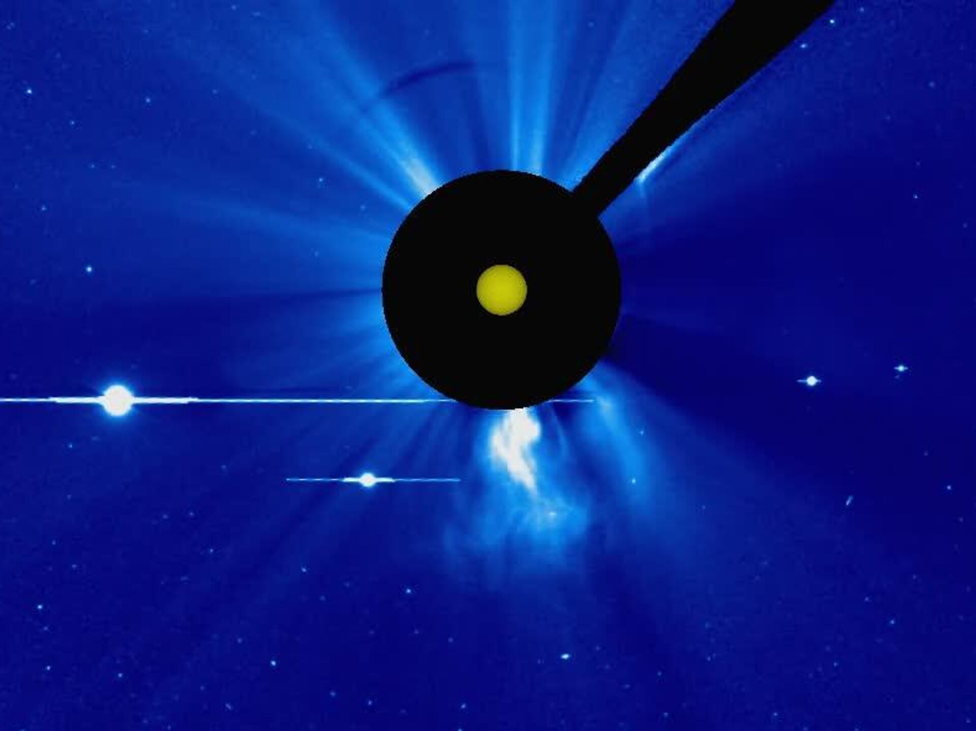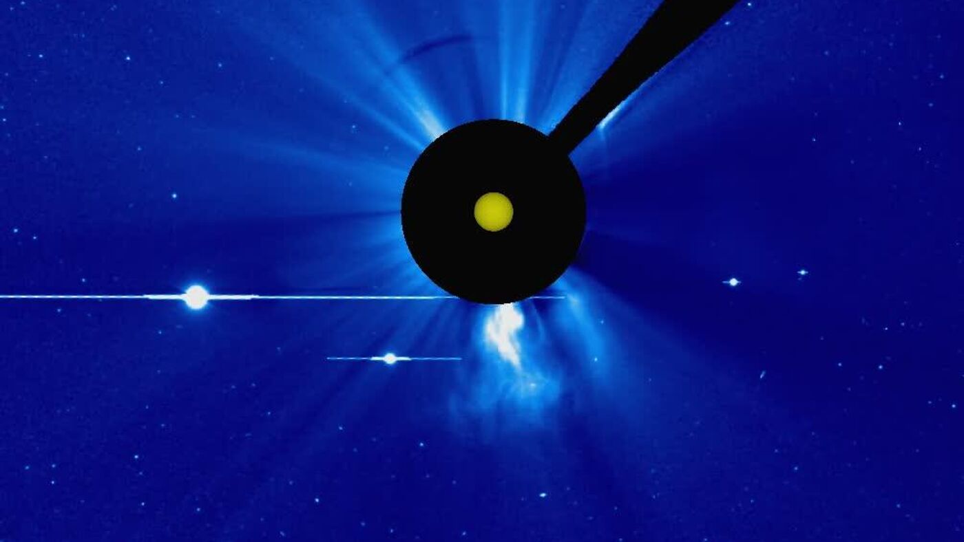 ◼ هر سه سیاره هنوز در نزدیکی خورشید قابل مشاهده هستند. در سوی چپ، زهره و عطارد قرار دارند. در سمت راست، مریخ پرتوهای پسین خود را به سوی آنها میفرستد. در واقعیت، تأثیر بر دو سیاره نخست یک خطای دید است. هر دو جرم در حال حاضر در پشت خورشید و در سوی مخالف زمین قرار دارند، در حالی که ابرهای پلاسمایی به طور محسوسی کنار رفتهاند.