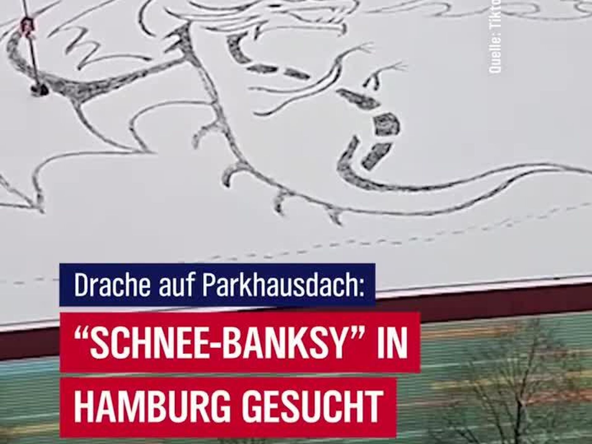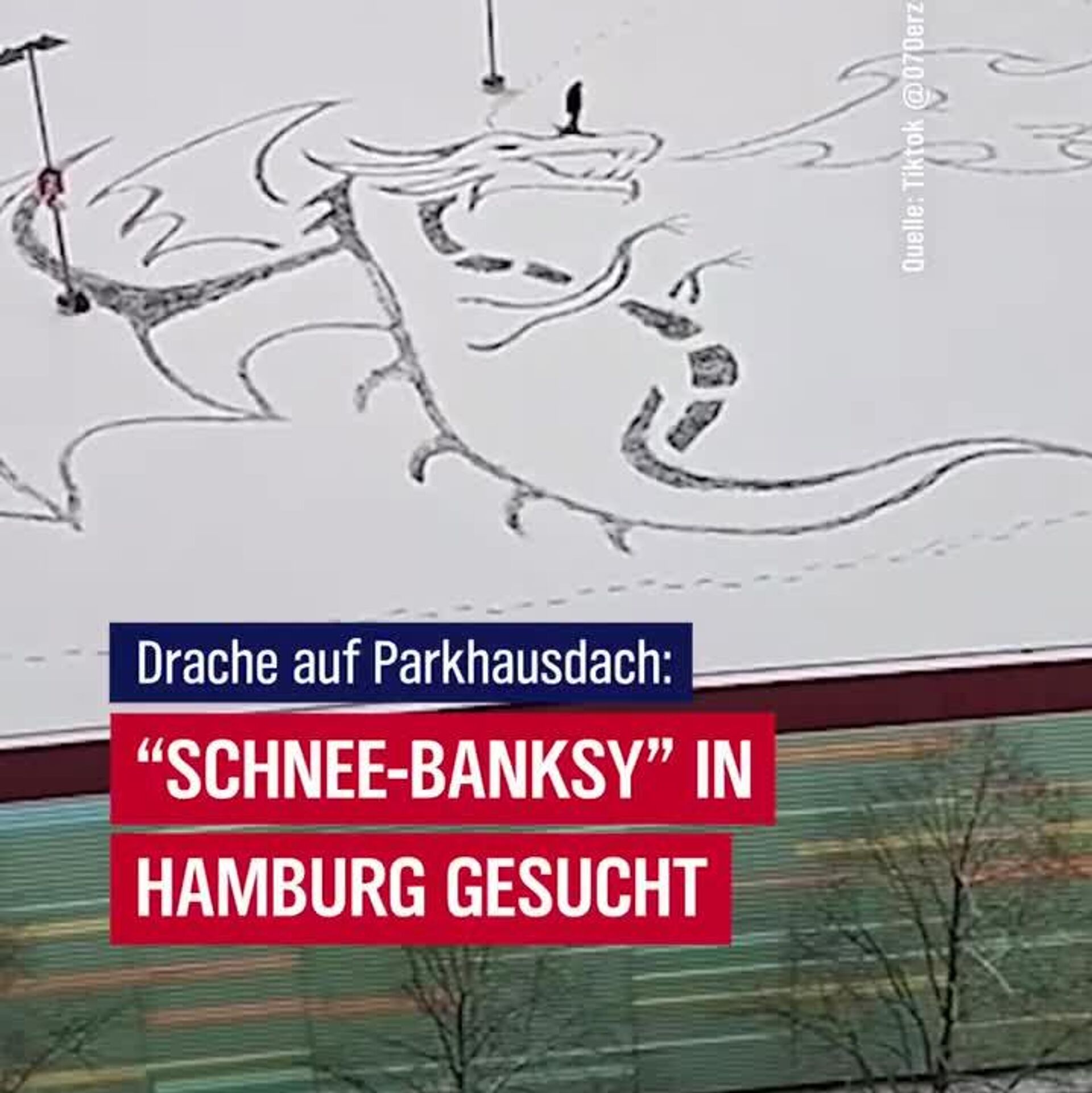 در شهر هامبورگ، پولیس در جستوجوی فردی ناشناس است که روی پشتبام مرکز خرید بزرگی — که به عنوان پارکینگ نیز کار گرفته میشود — با گامهای حسابشده و دقیق، طرح یک اژدها را روی برف پدیدار کرده است. این رویداد که رسانهها آن را کارِ «بنکسی برفی» نامیدهاند، توجه بسیاری را به خود جلب کرده است.
