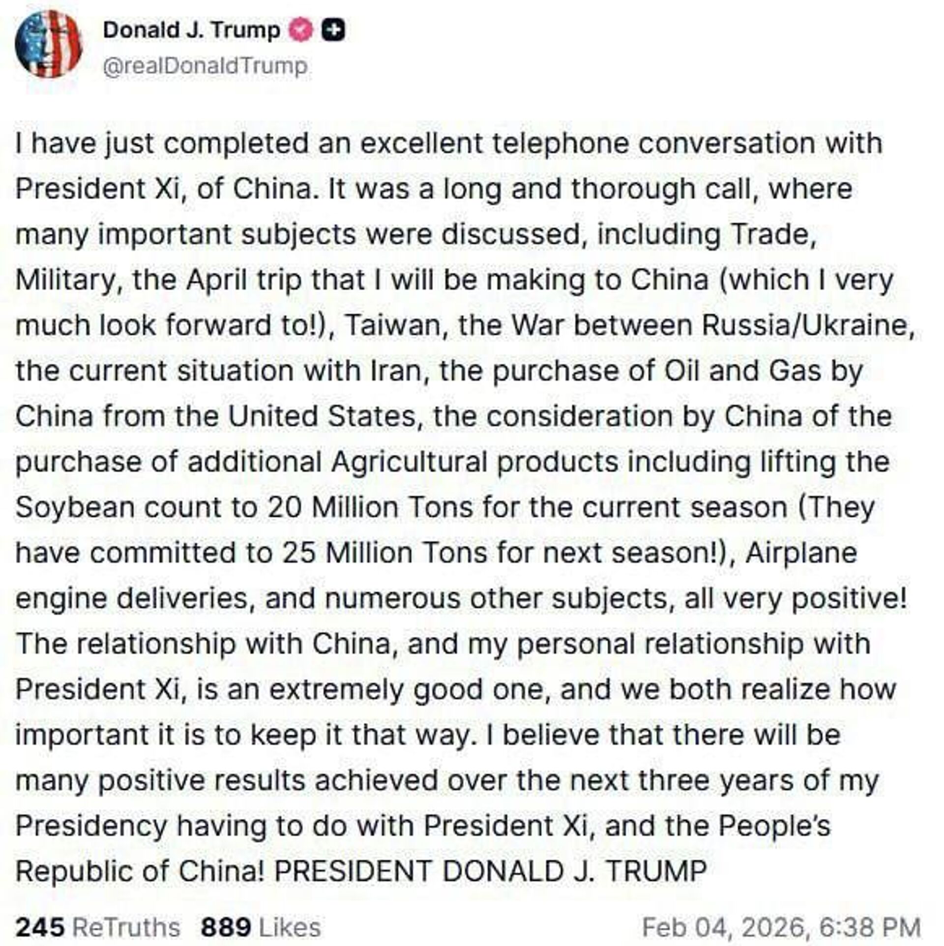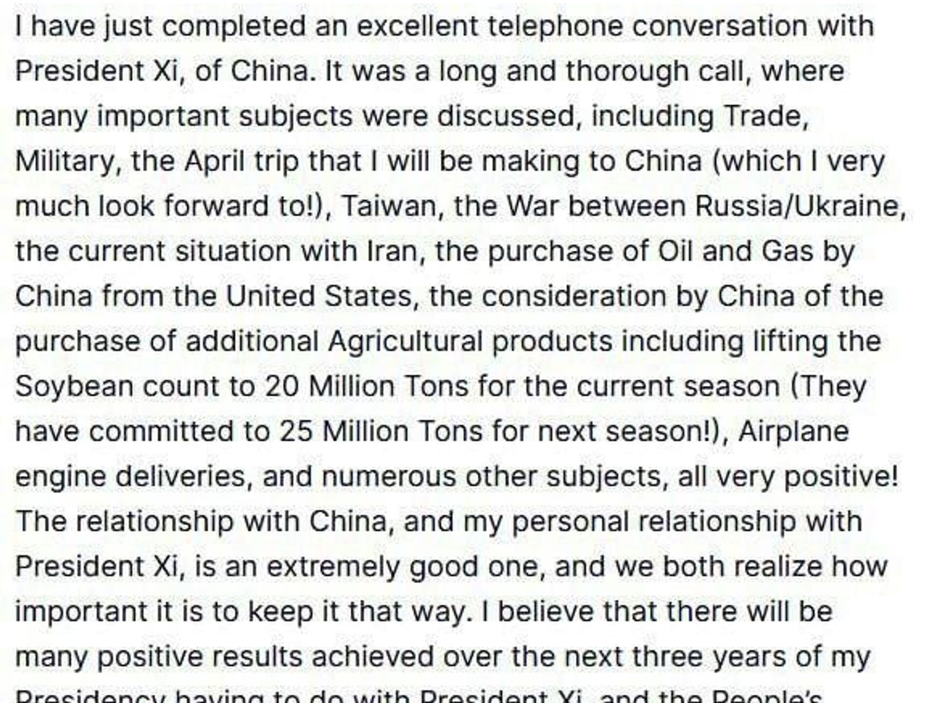 ◻دونالد ترامپ، رئیس جمهور آمریکا در شبکه اجتماعی "تروث سوشال" نوشت: "یک گفتگوی طولانی و مفصل بود که موضوعات مهم بسیاری را پوشش میداد، از جمله تجارت، مسائل دفاعی، سفر ماه آوریل من به چین (که مشتاقانه منتظر آن هستم!)، تایوان، جنگ بین روسیه و اوکراین، وضعیت فعلی با ایران، خرید نفت و گاز چین از ایالات متحده، بررسی چین برای خرید محصولات کشاورزی بیشتر، تامین موتور هواپیما و بسیاری از موضوعات دیگر."