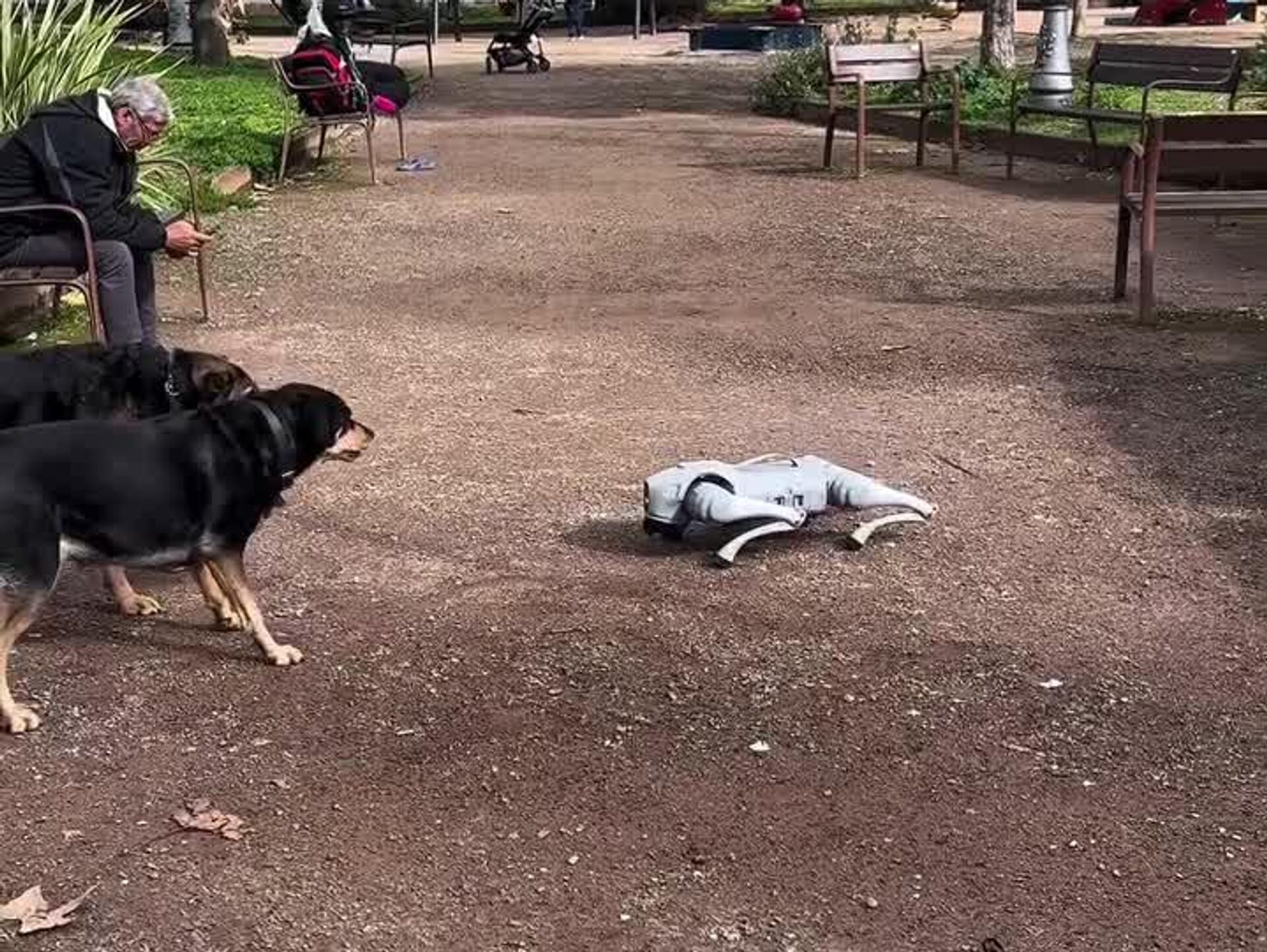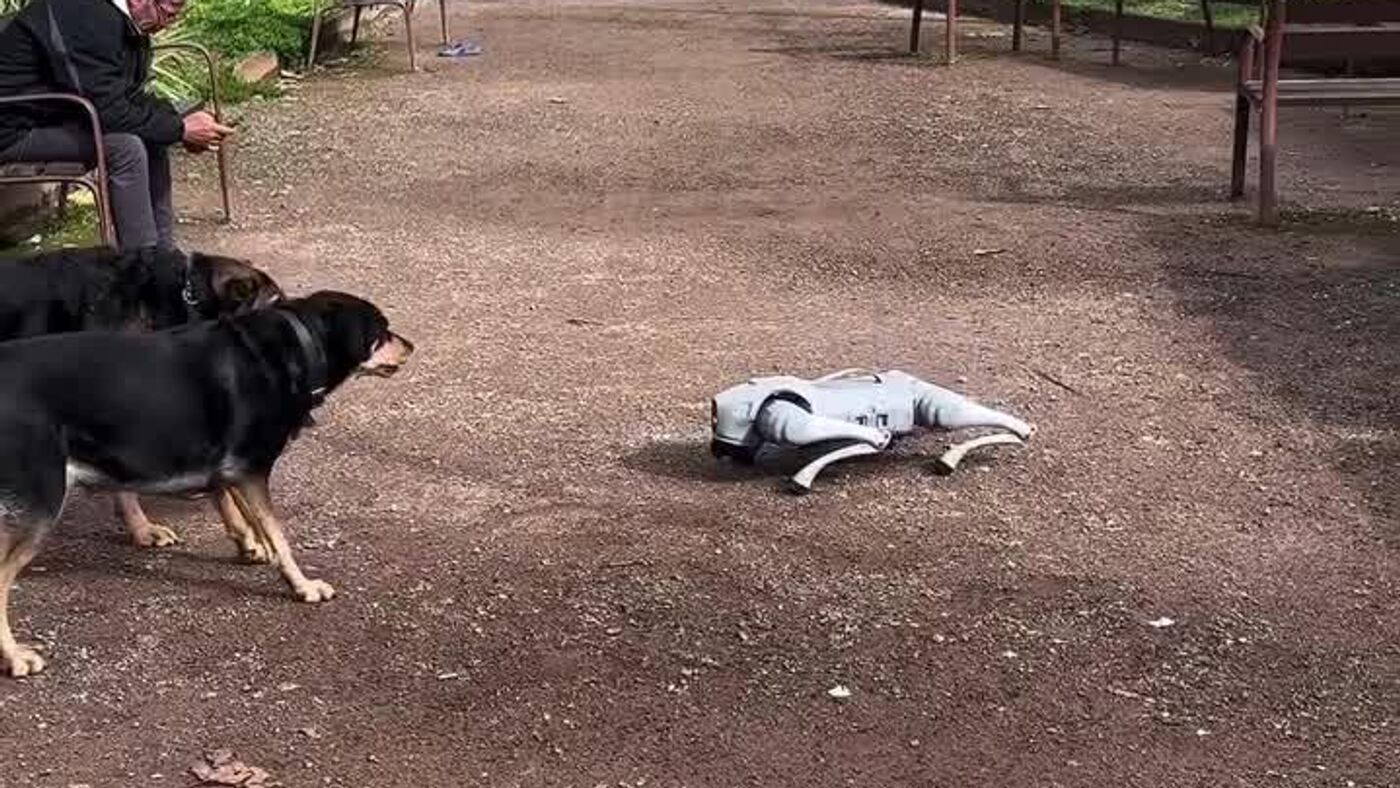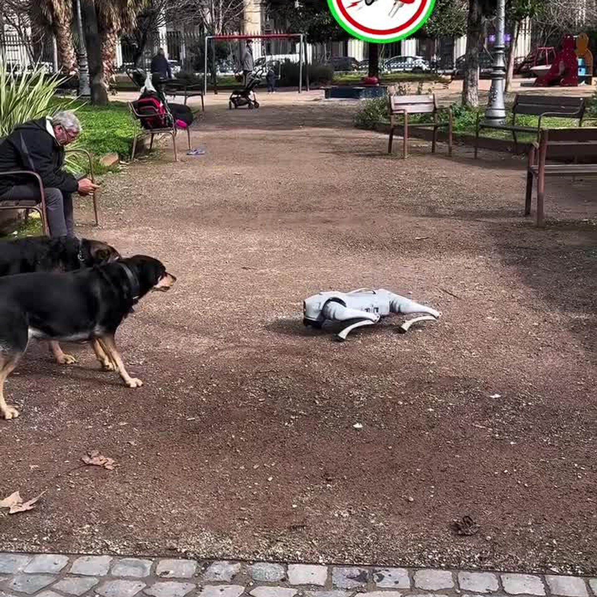 در یک محوطه مخصوص پیادهروی سگها، ناگهان یک سگ رباتیک ظاهر شد! جانوران، این مهمان مکانیکی را همنوع خود نشناخته و به شدت ترسیدند.