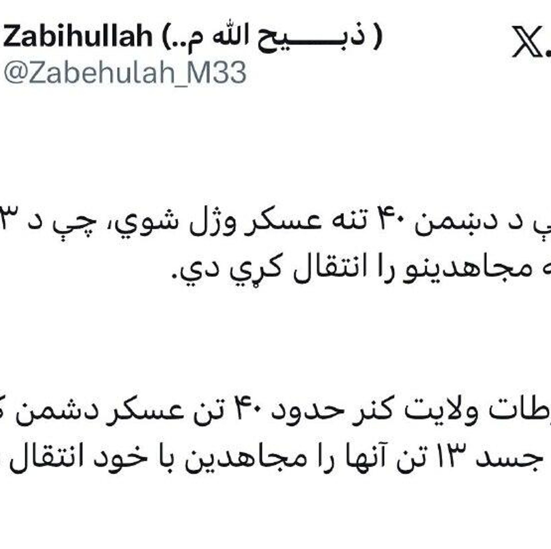 ذبیحالله مجاهد، سخنگوی امارت اسلامی در ایکس اعلام کرد که حدود ۴۰تن از نیروهای پاکستان در ولایت کنر در نتیجه عملیات نیروهای امارت اسلامی کشته شدهاند.