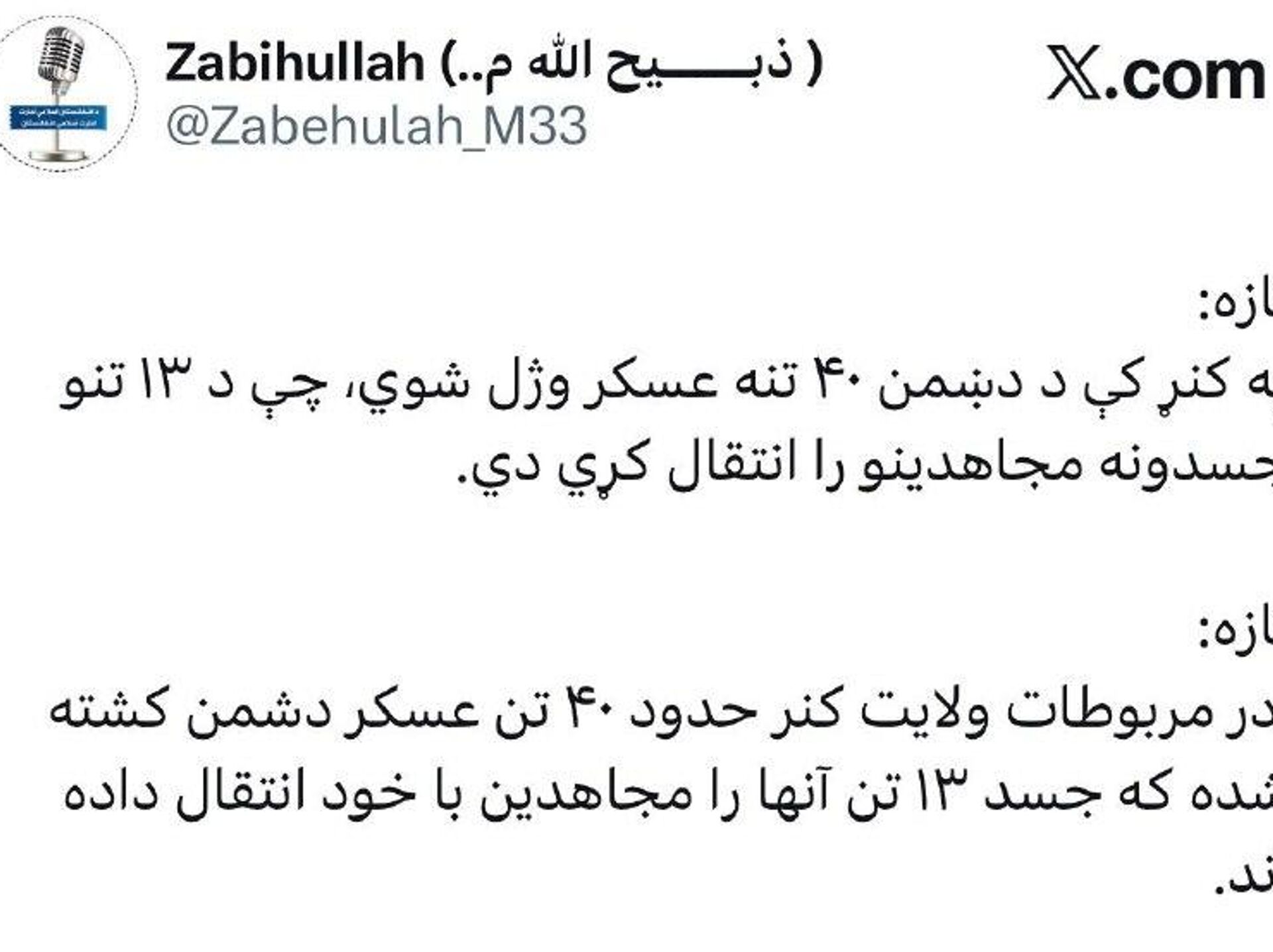 🟠 ذبیحالله مجاهد، سخنگوی رسمی امارت اسلامی افغانستان، در خبرنامهای که در حساب کاربری رسمی خود اعلام کرده که در جریان درگیریهای مرزی در ولایت کنر، نزدیک به ۴۰ سرباز پاکستانی کشته شدهاند و اجساد ۱۳ نفر از آنان توسط نیروهای امارت اسلامی انتقال داده شده است.