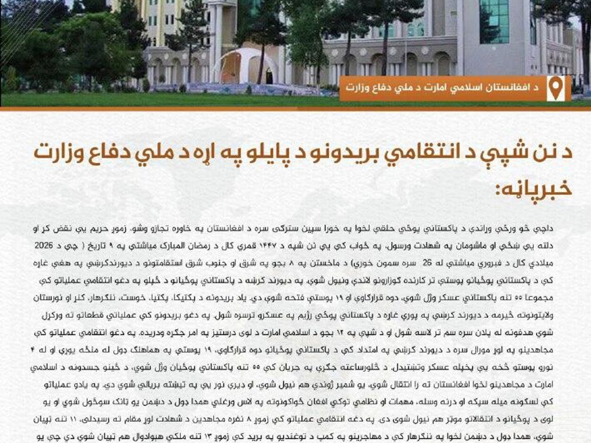◻گفتنی است نیروهای امارت اسلامی افغانستان در واکنش به «تجاوز بیشرمانه رژیم نظامی پاکستان به خاک افغانستان که منجر به مرگ زنان و کودکان بیگناه شده است»، شبانه «حملات قاطع» را علیه پاکستان انجام داد.