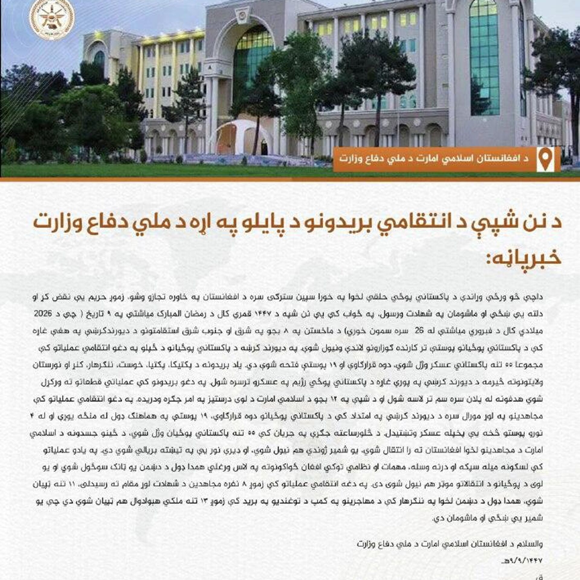 وزارت دفاع افغانستان پایان عملیات نظامی انتقامی علیه پاکستان را اعلام کرد